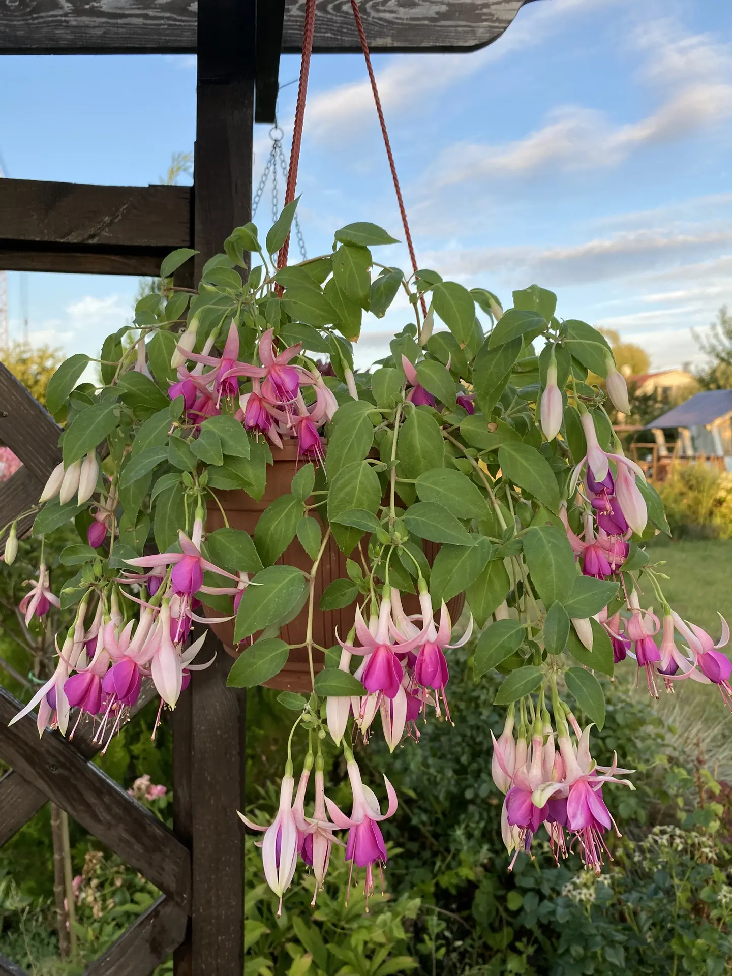Полуампельный сорт с крупными махровыми цветами. Имеет хорошую силу роста, без проблем укореняется, обильно цветет. Неплохо выдерживает жару, но как и любую фуксию нужно беречь от прямых солнечных лучей в дневное время. На мой взгляд сорт неприхотливый и подходит для новичков.