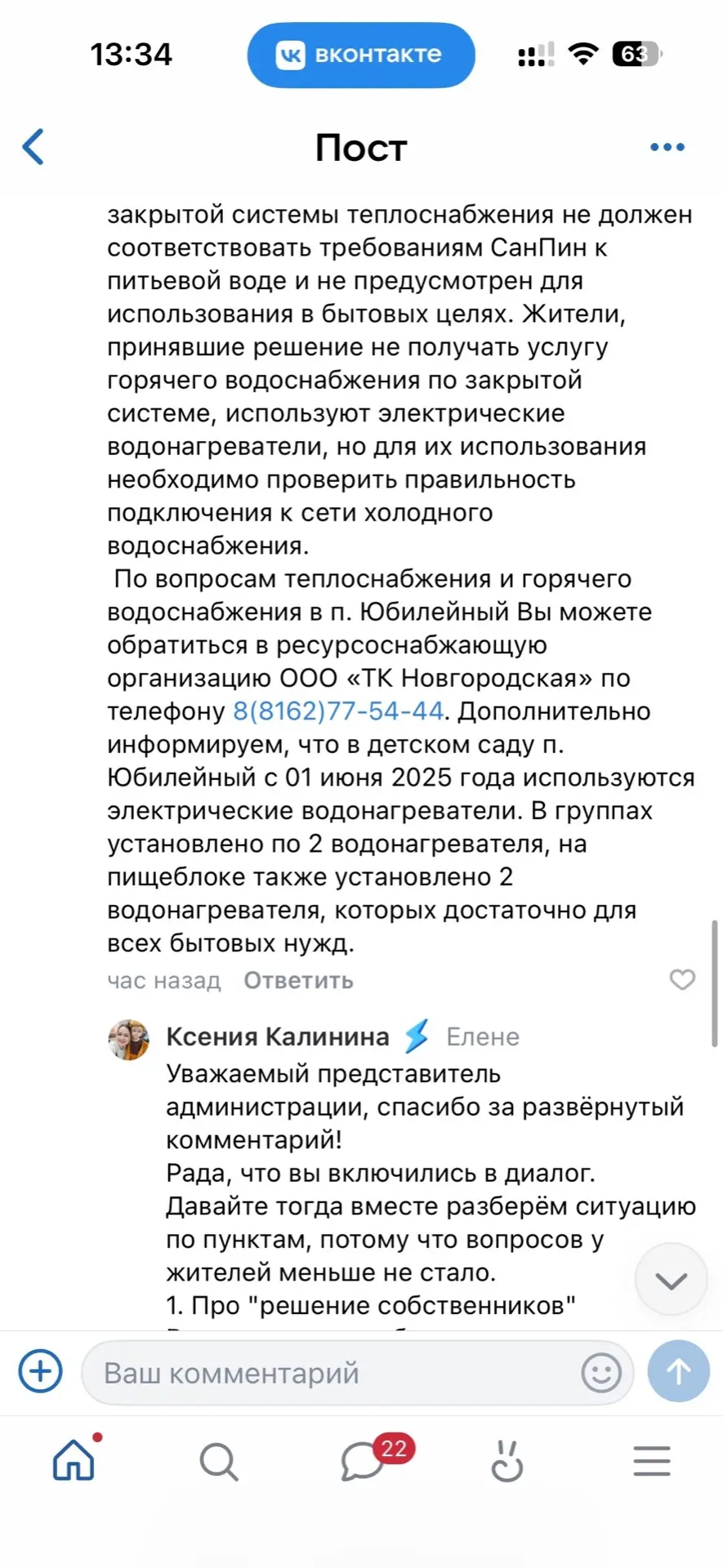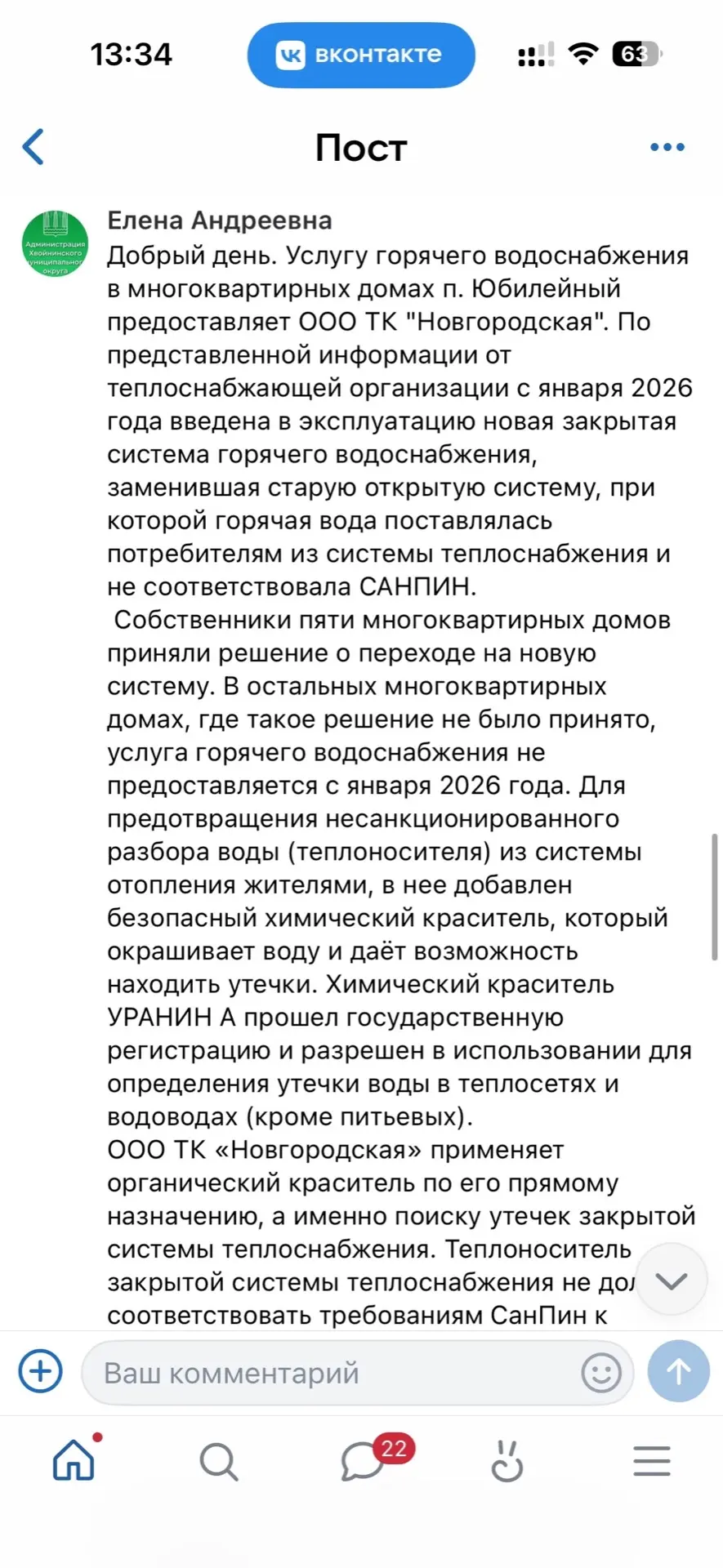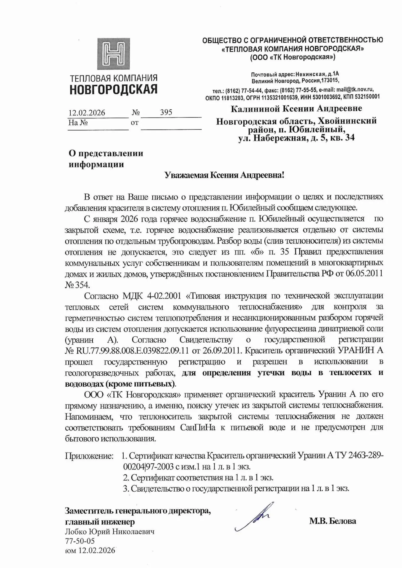 - Компания «ТК Новгородская» в официальном ответе (№ 395 от 12.02.2026) ПРИЗНАЛА, что горячей воды у «остальных объектов» нет.
