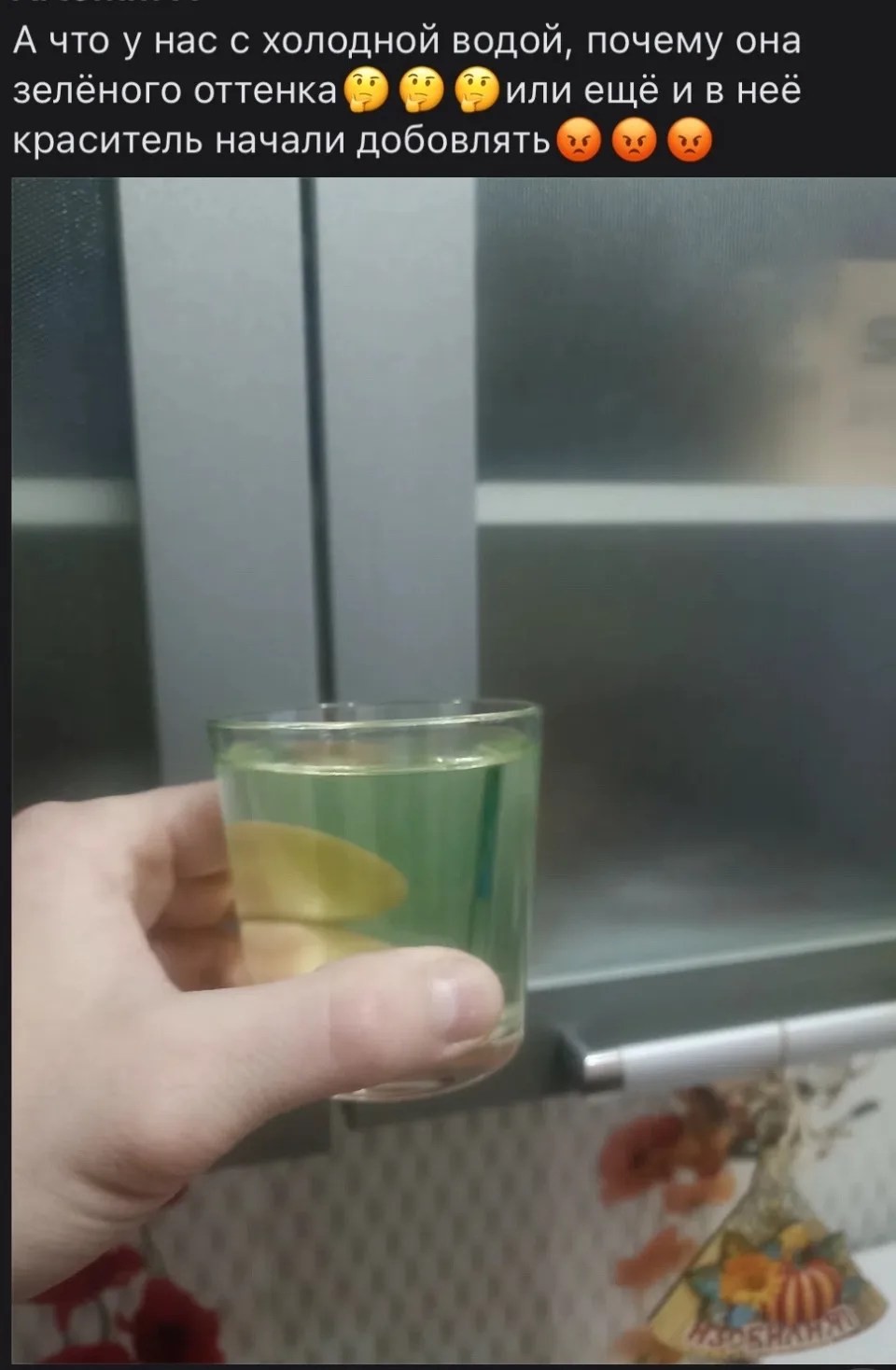 А теперь самое страшное. Краситель, который залили в горячую воду для давления на нас, попал в систему ХОЛОДНОГО ПИТЬЕВОГО водоснабжения! 16 февраля из кранов с холодной водой, которую мы пьём, готовим еду и даём детям, потекла ЗЕЛЁНАЯ жидкость. Химия — в нашей питьевой воде!