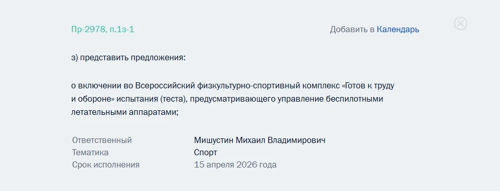 Владимир Путин поручил правительству http://www.kremlin.ru/acts/assignments/orders/78857 разработать предложения по включению управления беспилотными летательными аппаратами (БЛА) в программу Всероссийского физкультурно-спортивного комплекса ГТО. Ответственным за выполнение задачи назначен Михаил Мишустин, а срок исполнения установлен на 15 апреля 2026 года.