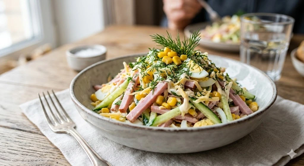 👩🍳Как готовить: Нарежьте ветчину, огурцы и очищенные яйца тонкой соломкой. Сыр натрите на крупной терке, чтобы он создавал объем. В глубокой миске соедините все ингредиенты, добавьте кукурузу (предварительно слив лишнюю жидкость). Заправьте соусом, тщательно перемешайте и щедро посыпьте мелко нарубленным укропом, будто припорошило снегом.
