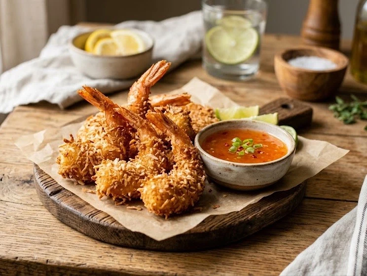 👩🍳 Как готовить: Креветки очистите от панциря, оставив хвостики, удалите кишечную вену и сбрызните лимонным соком. В одной миске смешайте кокосовую стружку с сухарями, в другой взбейте яйцо, а в третью насыпьте муку. Каждую креветку обваляйте в муке, окуните в яйцо и плотно запанируйте в кокосовой смеси. Обжаривайте на разогретой сковороде с маслом по 2 минуты с каждой стороны до золотистой корочки. Подавайте горячими с кисло-сладким соусом.