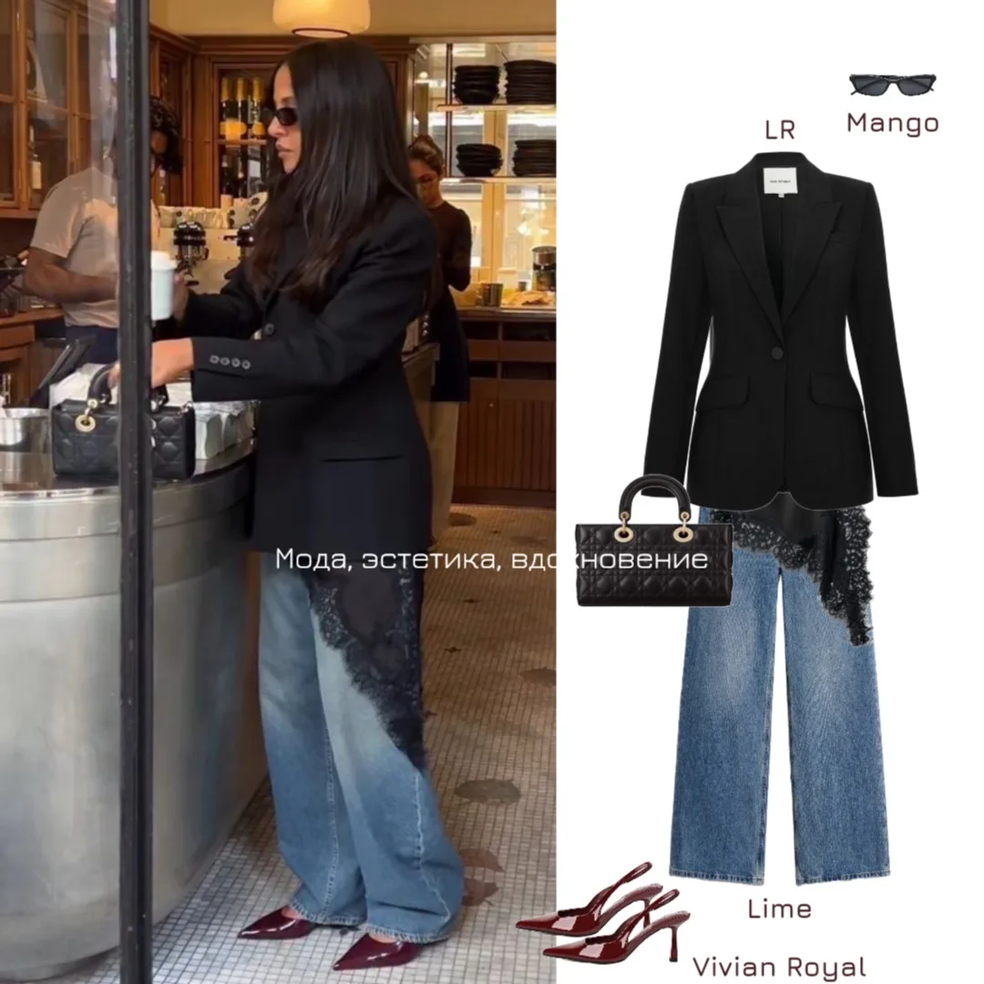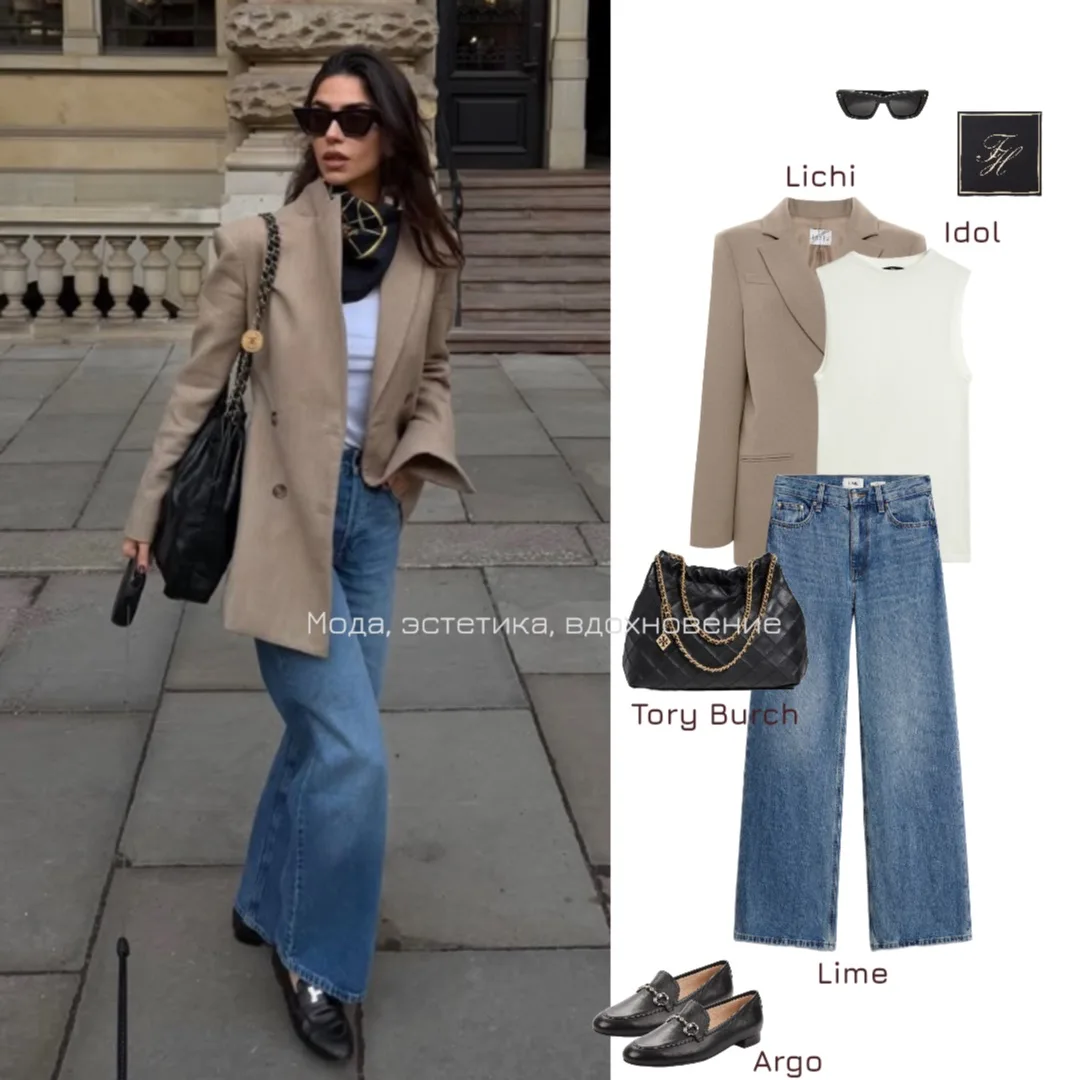 Жакет, жакет, топ, топ, джинсы, туфли, туфли, очки, сумка, сумка