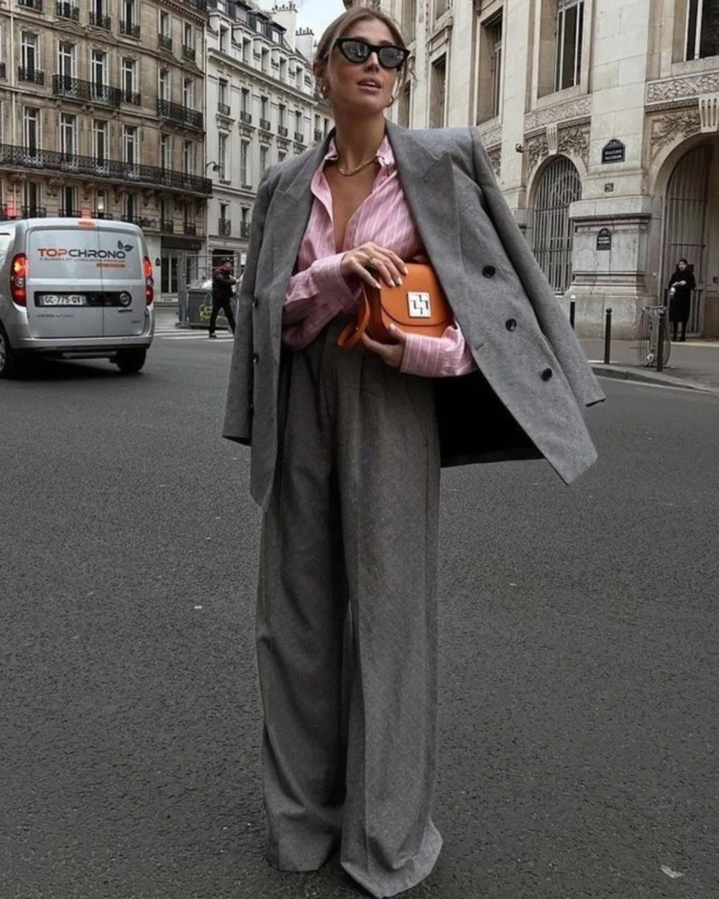 Пальто, рубашка, топ, брюки, очки, сумка, туфли
