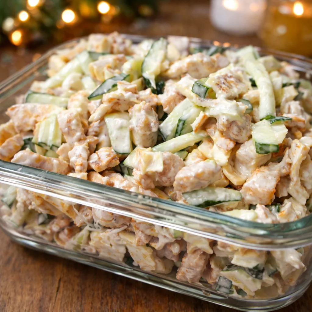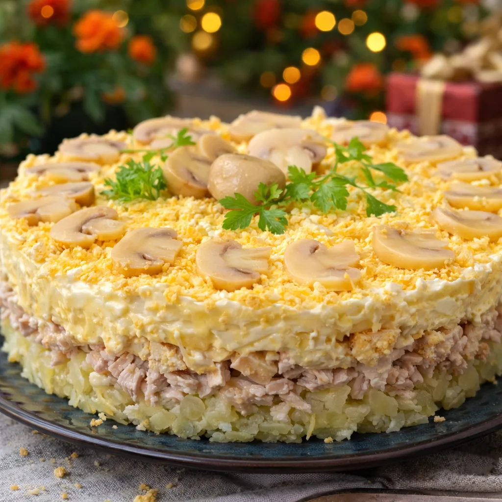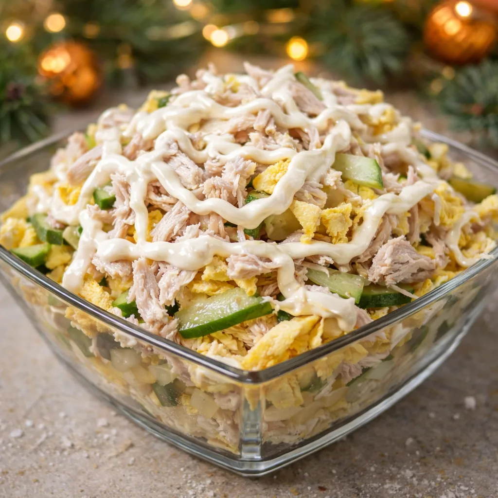 Сегодня предлагаю вам подробный рецепт праздничного салата «Курица под снегом». Попробовала его совсем недавно — и он сразу вошёл в число любимых. Салат получается очень нежным, гармоничным по вкусу, а выглядит действительно как маленький «сугроб» — идеально для зимних праздников и особенно для Новогоднего стола.