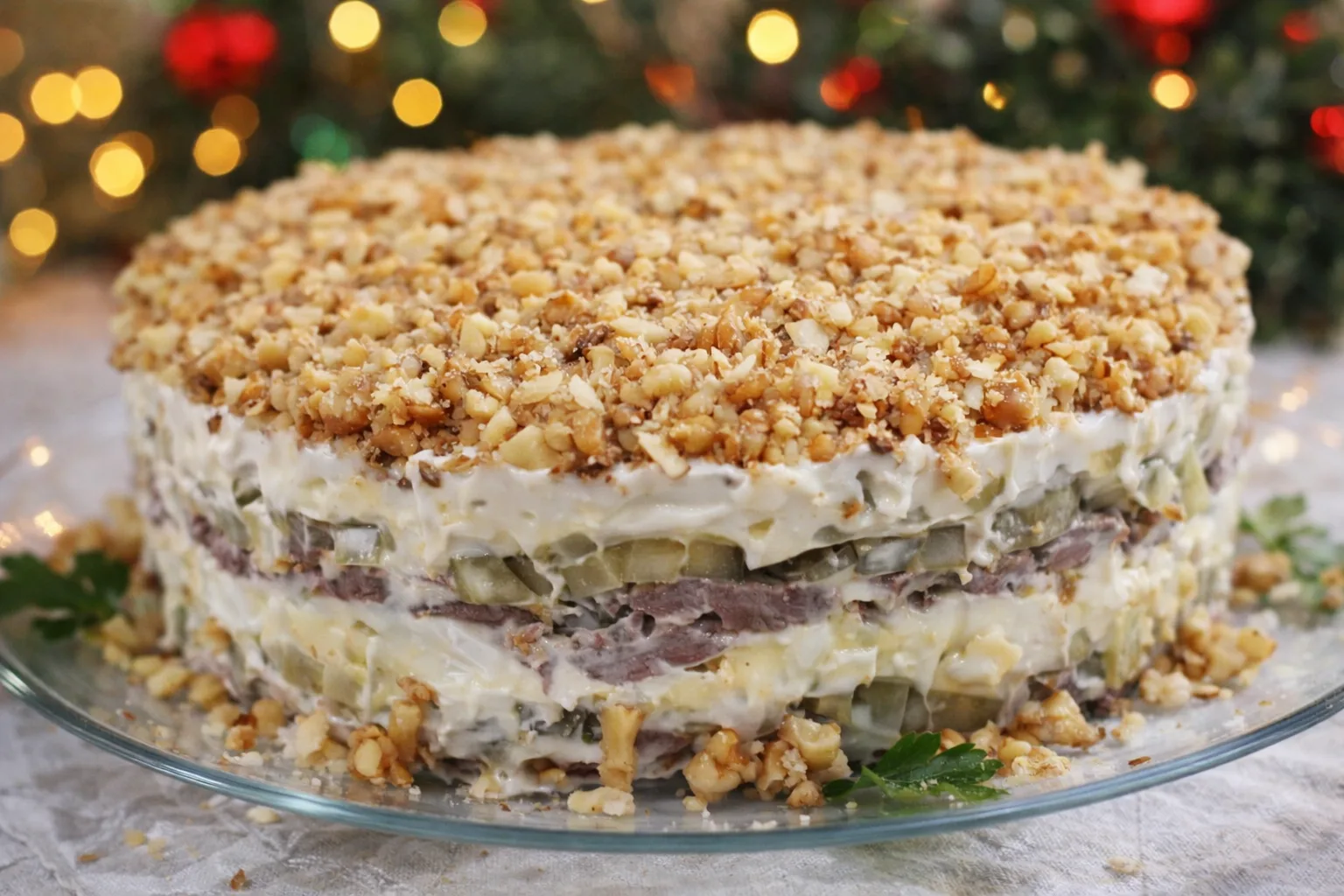 Сытный слоёный салат с минимальным набором продуктов. Готовится без сложных техник, хорошо подходит для повседневного и праздничного стола. Вкус насыщенный за счёт сочетания мяса, маринованных огурцов, яиц и грецких орехов.