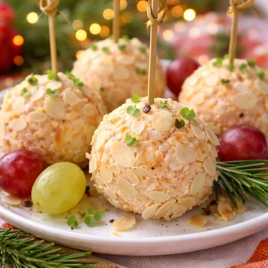 Готовые шарики обваливают в миндальной стружке (при желании можно заменить фисташками или кунжутом). В каждый шарик вставляют шпажку, стараясь зафиксировать её в начинке. Перед подачей закуску украшают по вкусу, например микрозеленью.