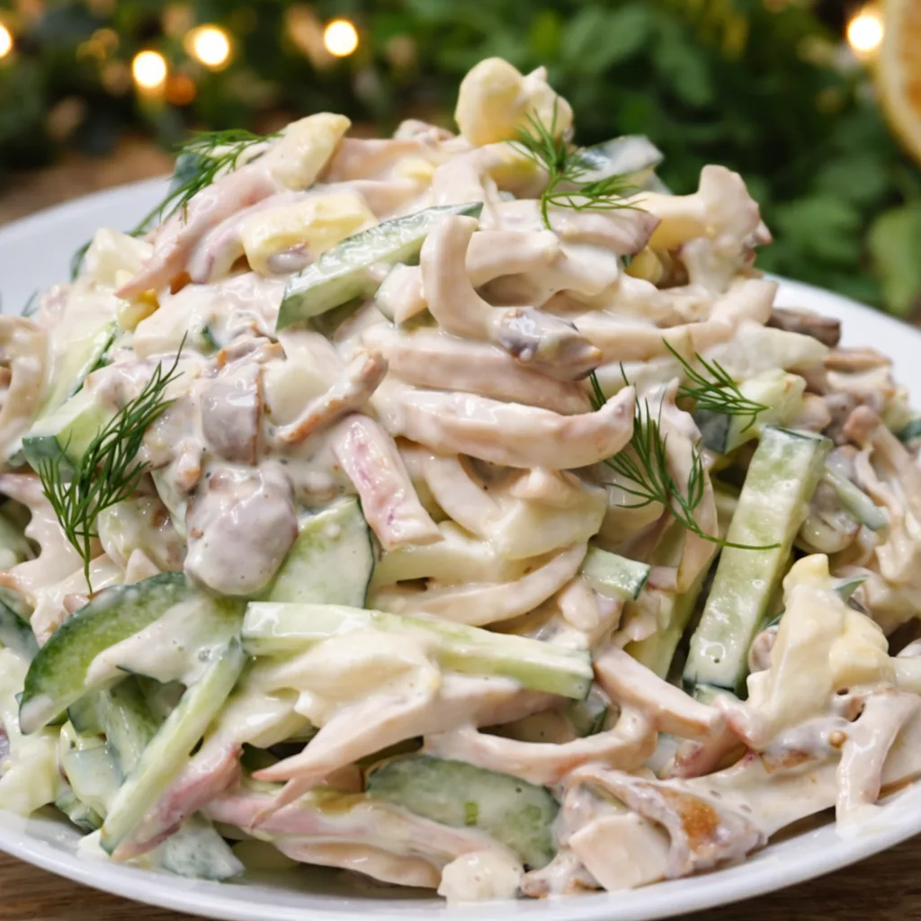 Салат с кальмарами отличается нежной текстурой и сбалансированным вкусом. Он получается сочным, лёгким и хорошо подходит как для повседневного меню, так и для праздничного стола.