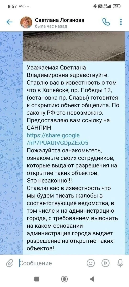 Известно, что один из таких объектов уже начинает свою работу на проспекте Победы, дом 12 (ост. «Пр. Славы»). Просим Роспотребнадзор, прокуратуру, администрацию города и иные уполномоченные органы провести проверку по данному адресу, установить законность размещения объекта, наличие необходимых коммуникаций, условий для соблюдения санитарных норм и дать официальную правовую оценку.