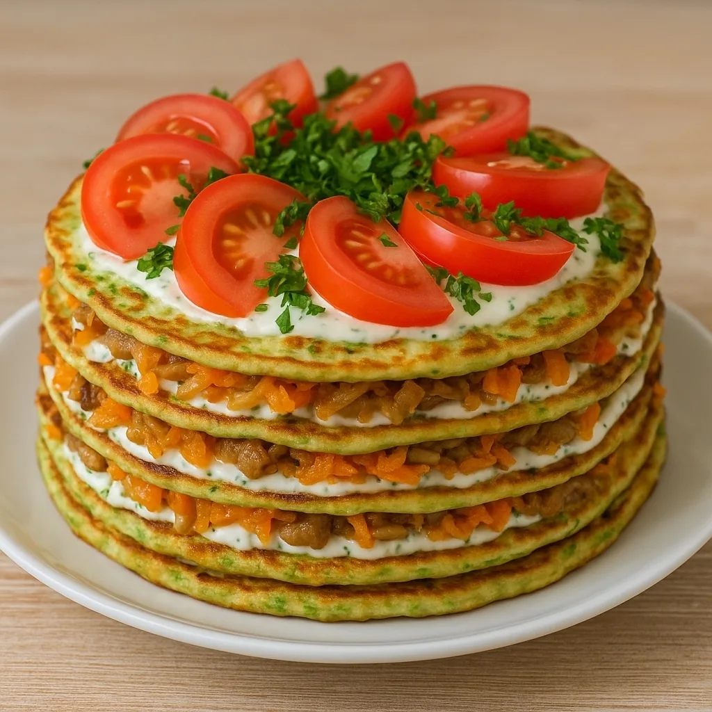 Очень вкусное и необычное блюдо из самых простых ингредиентов. Нежные кабачковые блинчики, сочная овощная начинка и лёгкий соус делают этот торт не только аппетитным, но и полезным.