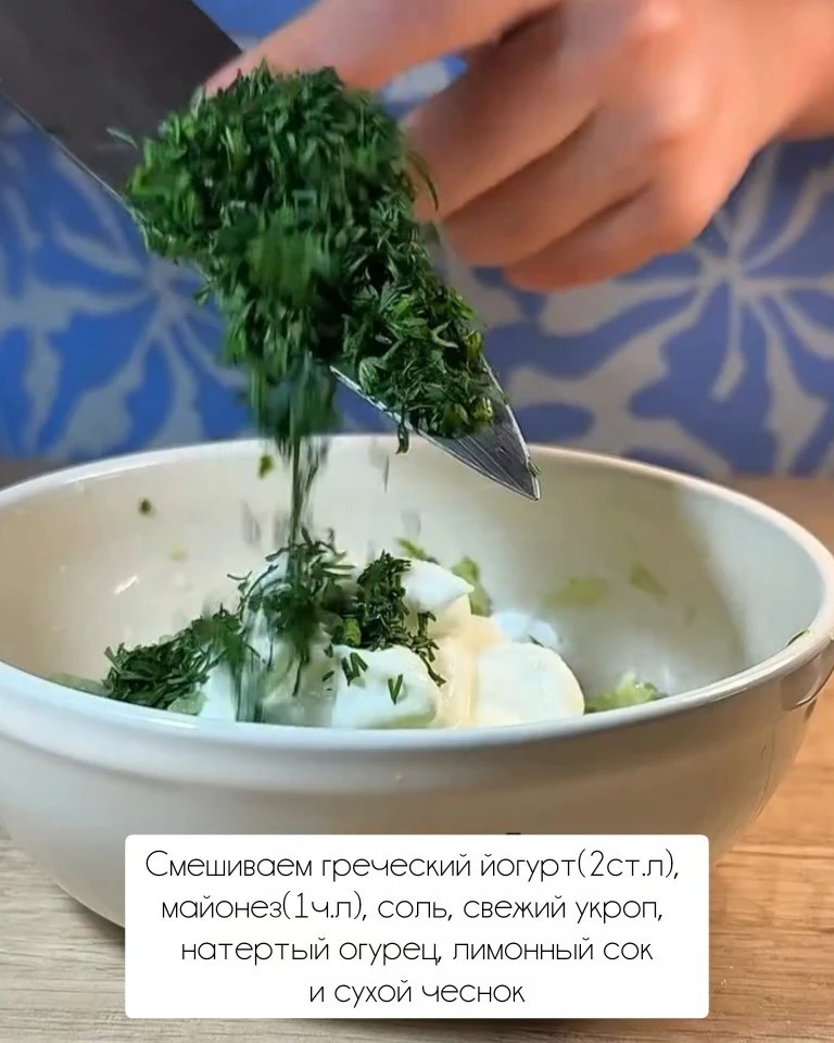 5. Для соуса соедините майонез со сметаной, добавьте зелень.