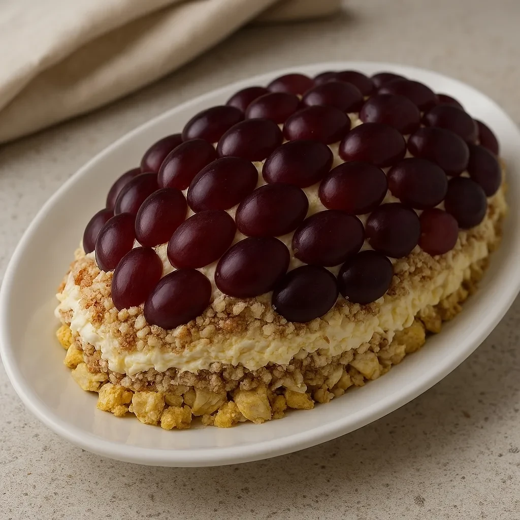 Этот салат не только вкусный и сытный, но и выглядит очень эффектно — в форме виноградной грозди. Он прекрасно подойдёт для праздничного стола и точно удивит гостей.