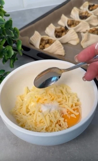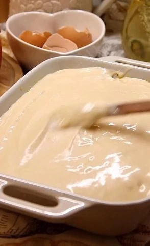 4⃣ Залейте всё яично-молочной смесью и посыпьте тёртым сыром.