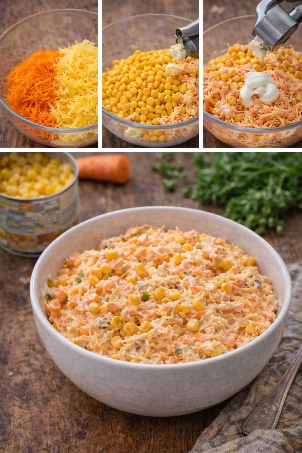 Натрите морковь и сыр, добавьте кукурузу и чеснок. Заправьте майонезом со сметаной, перемешайте — и готово!