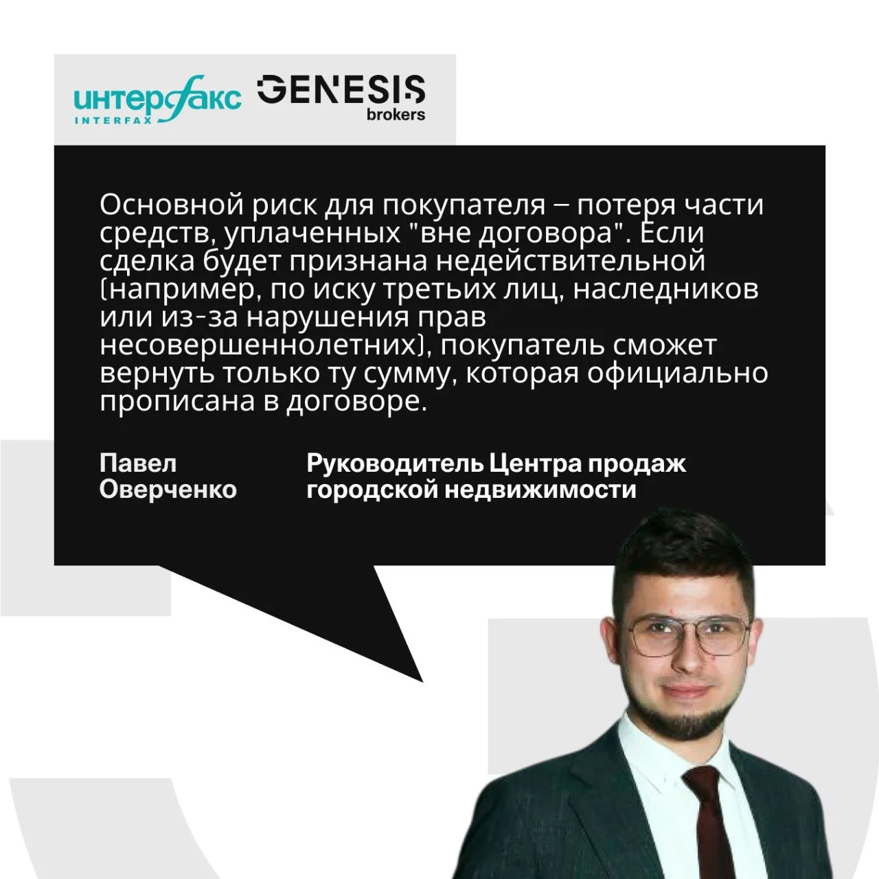 Федеральное информационное агентство “Интерфакс” подготовило материал о "серой схеме" занижения цен в договорах-купли продажи. За экспертным мнением издание обратилось в Genesis Group.