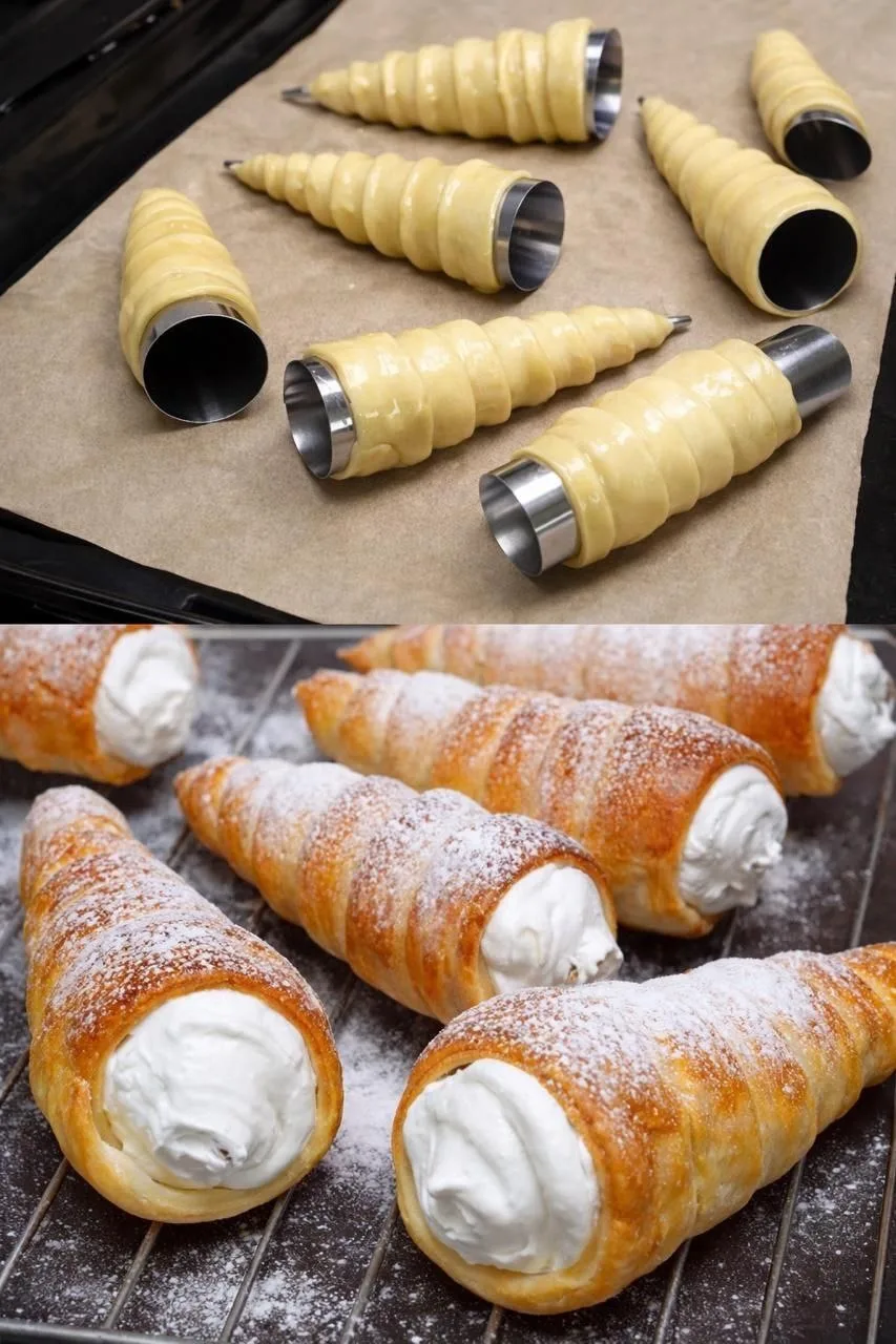 8. Выпекать при 200°C около 15 минут до румяности (ориентируйтесь по своей духовке). Достать, немного остудить и аккуратно снять с конусов, слегка прокручивая.