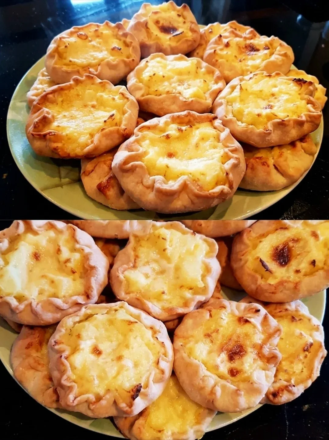 Тесто делим на две равные части, раскатываем толстые круглые лепёшки. Лепешки разделить на 8 треугольников как пиццу.