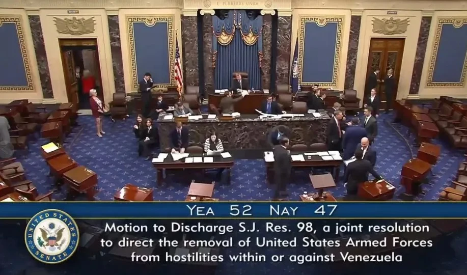 После того, как два сенатора республиканца поменяли своё отношение к резолюции, призванной запретить Трампу применять военную силу "в и против Венесуэлы" без прямого одобрения Конгресса, судьба её повисла на волоске. Сенаторы Джош Хоули и Тодд Янг, подвергшиеся яростной критике Трампа, проголосовали за возражение по порядку ведения против резолюции.