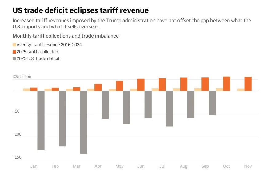 Доходы от тарифов начали расти с апреля 2025 г., тогда же начал снижаться торговый дефицит — примерно со $175 млрд. в месяц до $55 млрд. в месяц. При этом самое большое сокращение импорта пришлось на Китай, в то время как Мексика, Канада и Тайвань, напротив, нарастили поставки в США.