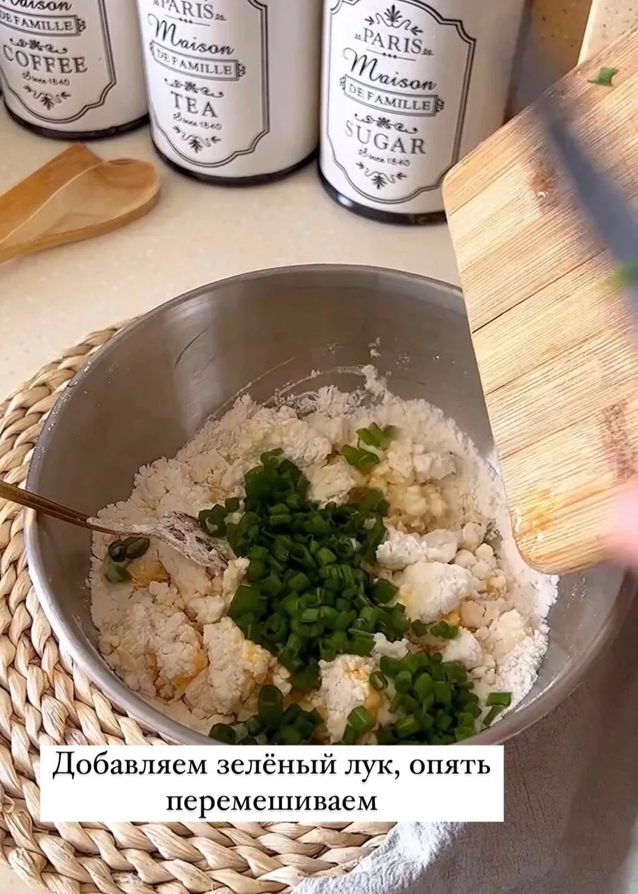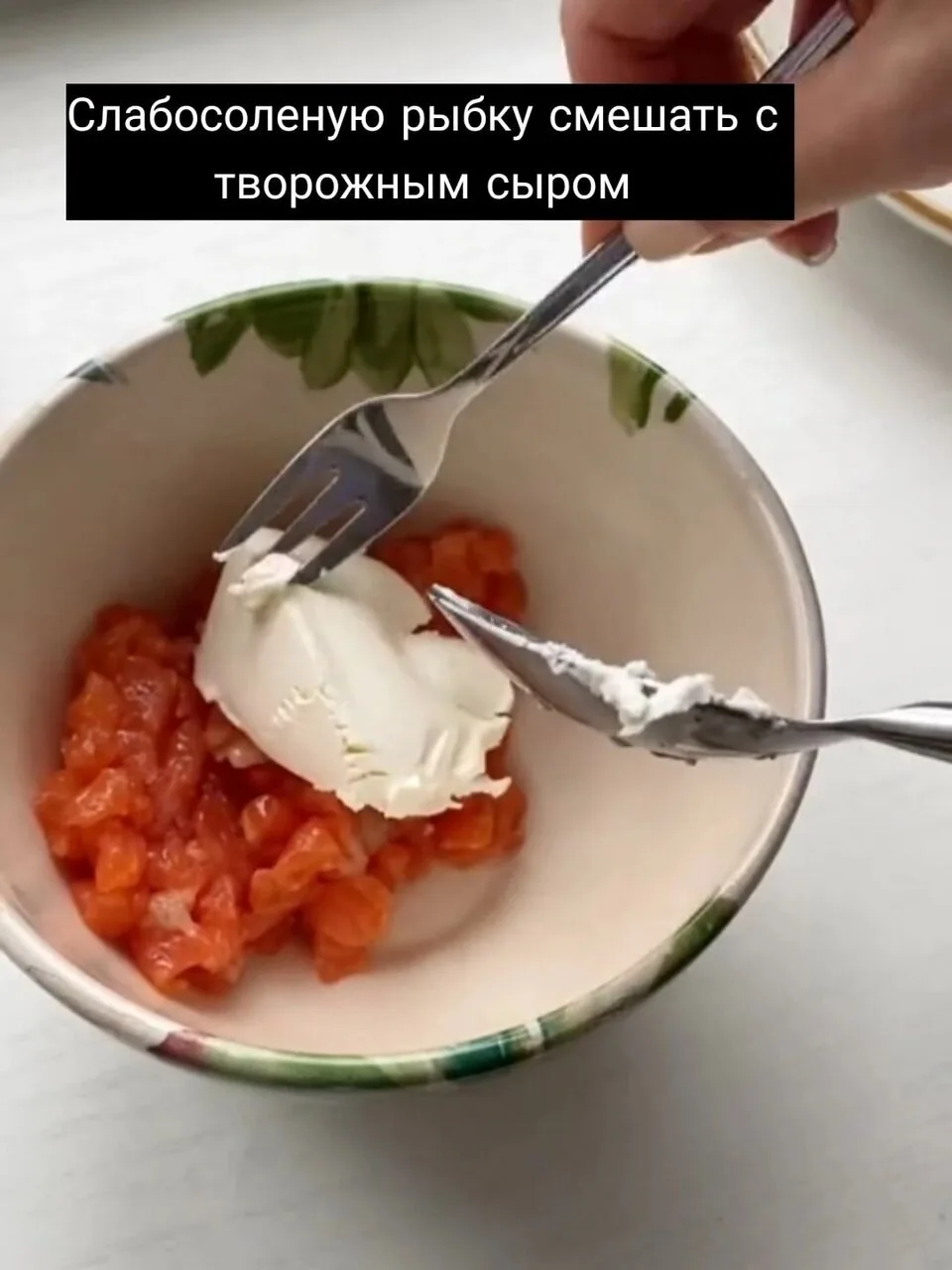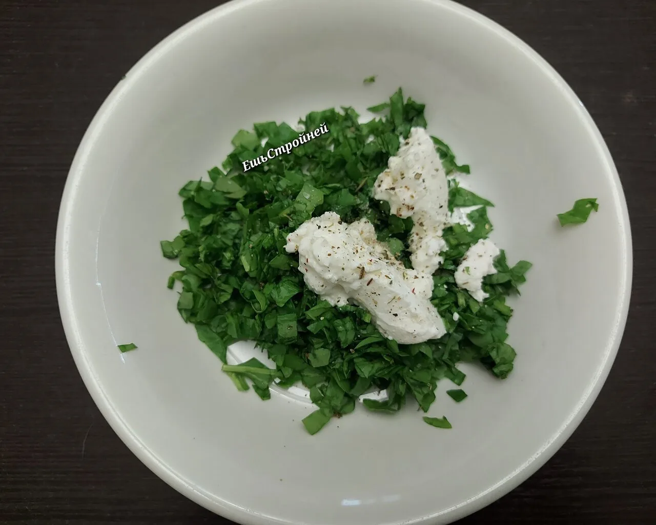 ✅️ Шпинат мелко нарезать. Смешать с 30 гр рикотты. Добавить сушеный чеснок. Перемешать до однородности.