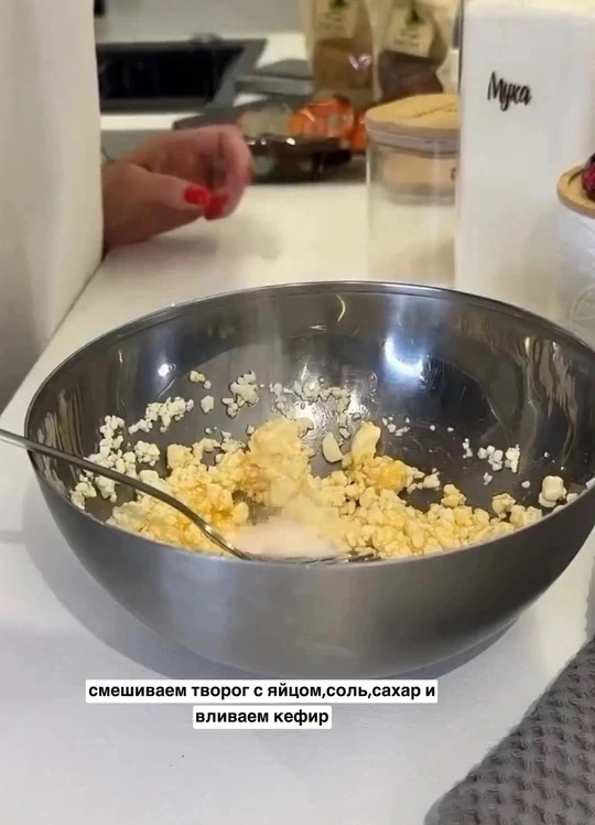 3. Тем временем творог разминаем с помощью вилки с яйцом и подсластителем. Затем добавляем муку и еще раз хорошо перемешиваем.