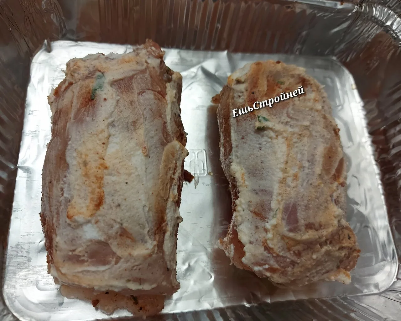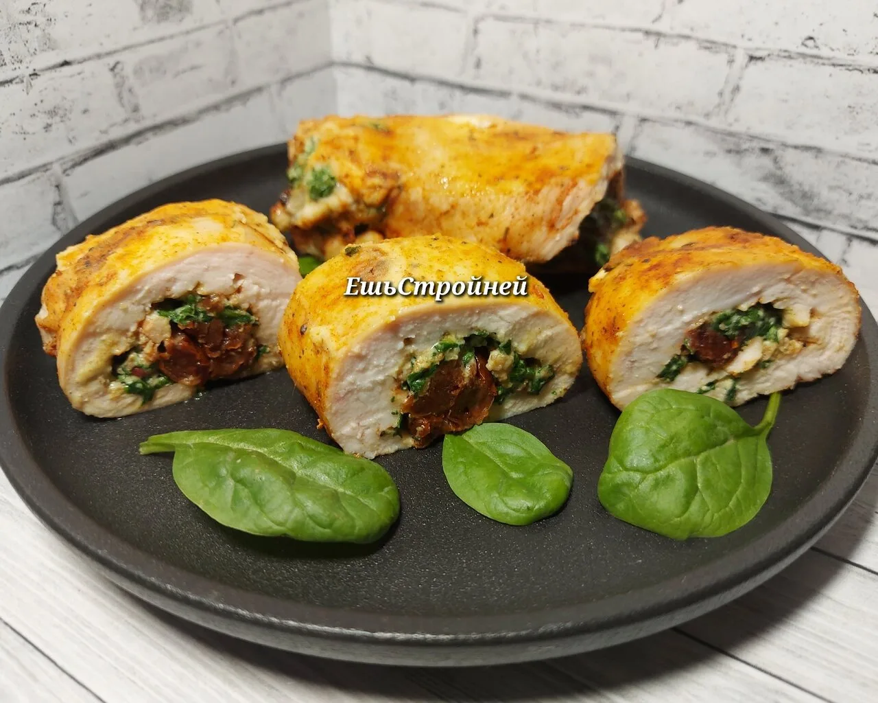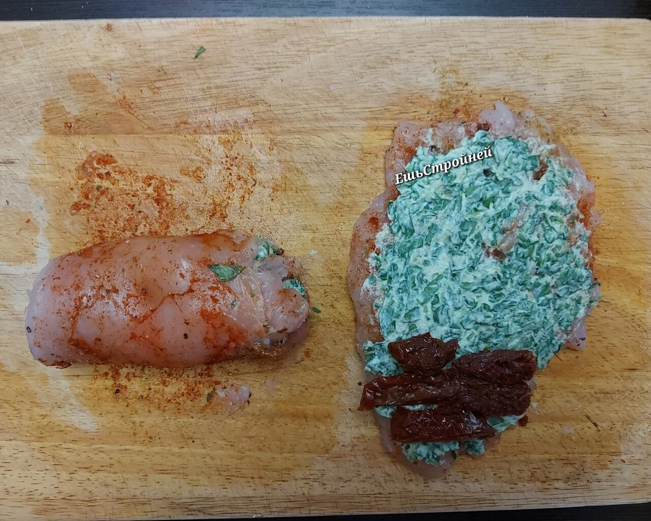 ✅️ Каждый стейк смазать смесью рикотты и шпината. На край выложить вяленные томаты и свернуть рулетиком.