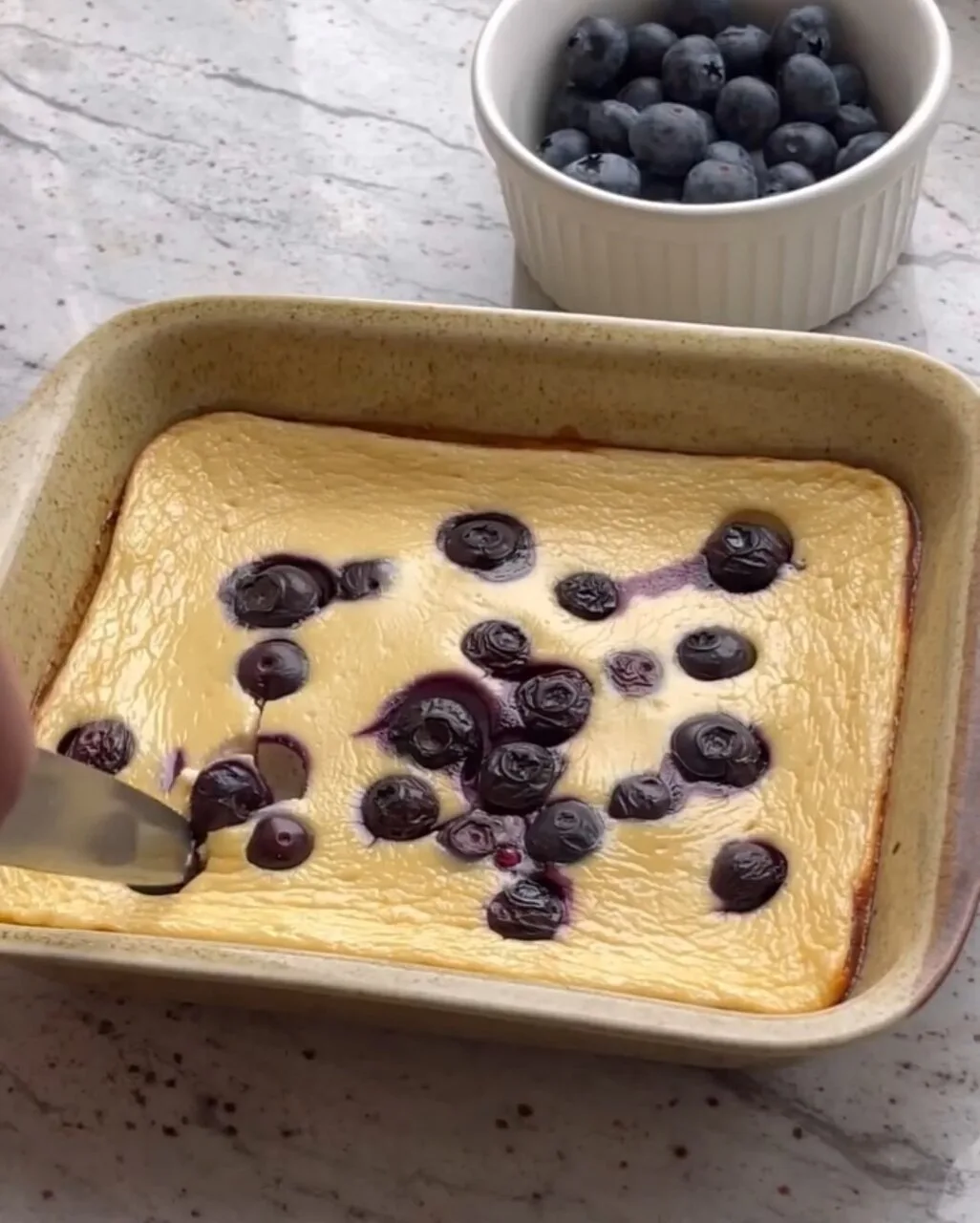 4. Форму застилаем пекарской бумагой (необязательно, но так запеканка не прилипнет к форме), выкладываем в форму творожную массу. По верх творога выкладываем ягоды черной смородины и слегка вдавливаем внутрь. Выпекаем около 35-40 минут.
