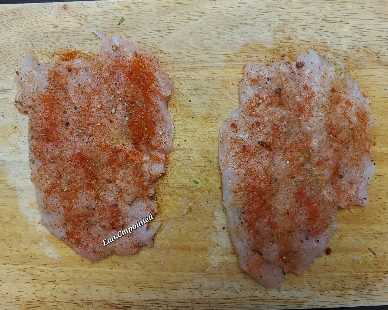 ✅️ Куриное филе разрезать вдоль на два стейка. Слегка отбить, посолить и поперчить по вкусу.