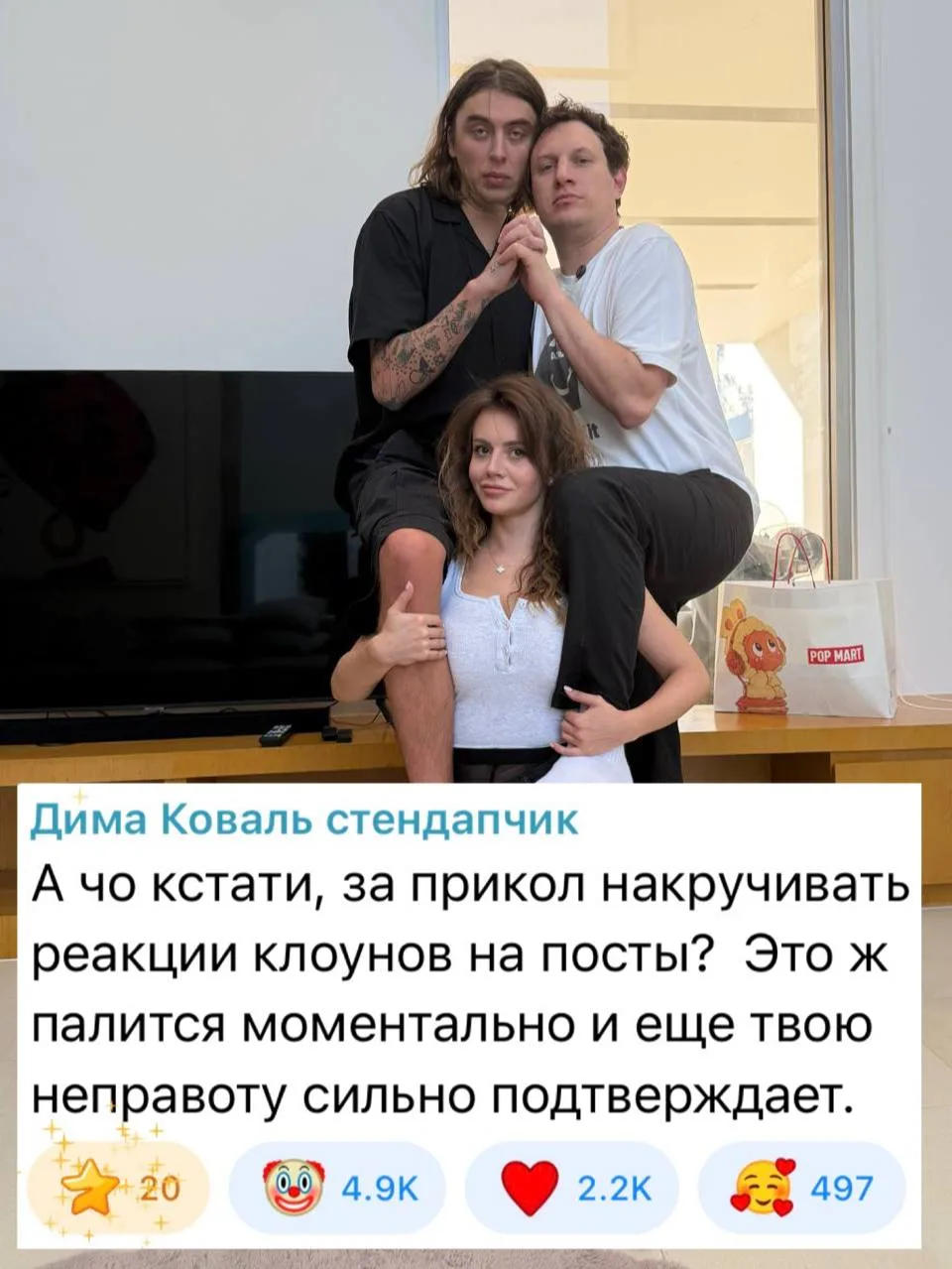 Дело в том, что на пост Сабины с намеком на то, что Клава Кока увела Диму Масленникова из отношений, пользователи накидали очень много реакций с клоунами.