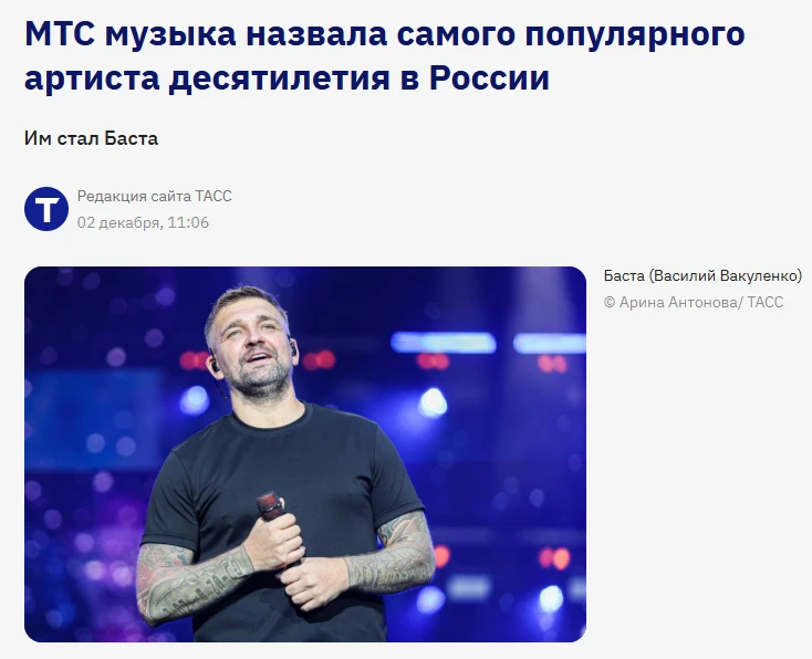 Музыкальный сервис «КИОН Музыка» подвёл итоги с 2016 года — и главным артистом десятилетия стал Баста. Его треки слушали чаще всех за последние десять лет.