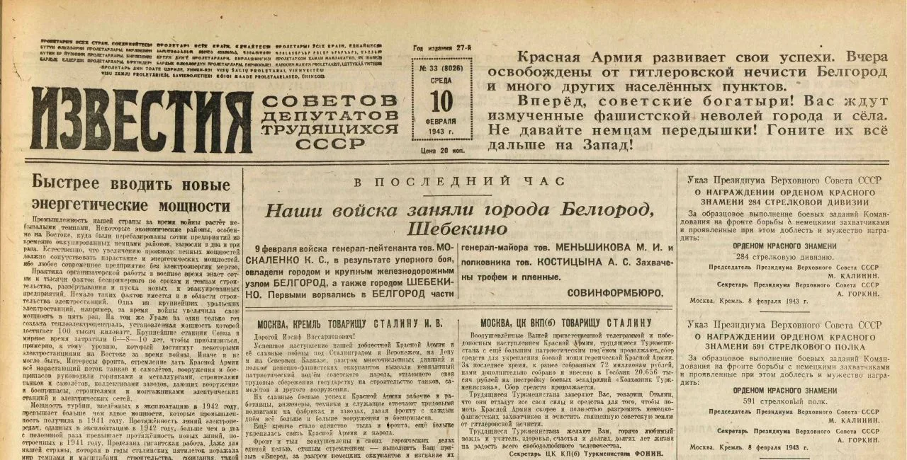 — 9 февраля наши войска в результате упорного боя овладели городом и крупным железнодорожным узлом Белгород, а также городом Шебекино.