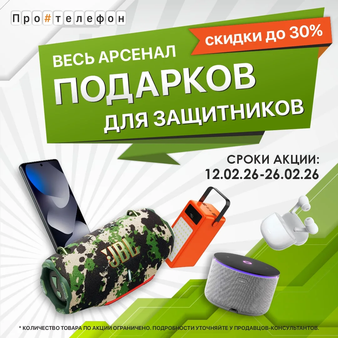 С 12.02.26 по 26.02.26 в салонах связи Протелефон действуют СКИДКИ ДО 30% на популярные товары: смартфоны, наушники, колонки, пауэрбанки и смарт-часы! ✨