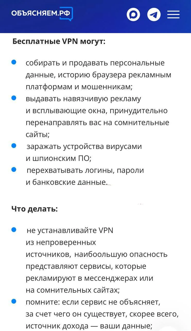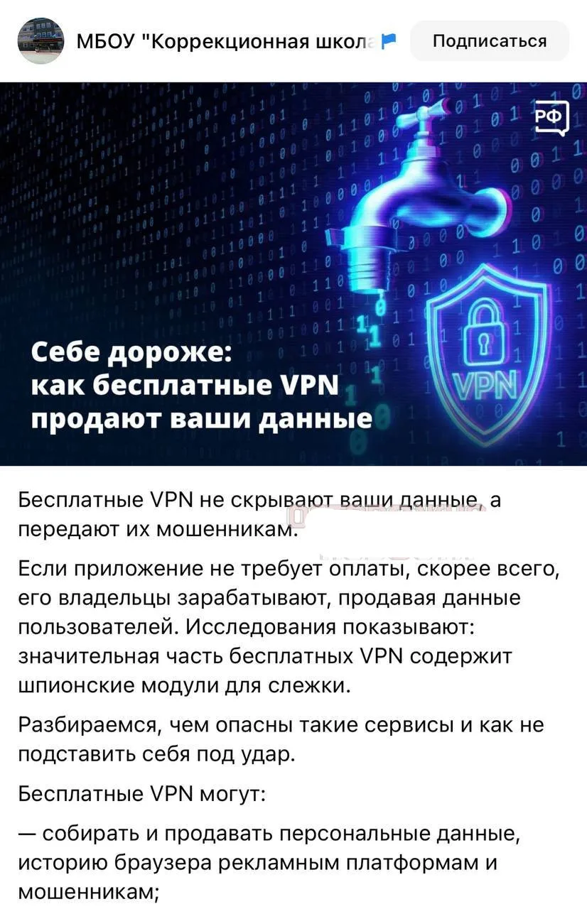 После публикации статьи «Как бесплатные VPN продают данные пользователей?» на портале «Объясняем.рф» 25 марта в пабликах школ, спортивных центров и городских администраций начали появляться посты с аналогичной информацией. В статье утверждается, что бесплатные VPN-сервисы могут зарабатывать на продаже данных пользователей, и приводятся исследования, которые якобы показывают, что многие из них содержат шпионские модули для слежки.