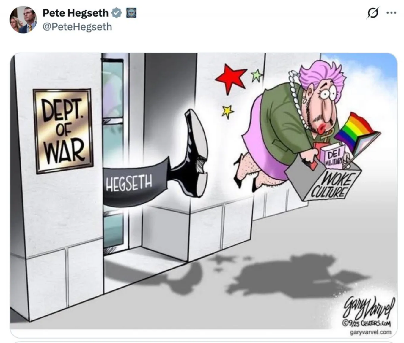 Гомосятины и СЖВ в Пентагоне не будет. Министр войны Хегсет коротко живописует новую внутреннюю политику Пентагона в отношении "боевых пи...расов и туалетов для трансформеров". Эх, не будет больше мемных фоток про радужные вертолеты и офицеров в юбках.