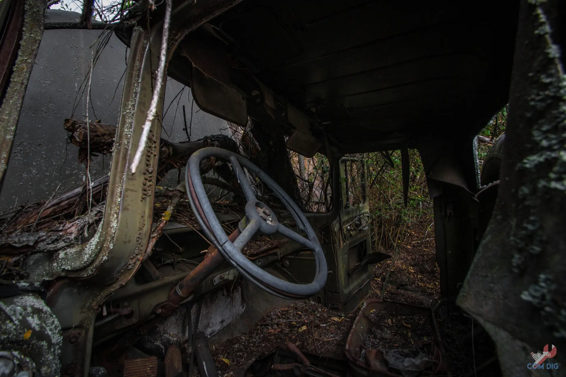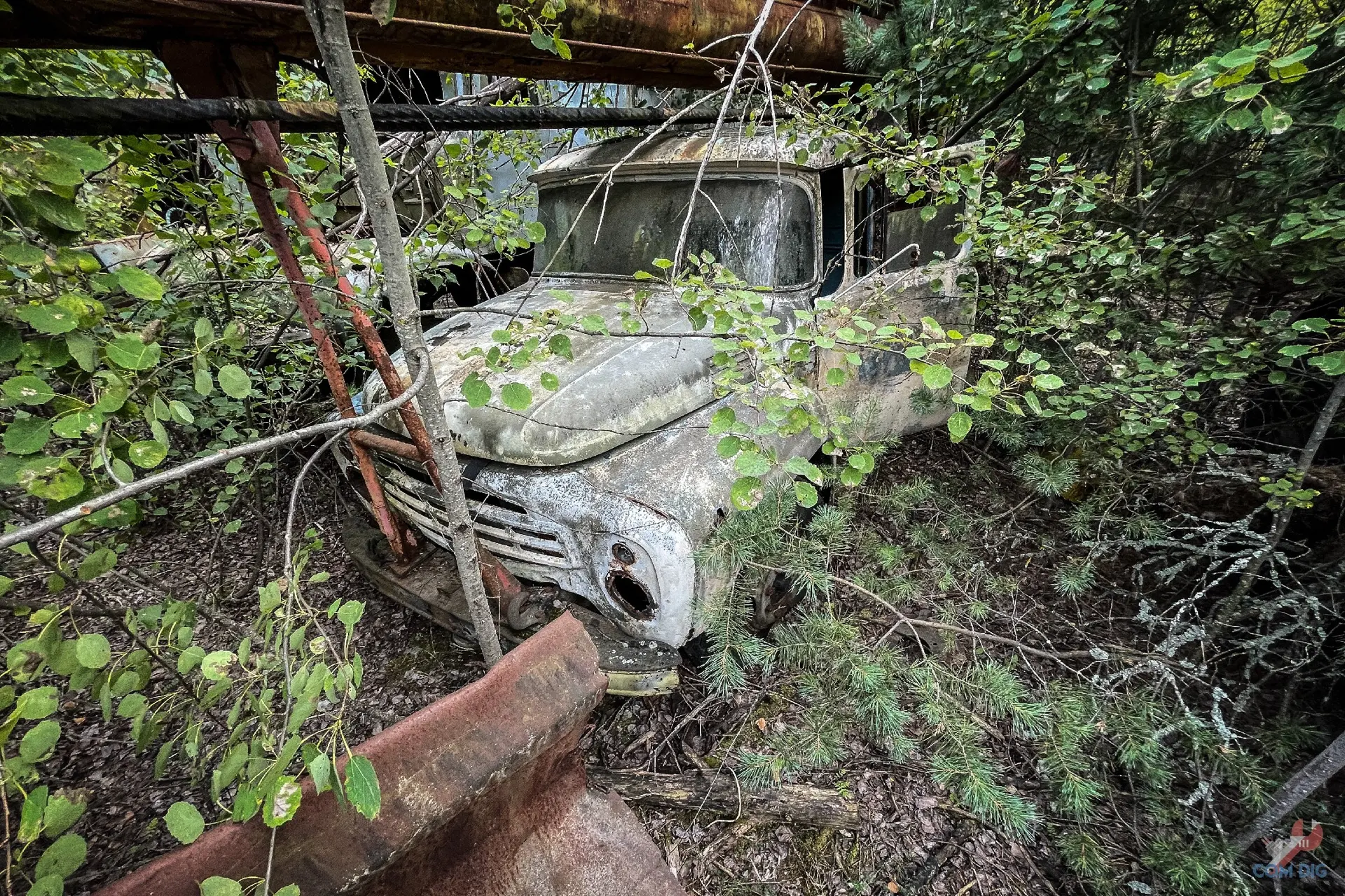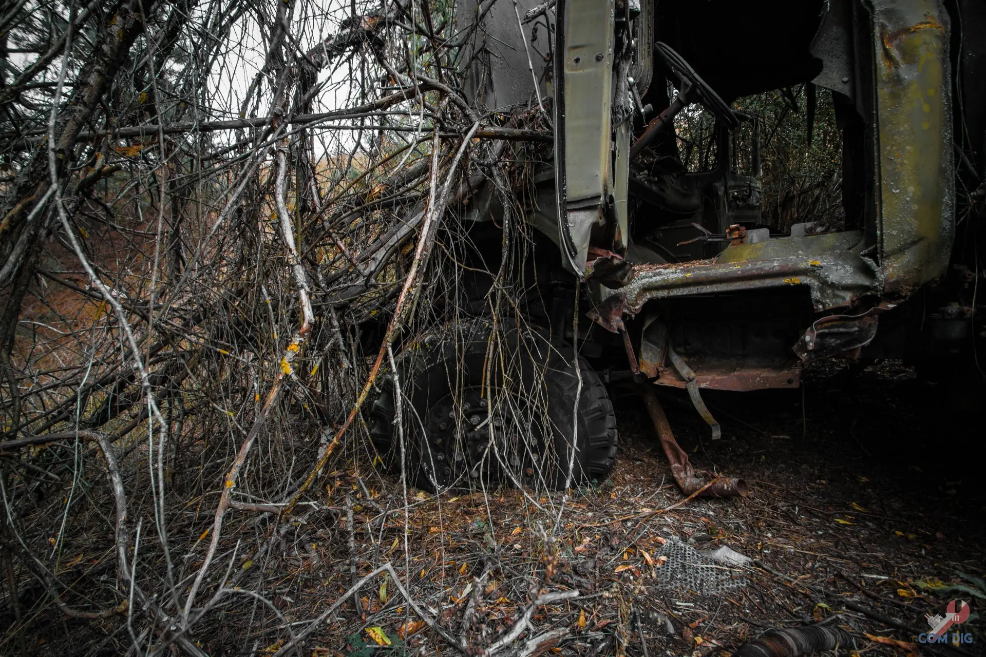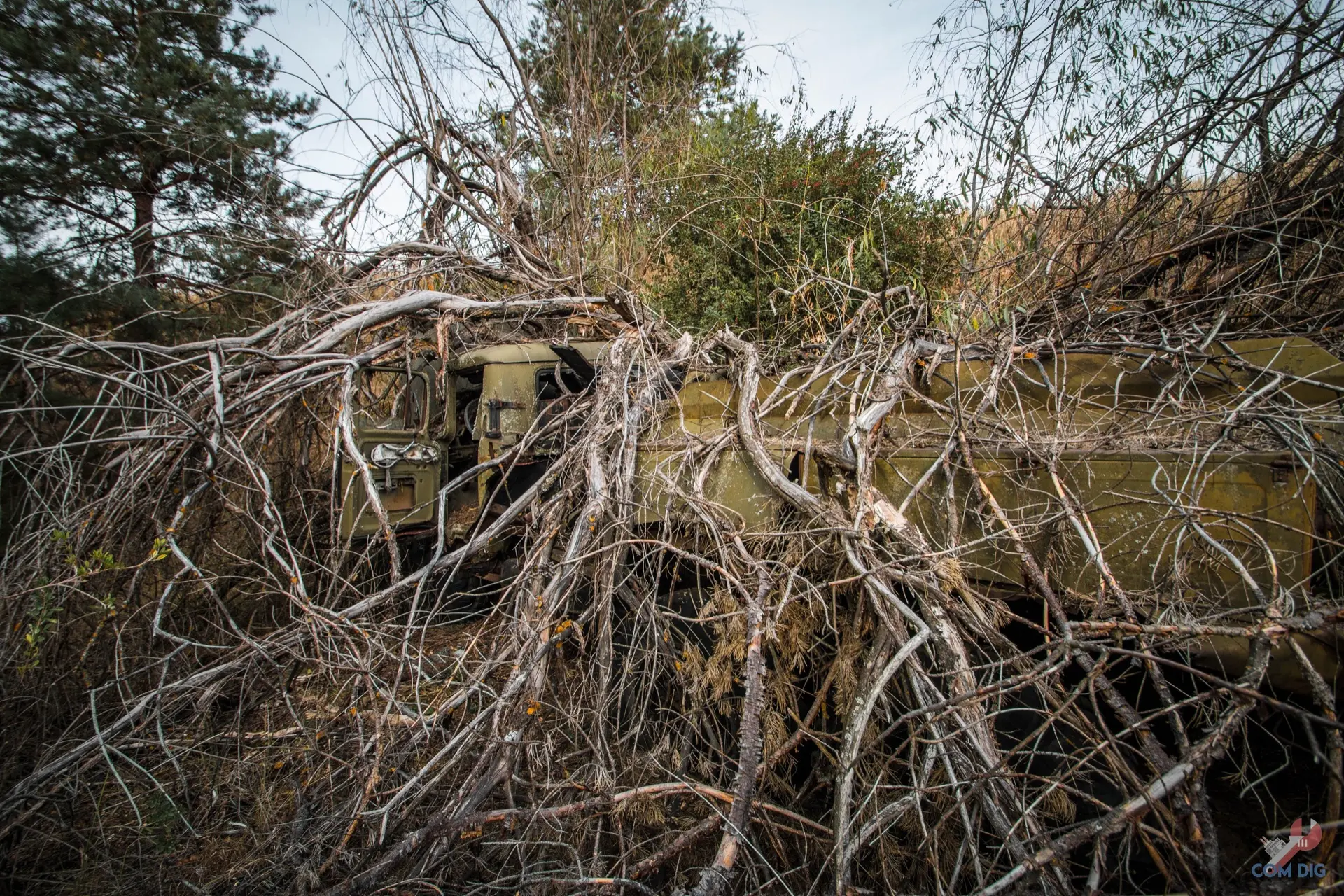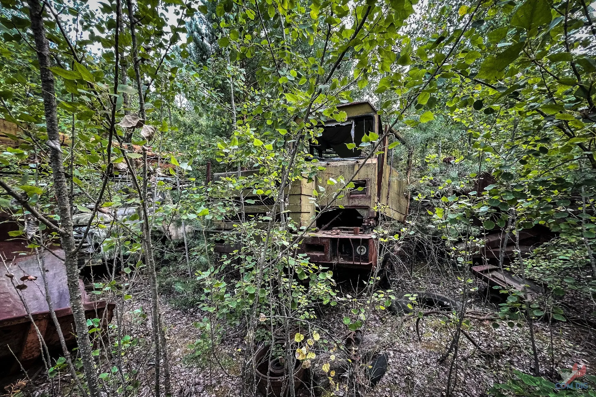 Здесь деревья настоящие хозяева. Они ведут тихую войну с металлом уже больше 30 лет. Где-то техника почти скрыта под зеленью, где-то дерево, прорастая сквозь кабину, погибло, но перед смертью успело обвить грузовик ветвями, словно пытаясь утащить его под землю.