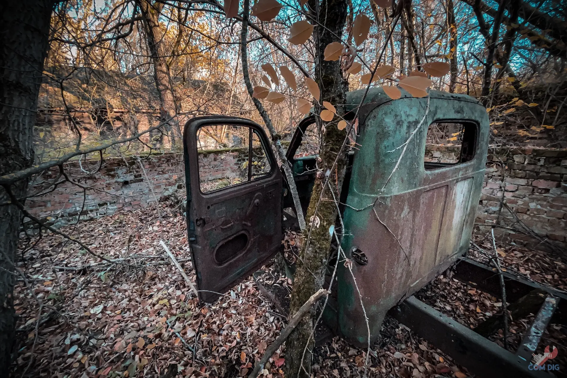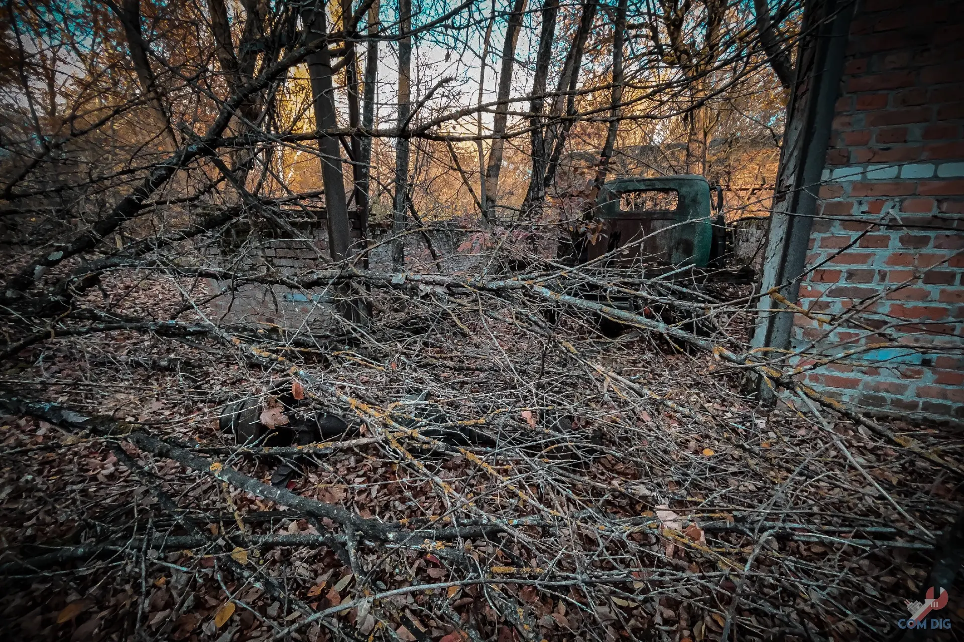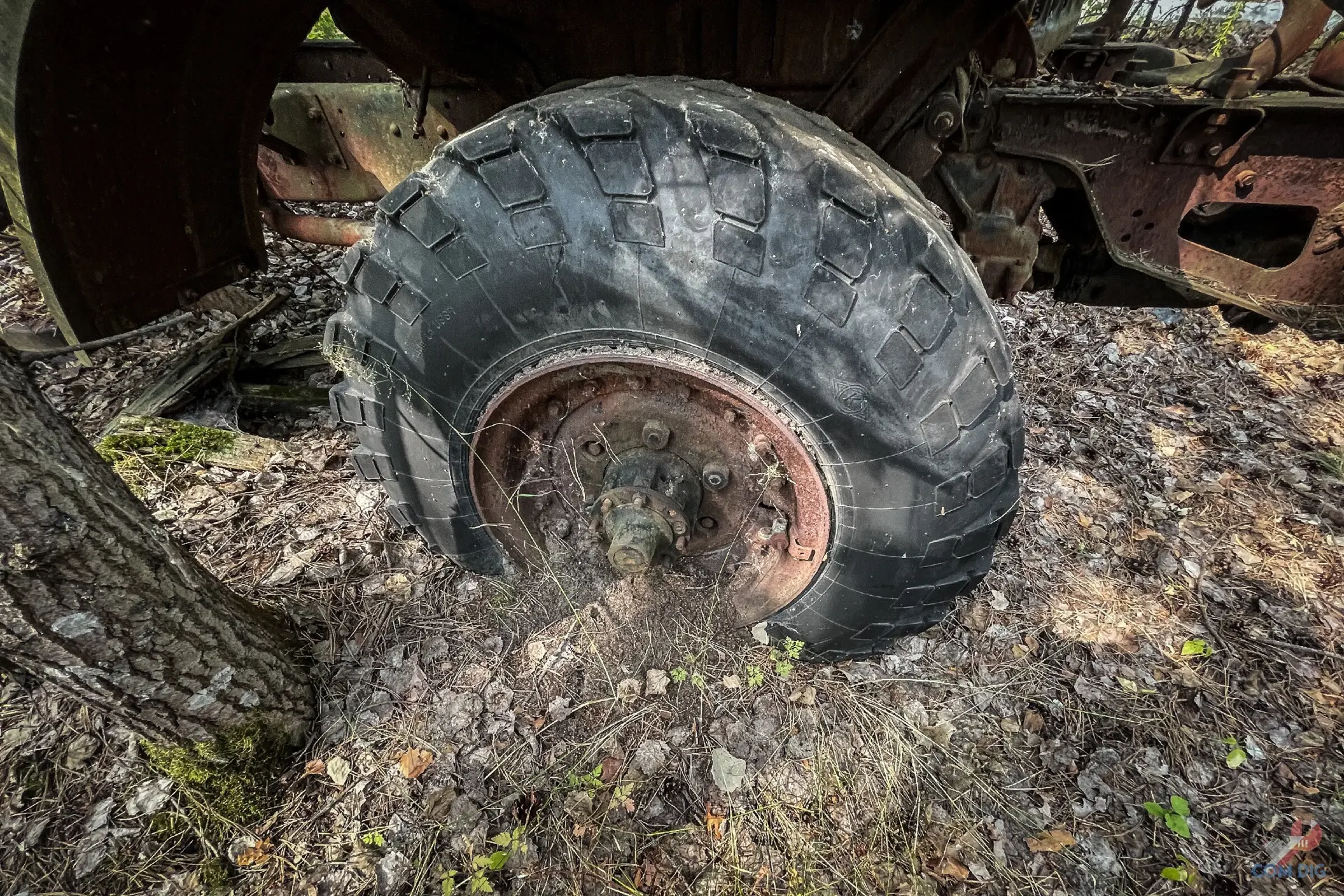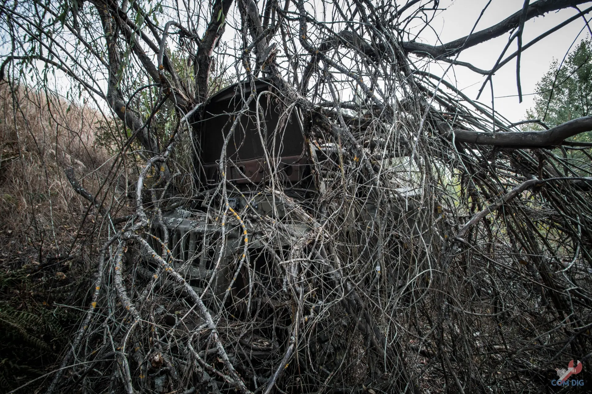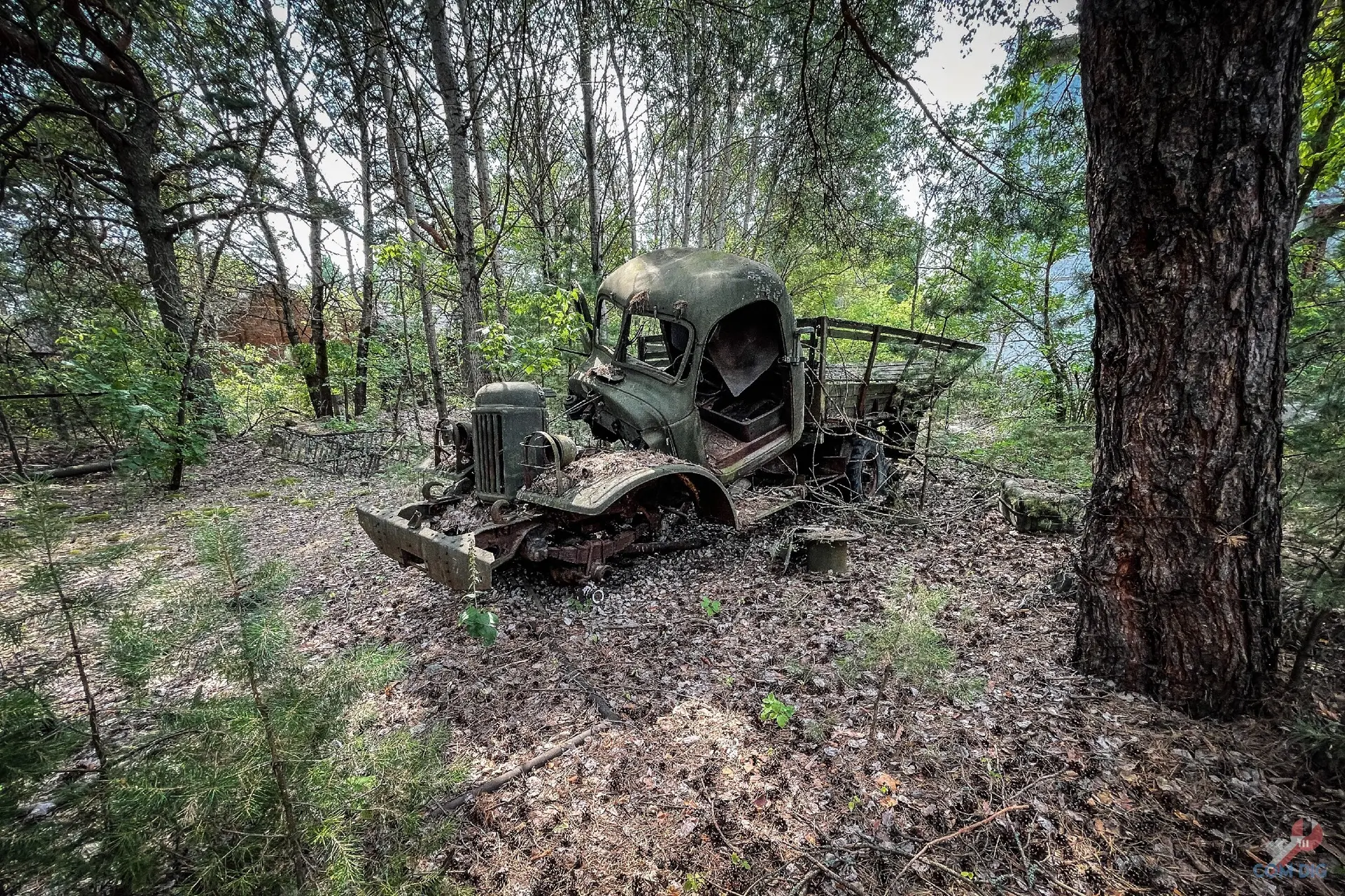 Здесь деревья настоящие хозяева. Они ведут тихую войну с металлом уже больше 30 лет. Где-то техника почти скрыта под зеленью, где-то дерево, прорастая сквозь кабину, погибло, но перед смертью успело обвить грузовик ветвями, словно пытаясь утащить его под землю.