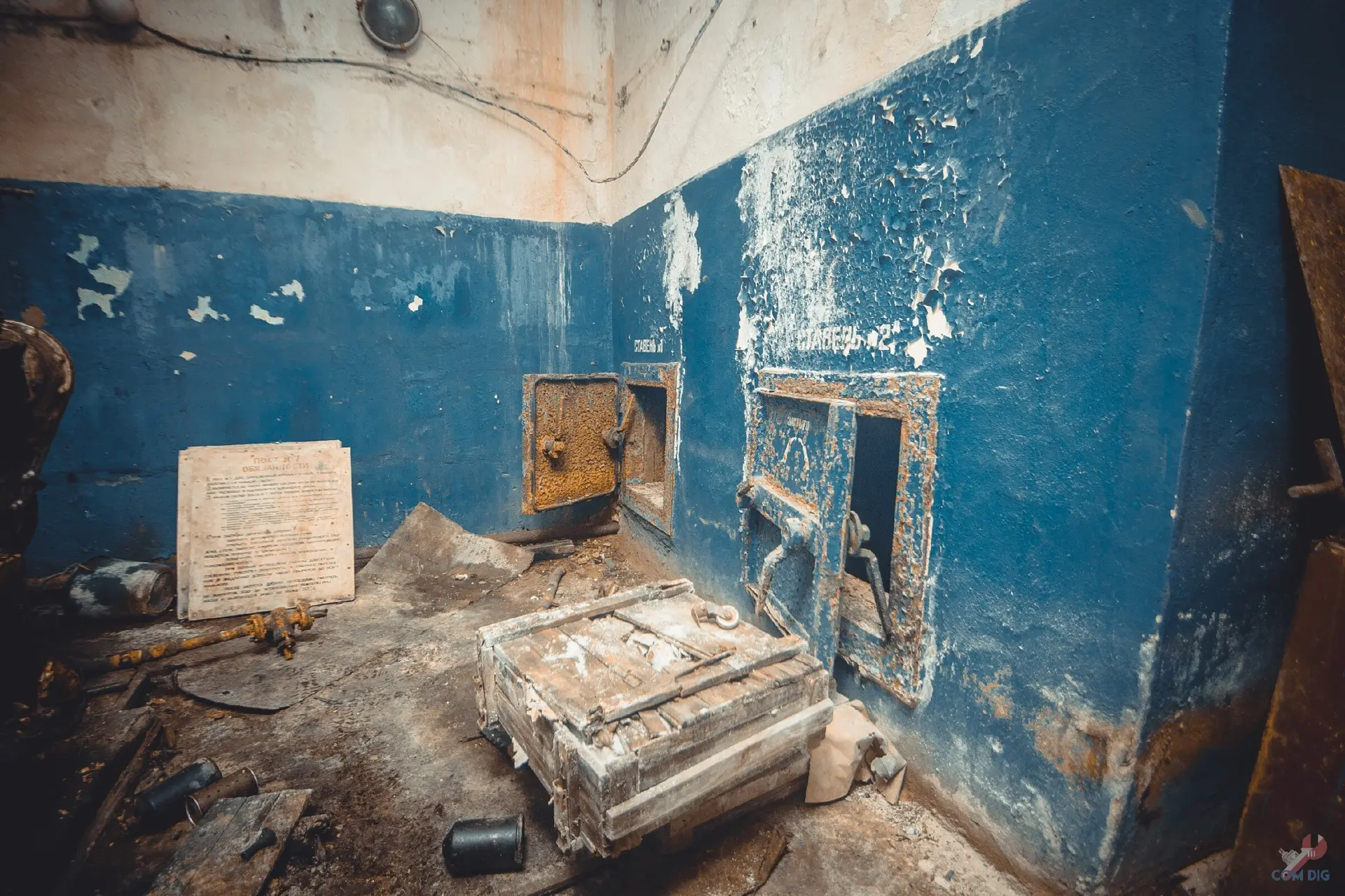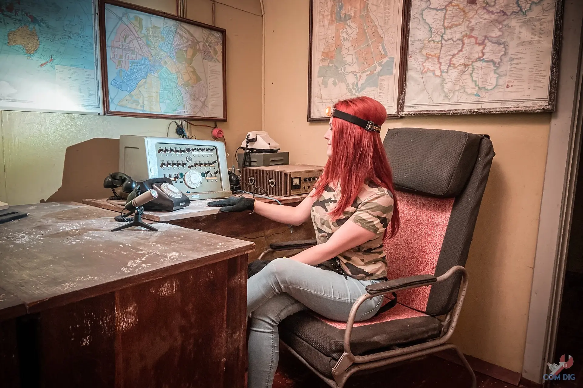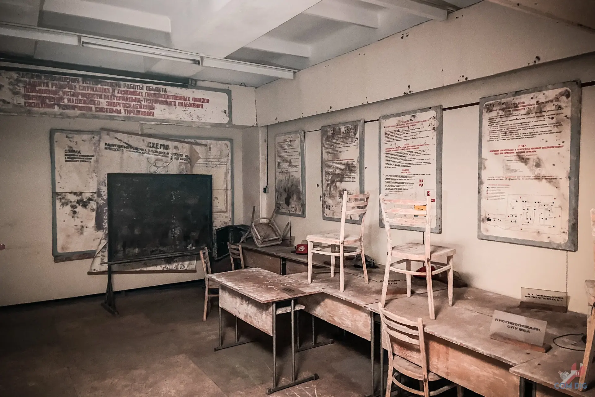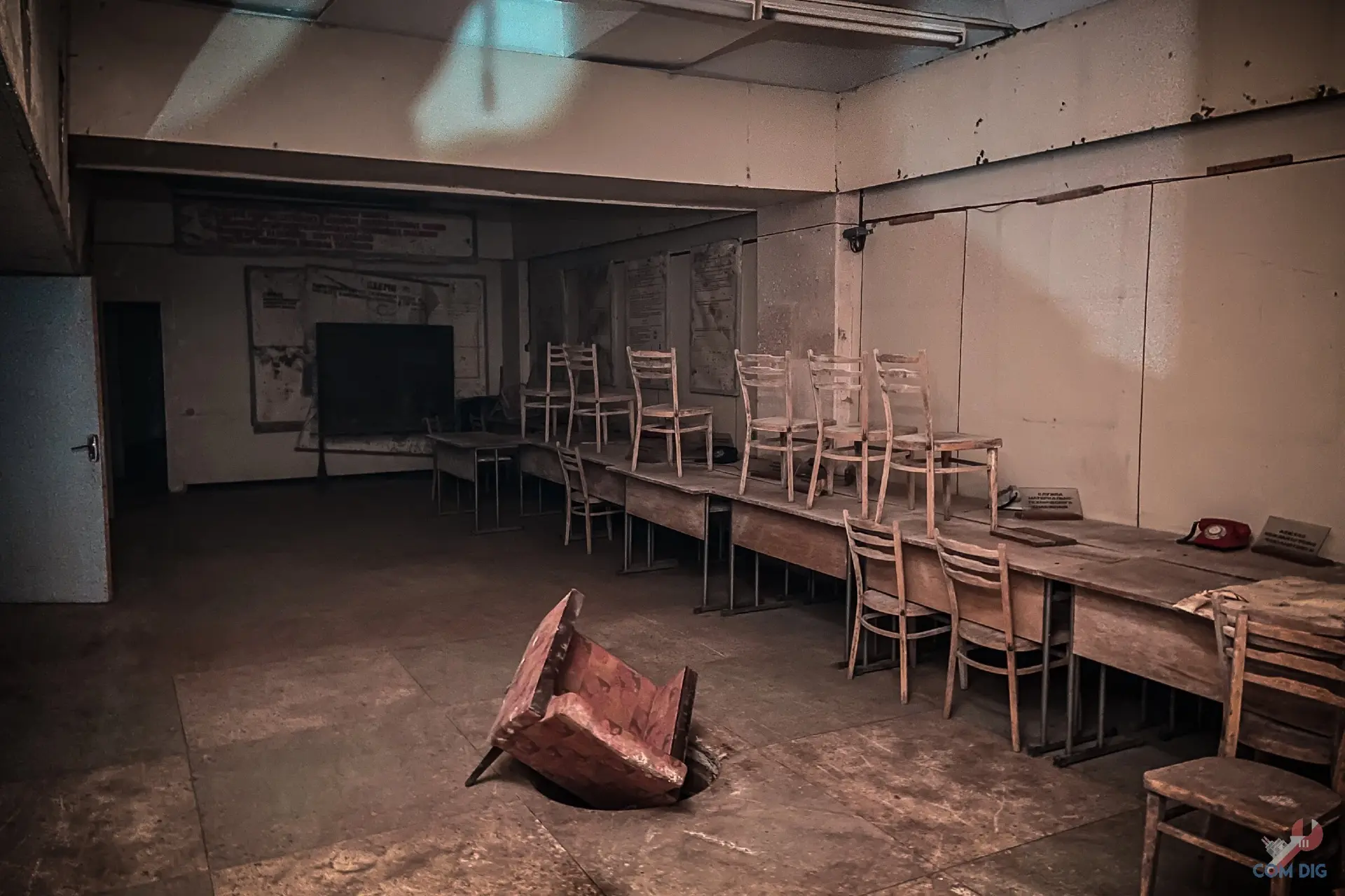 Самое удивительное, внутри всё осталось на своих местах. В кабинете пункта управления, где должен был работать руководящий состав завода, до сих пор стоят телефоны, коммутаторы, висят карты с обозначением важных объектов.