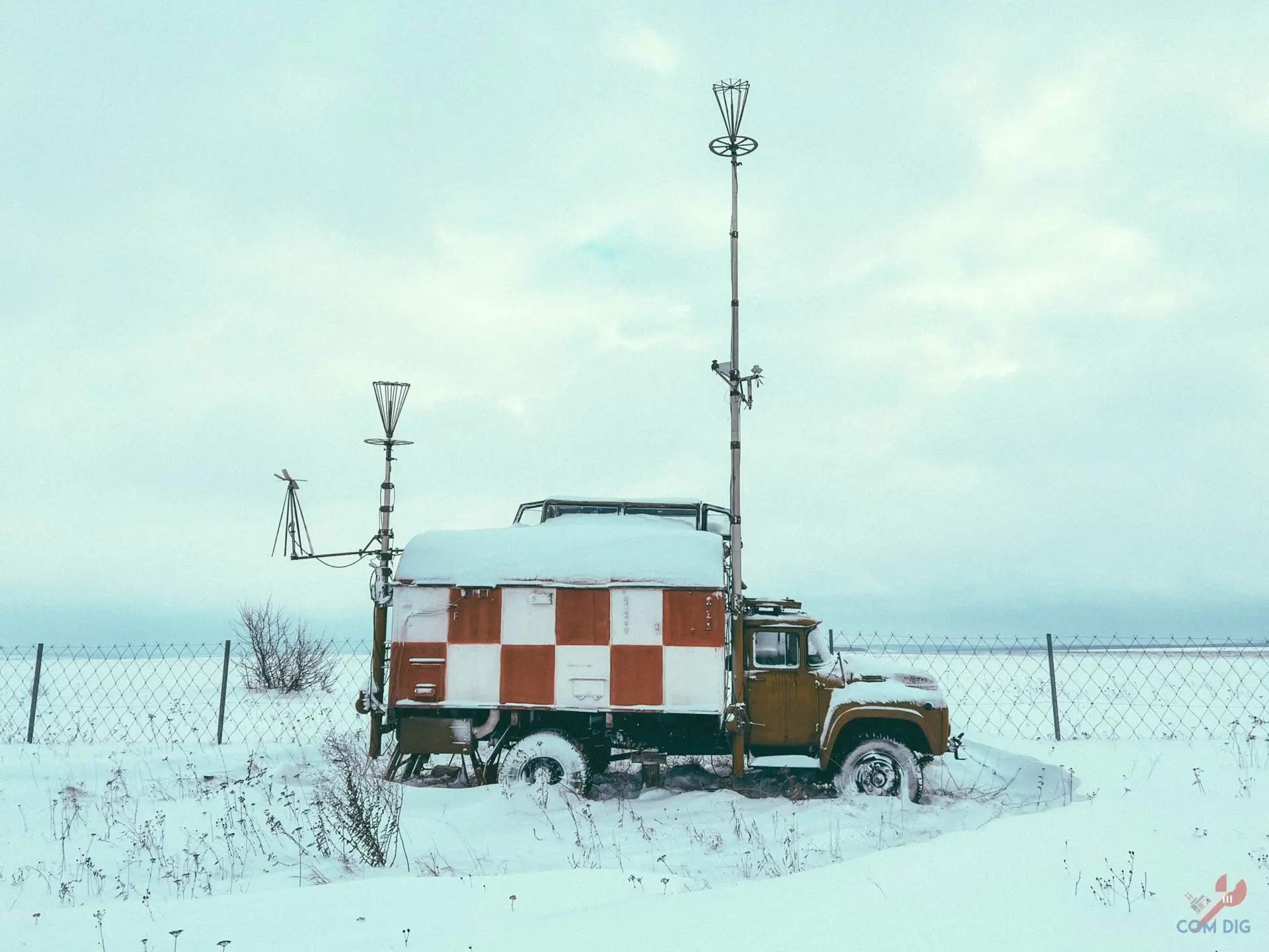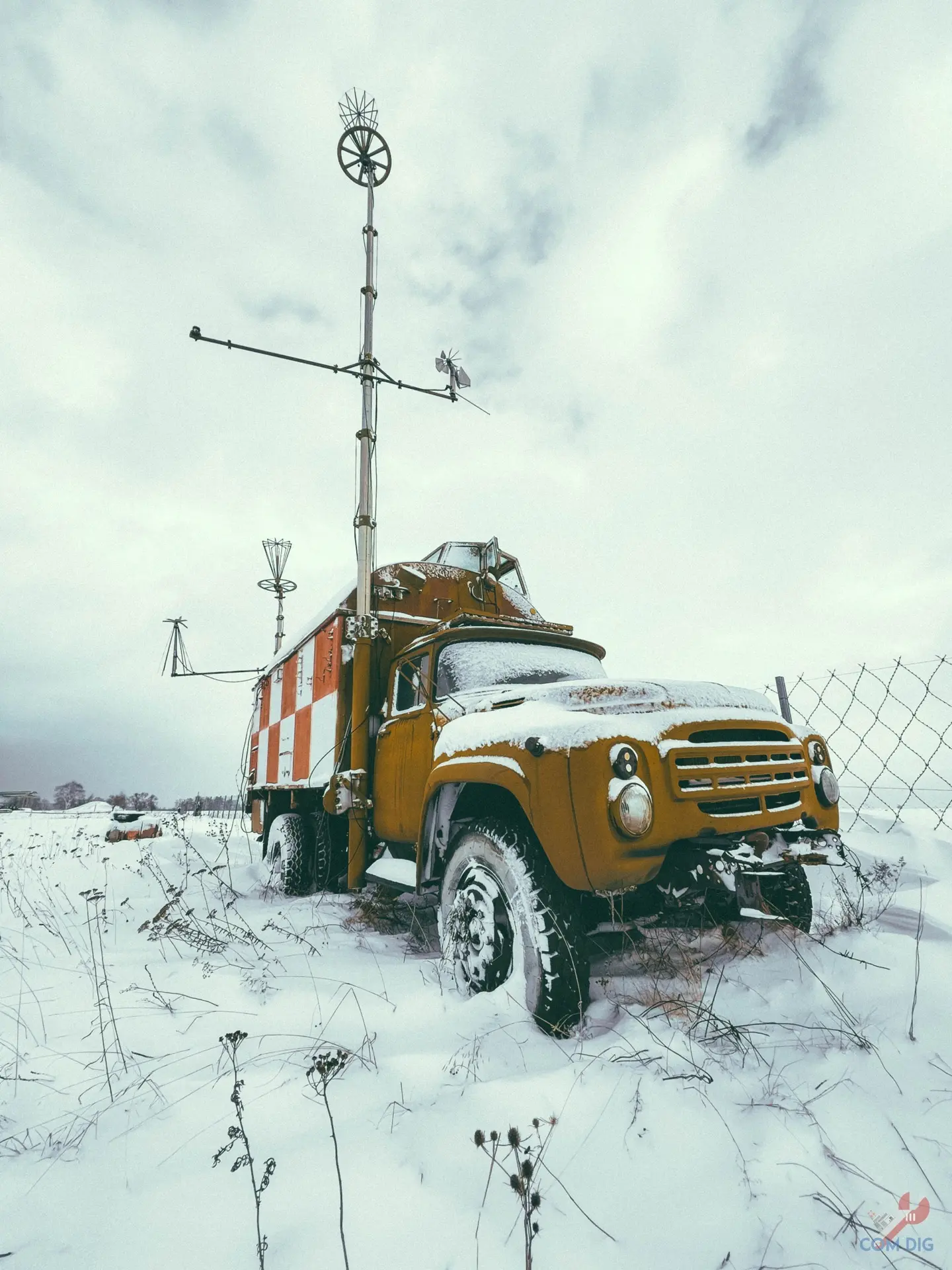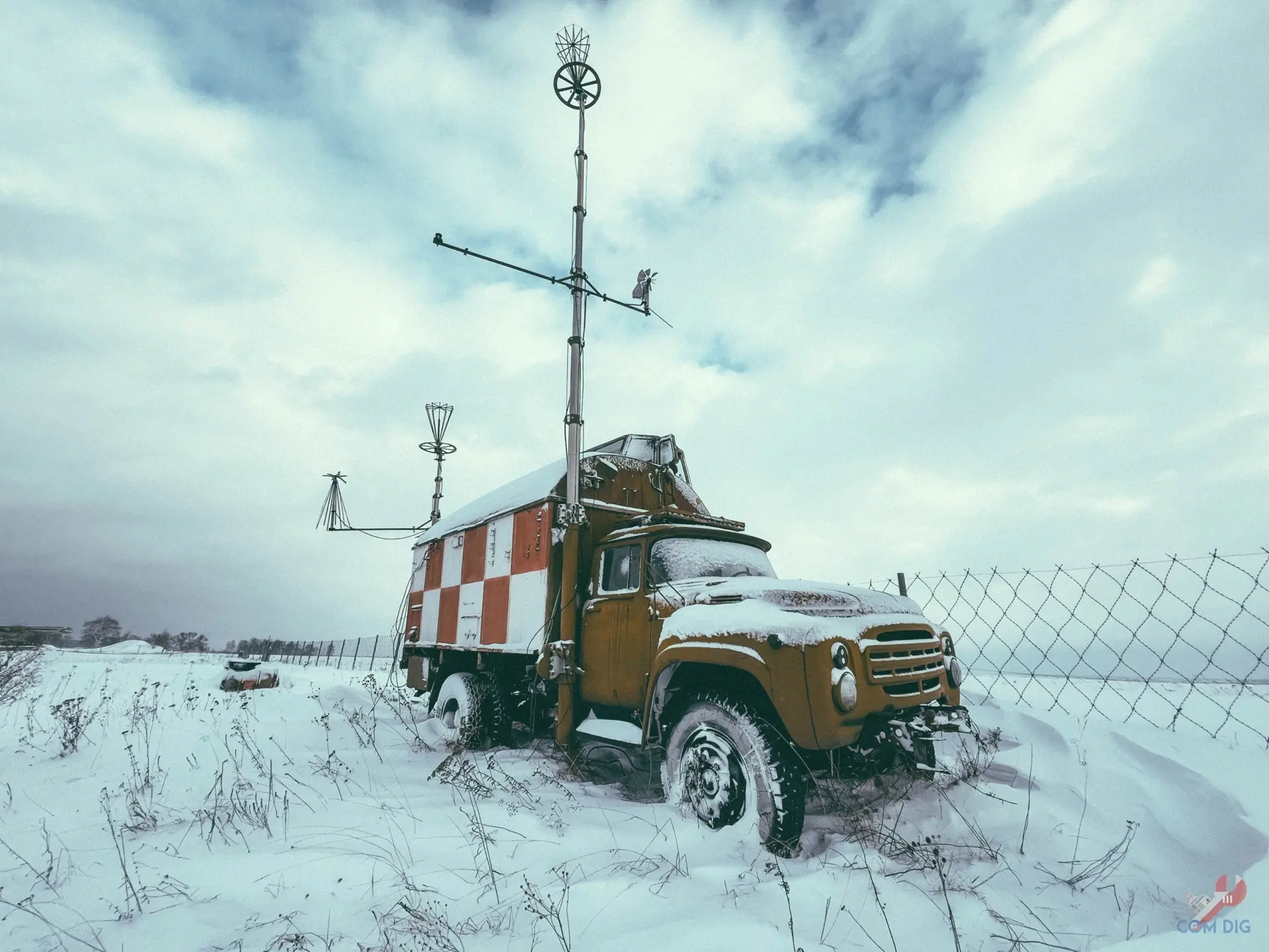 Легковые и грузовые автомобили мирно спят, запорошенные снегом. А вот среди них выделяется рабочая лошадка. Это действующий стартовый командный пункт (СКП) на базе ЗиЛ-130. Лётчики между собой часто называют его «Подсказка».