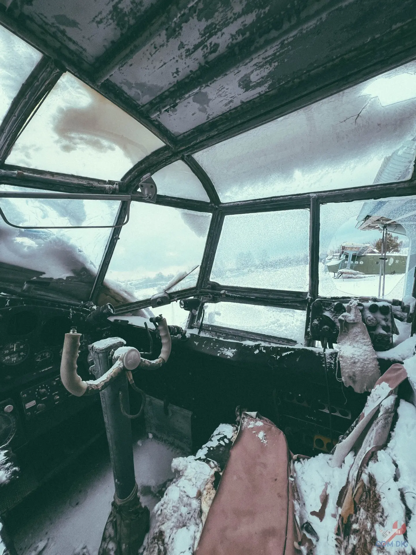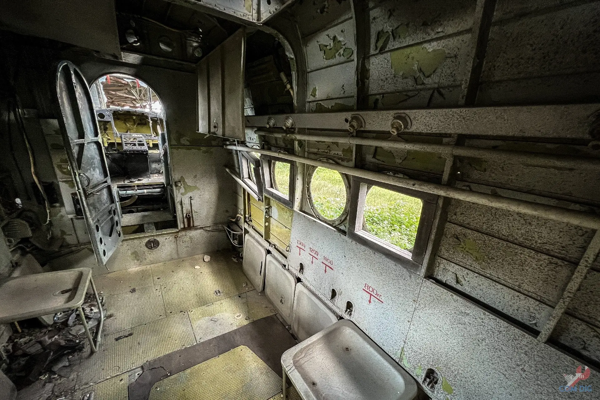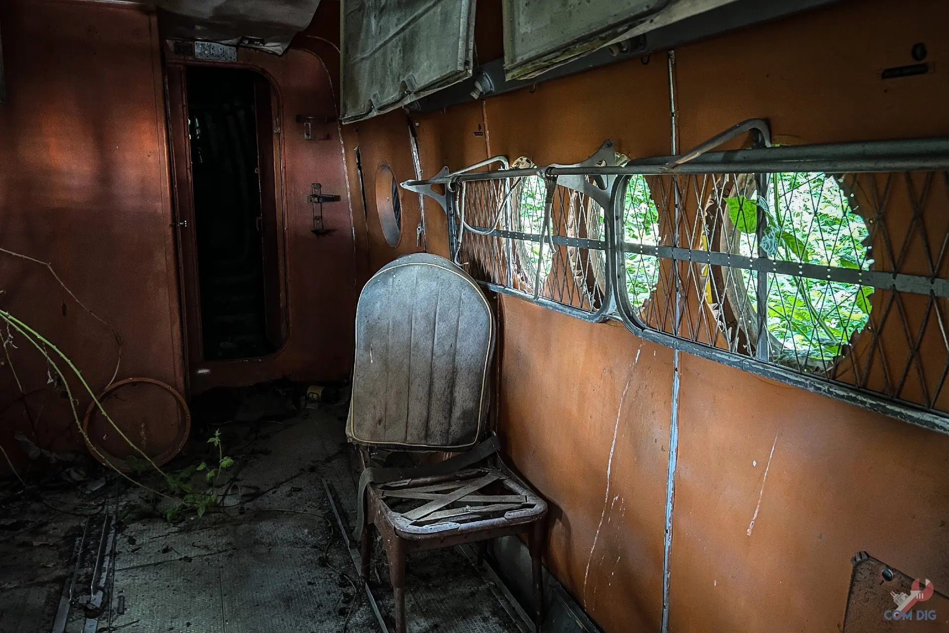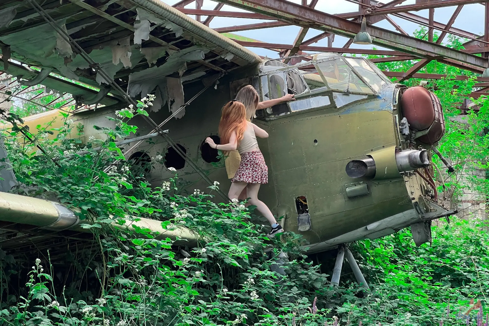 Внутри самолётов было ещё интереснее. Казалось, будто один из них потерпел крушение на тропическом острове, ведь через разбитые иллюминаторы пробивается растительность и всё затянуто зеленью.