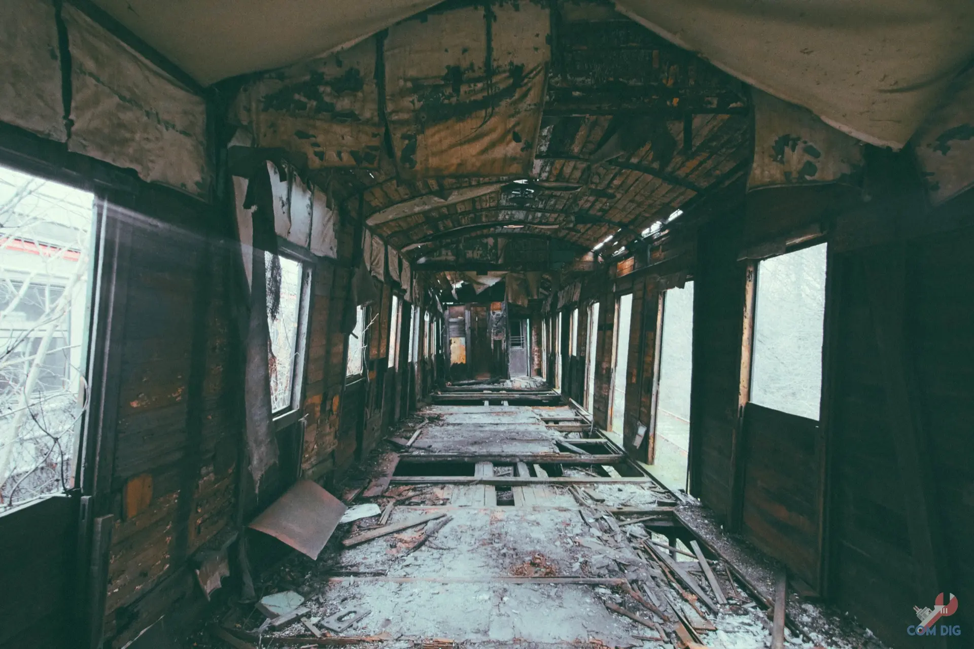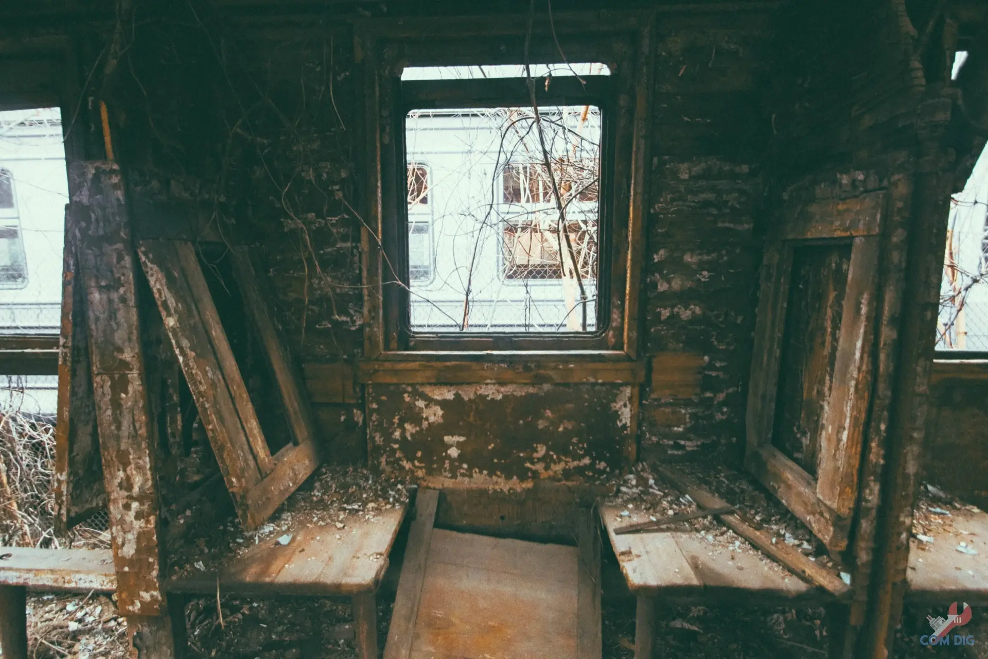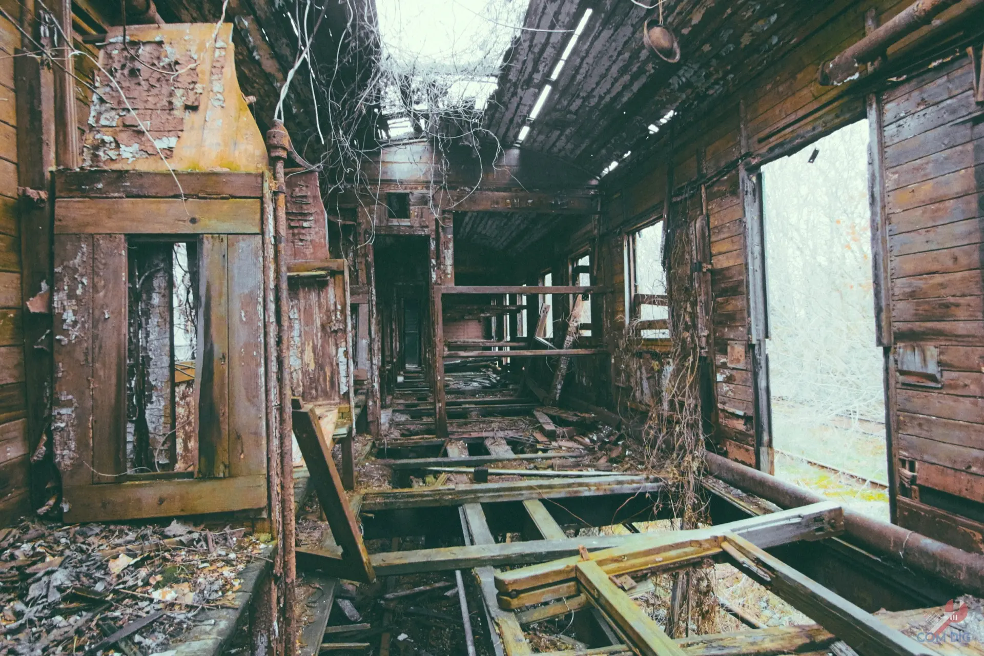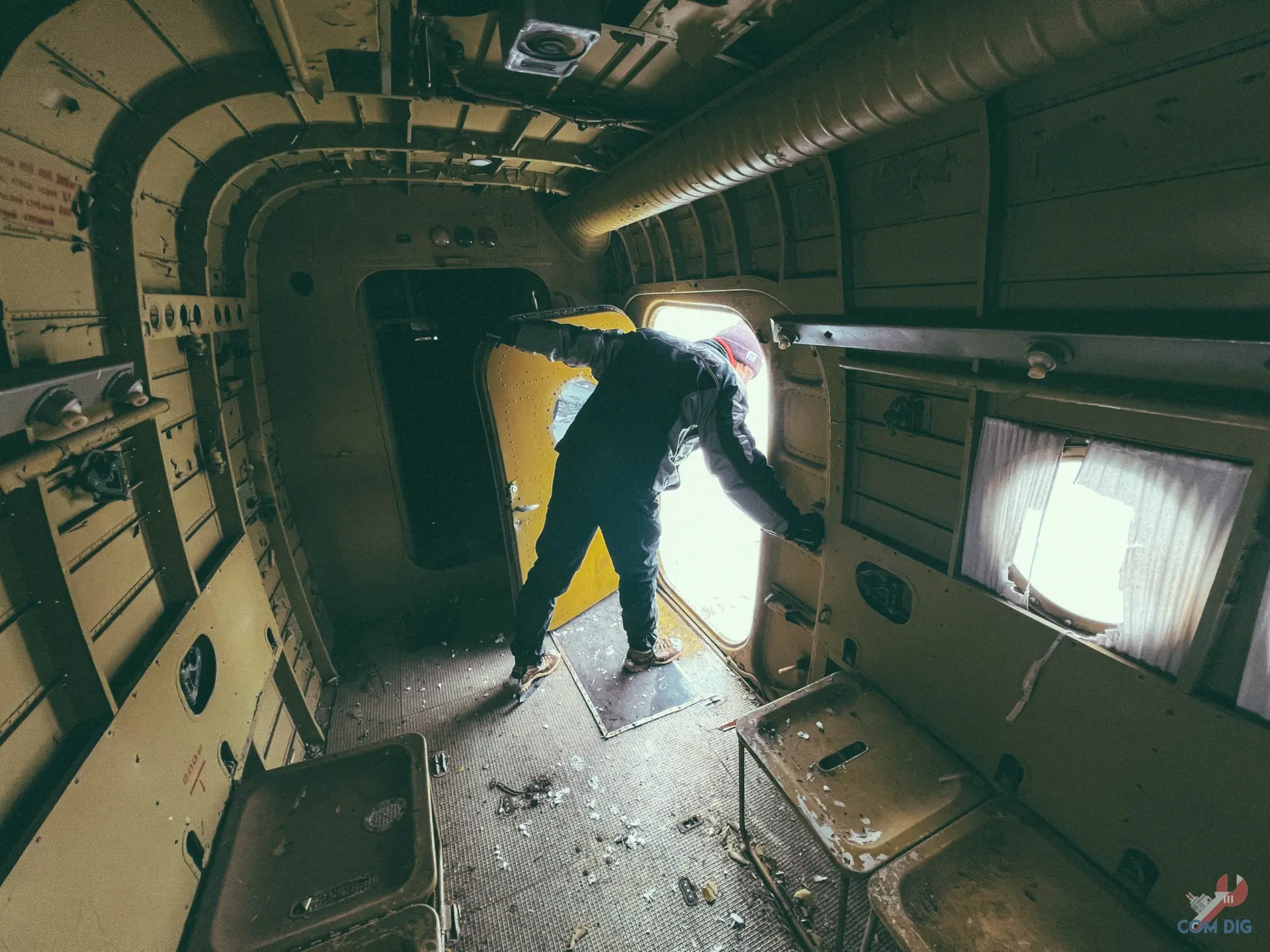 Внутри самолётов было ещё интереснее. Казалось, будто один из них потерпел крушение на тропическом острове, ведь через разбитые иллюминаторы пробивается растительность и всё затянуто зеленью.