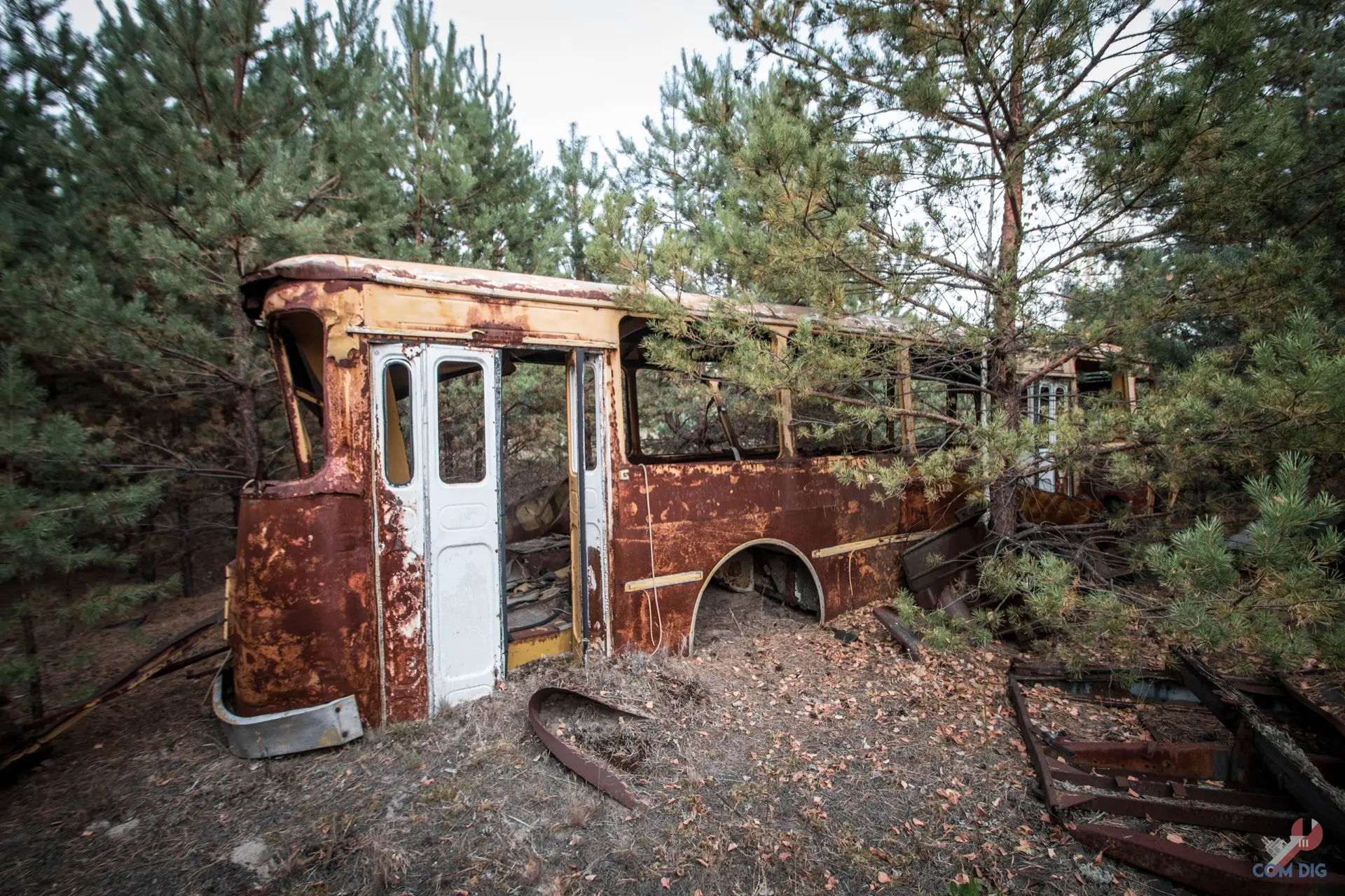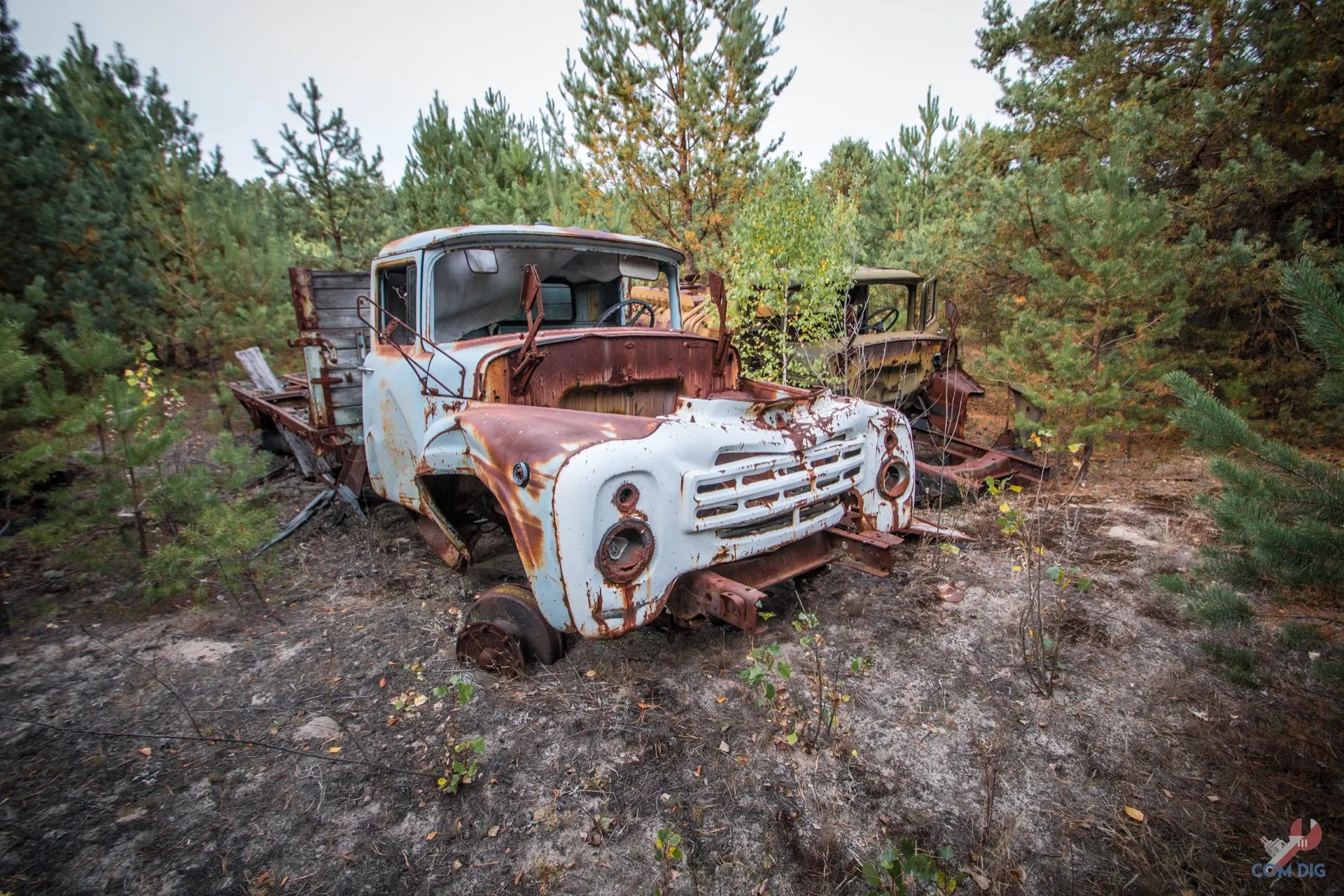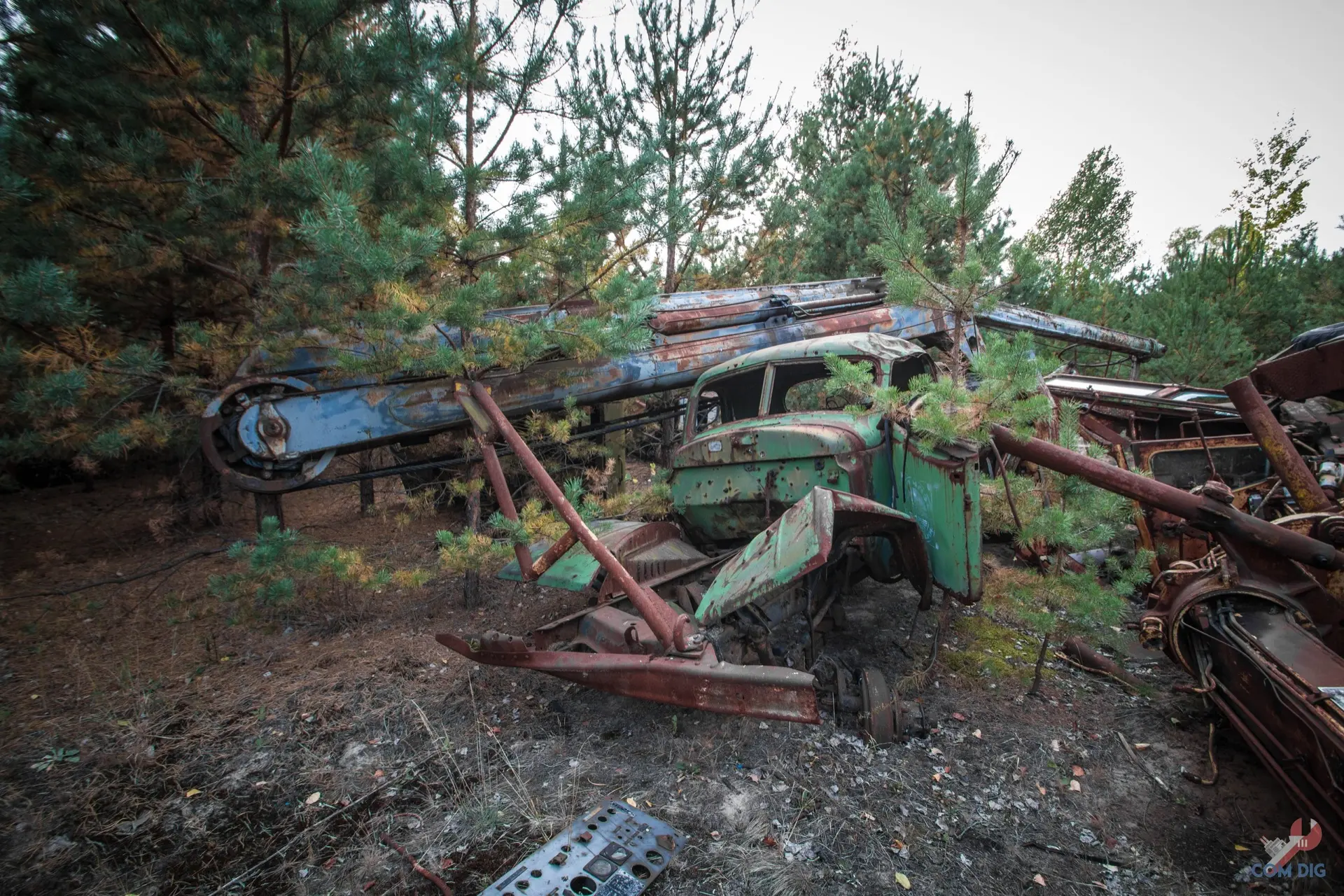 В глубине Чернобыльского леса, куда редко заглядывает солнце, уже почти 40 лет стоит заброшенная техника ликвидаторов, в основном грузовики ЗИЛ-157, ЗИЛ-130, БТР-60 и БРДМ-2. По одной из версий, её пригнали сюда второпях, когда в основных отстойниках для техники принимавшей участив в ликвидациях последствий аварии на Чернобыльской атомной станции не хватило места. А потом лес медленно поглотил это кладбище «железных ликвидаторов».