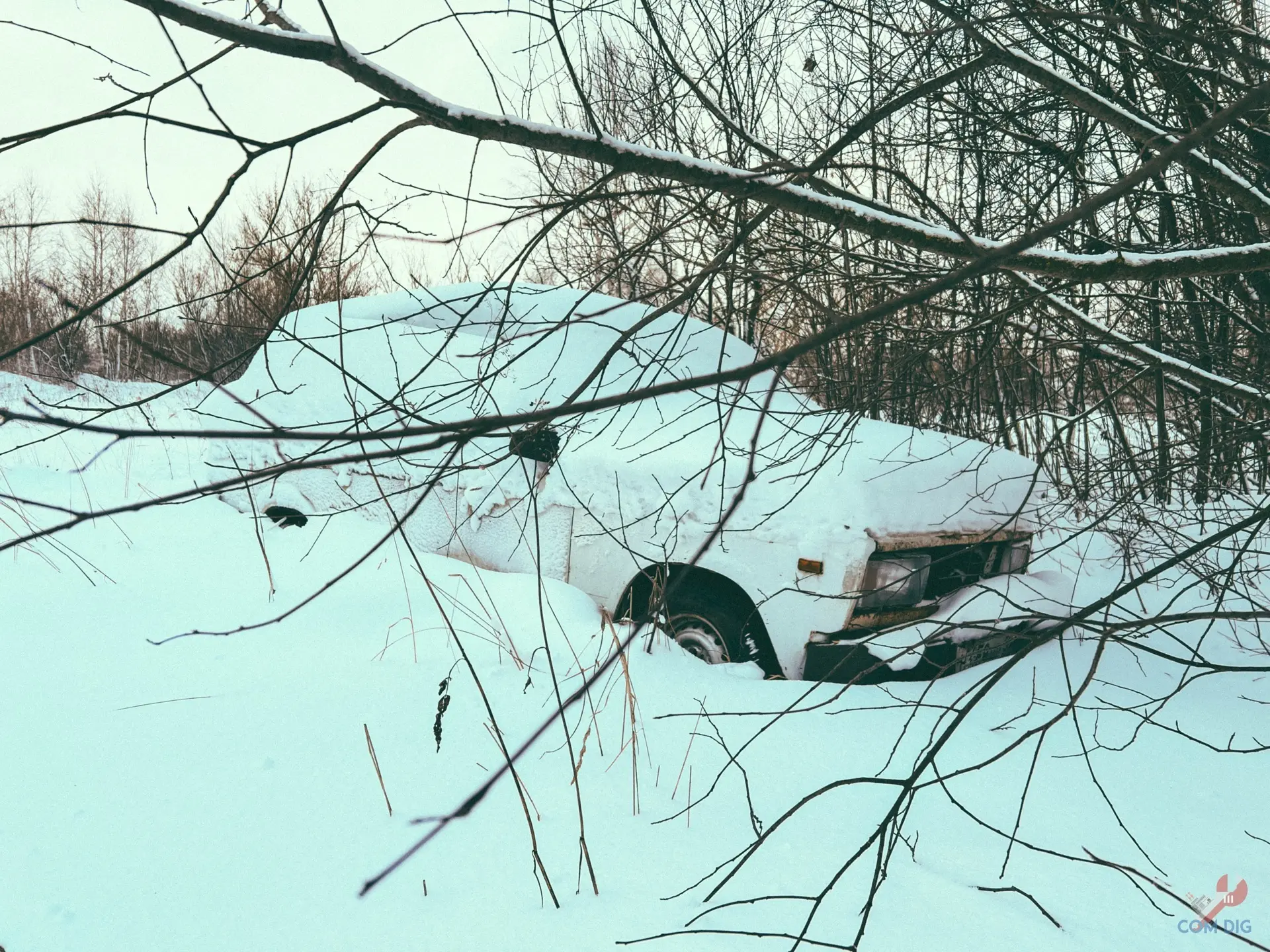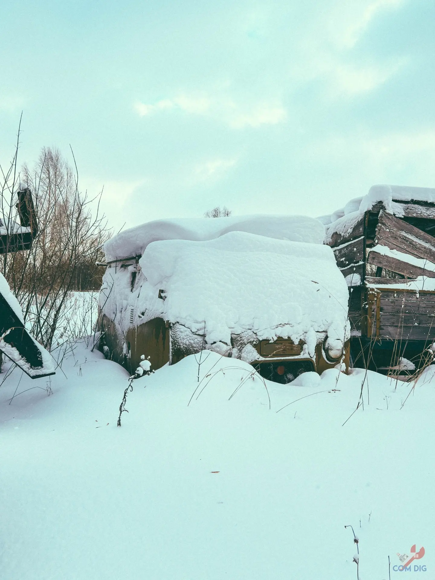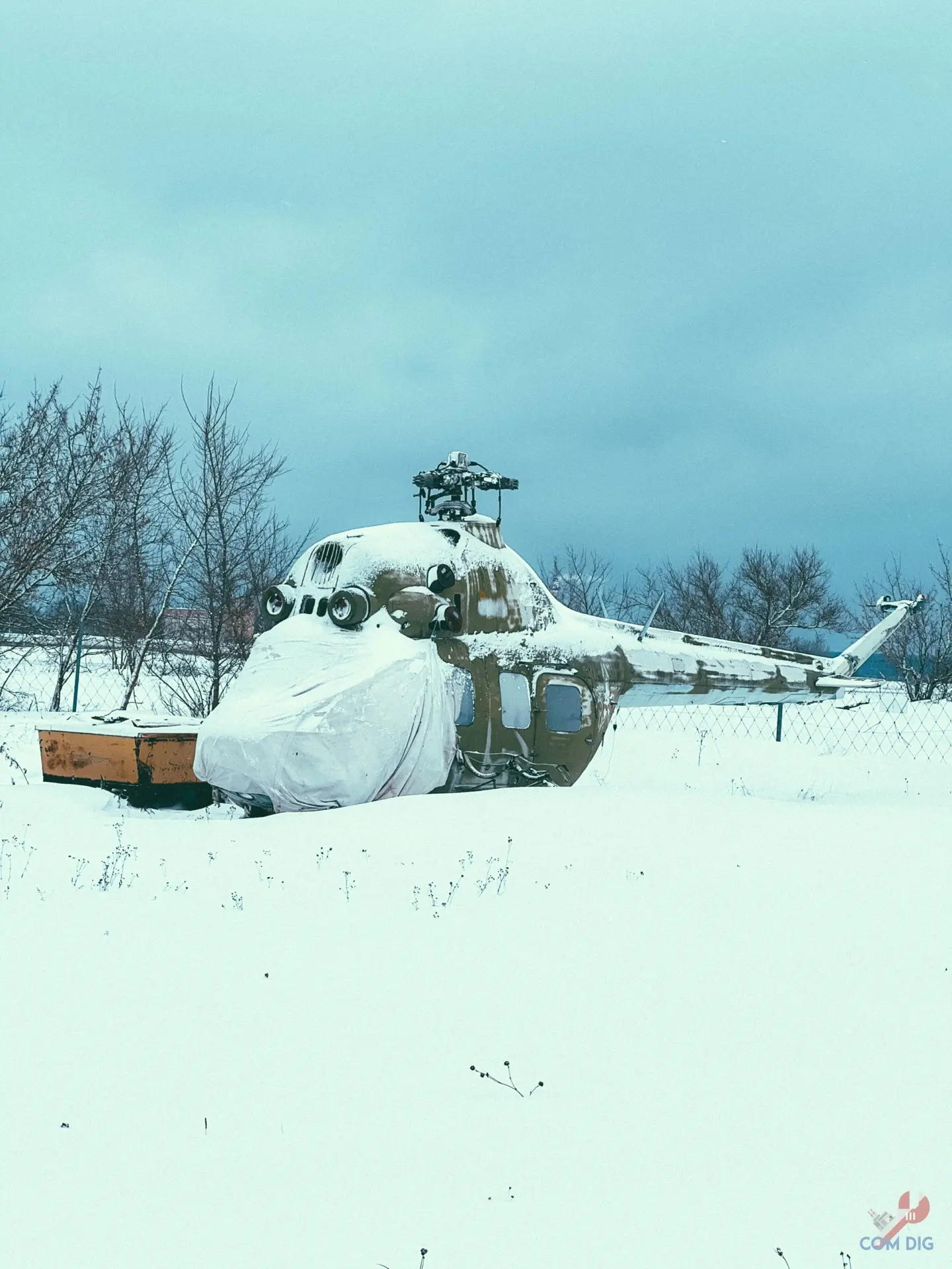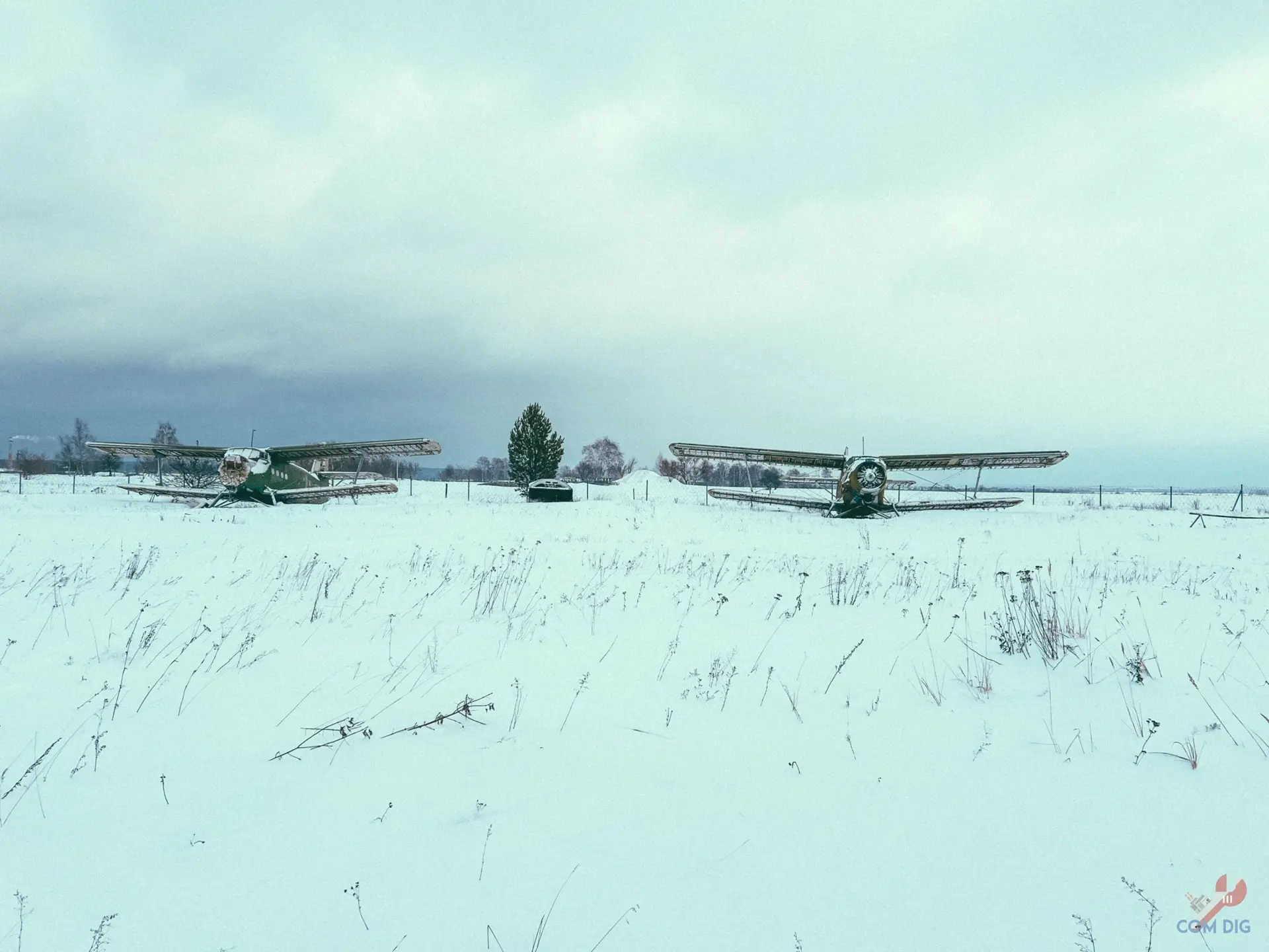 Зимний аэродром, где работающий СКП и заброшенная техника прячутся под снегом.
