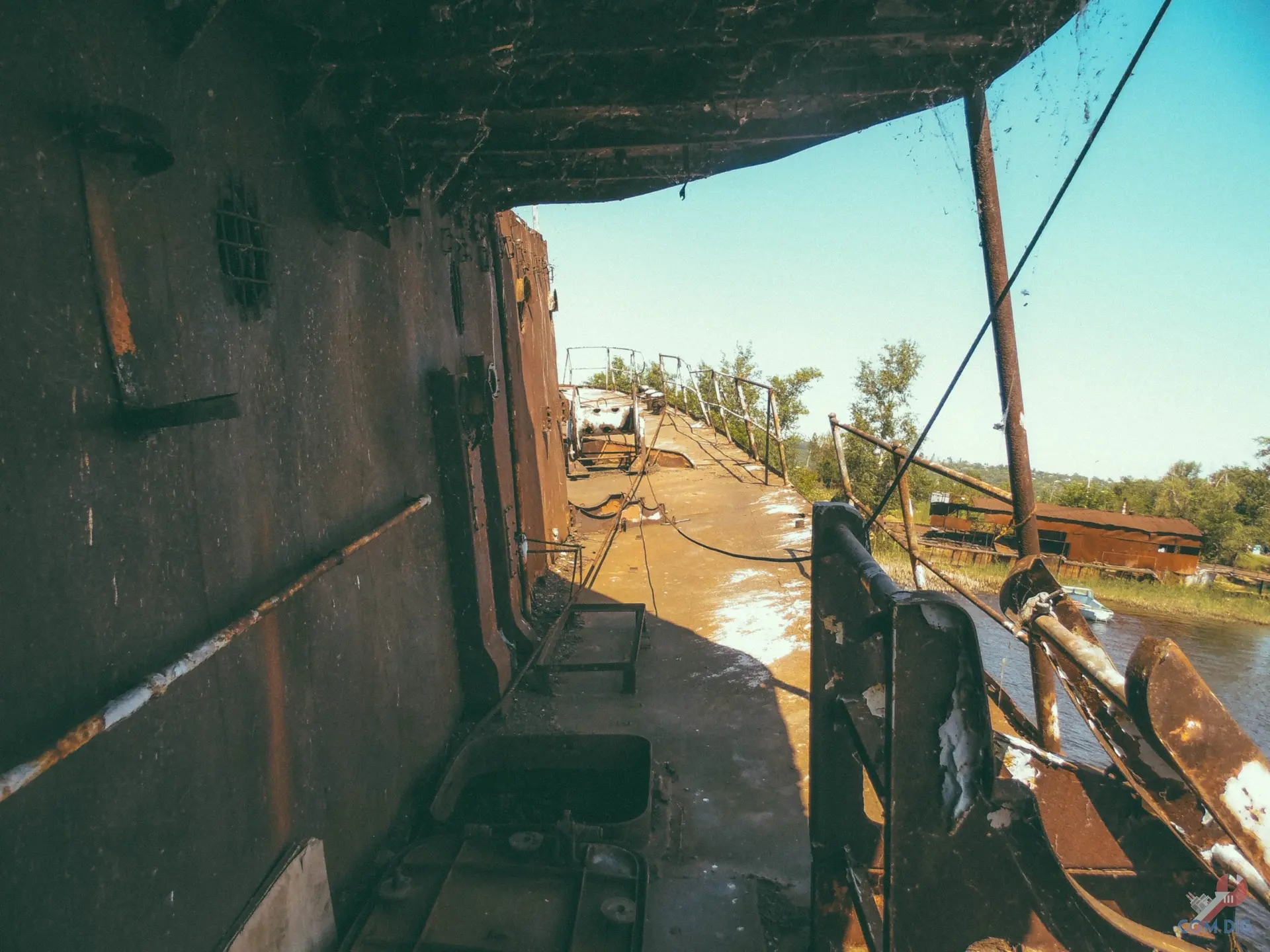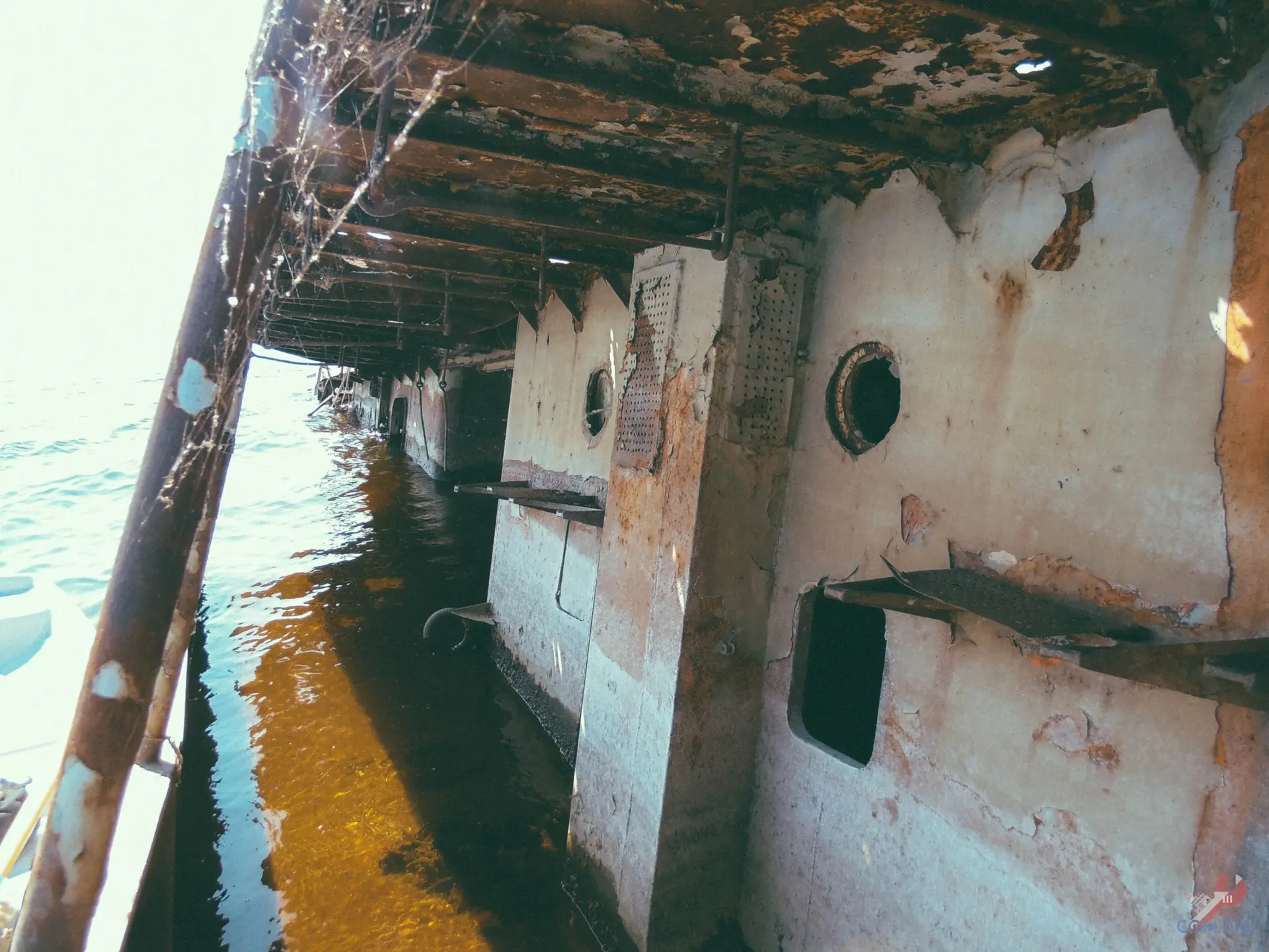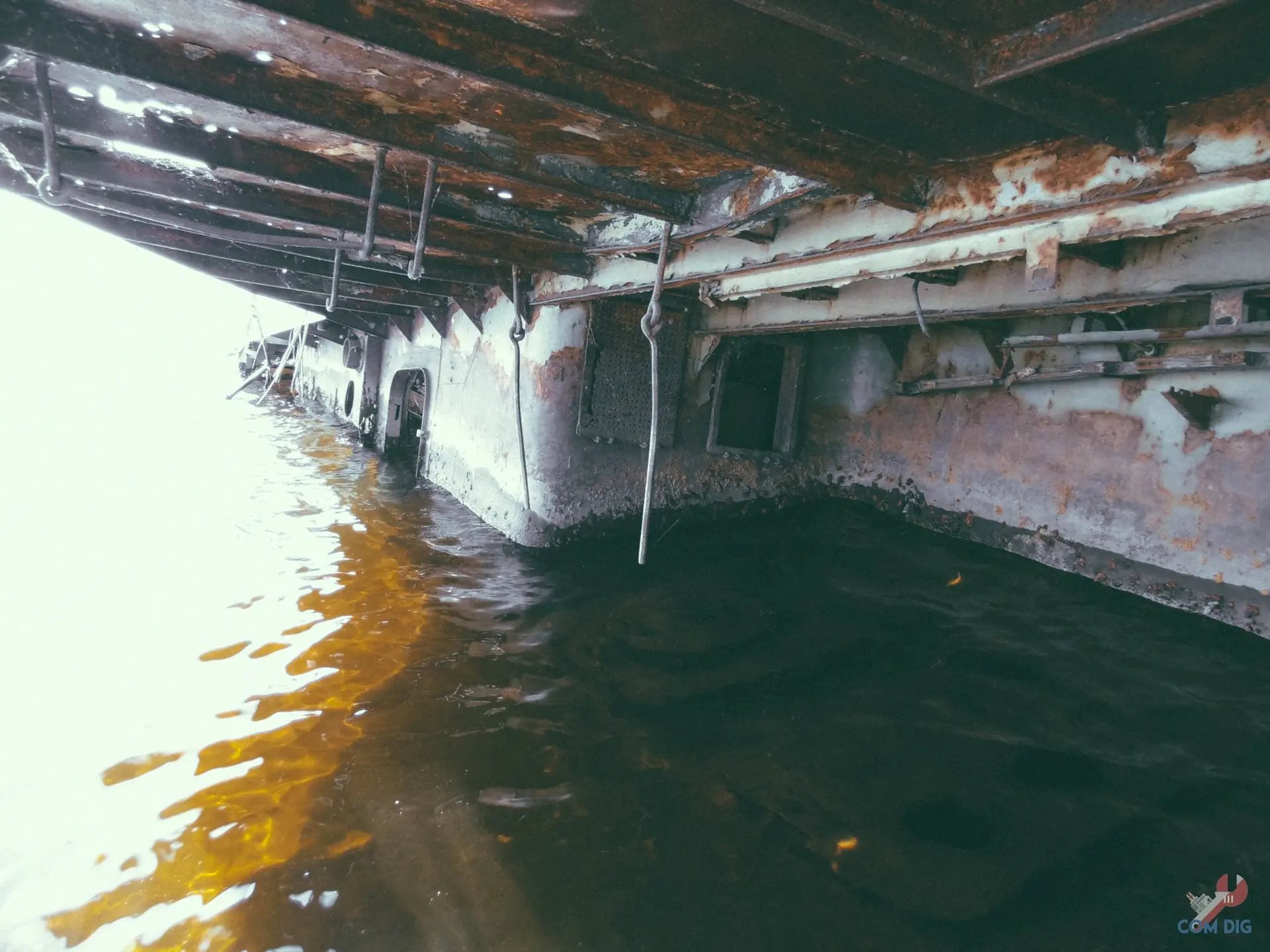 Как видно, всё пришло в полную негодность: металл проржавел насквозь и крошится, как печенье. Помещения пустые и жуткие, повсюду паутина, а в темноте слышно, как волны наполняют корпус судна.