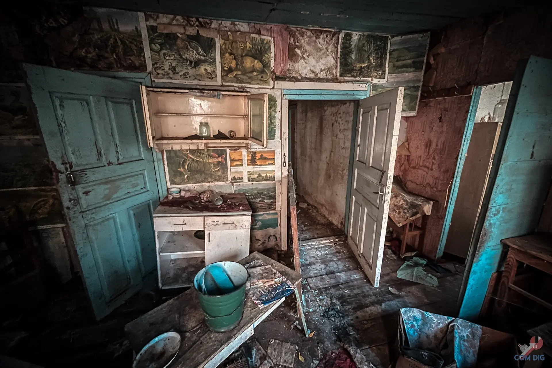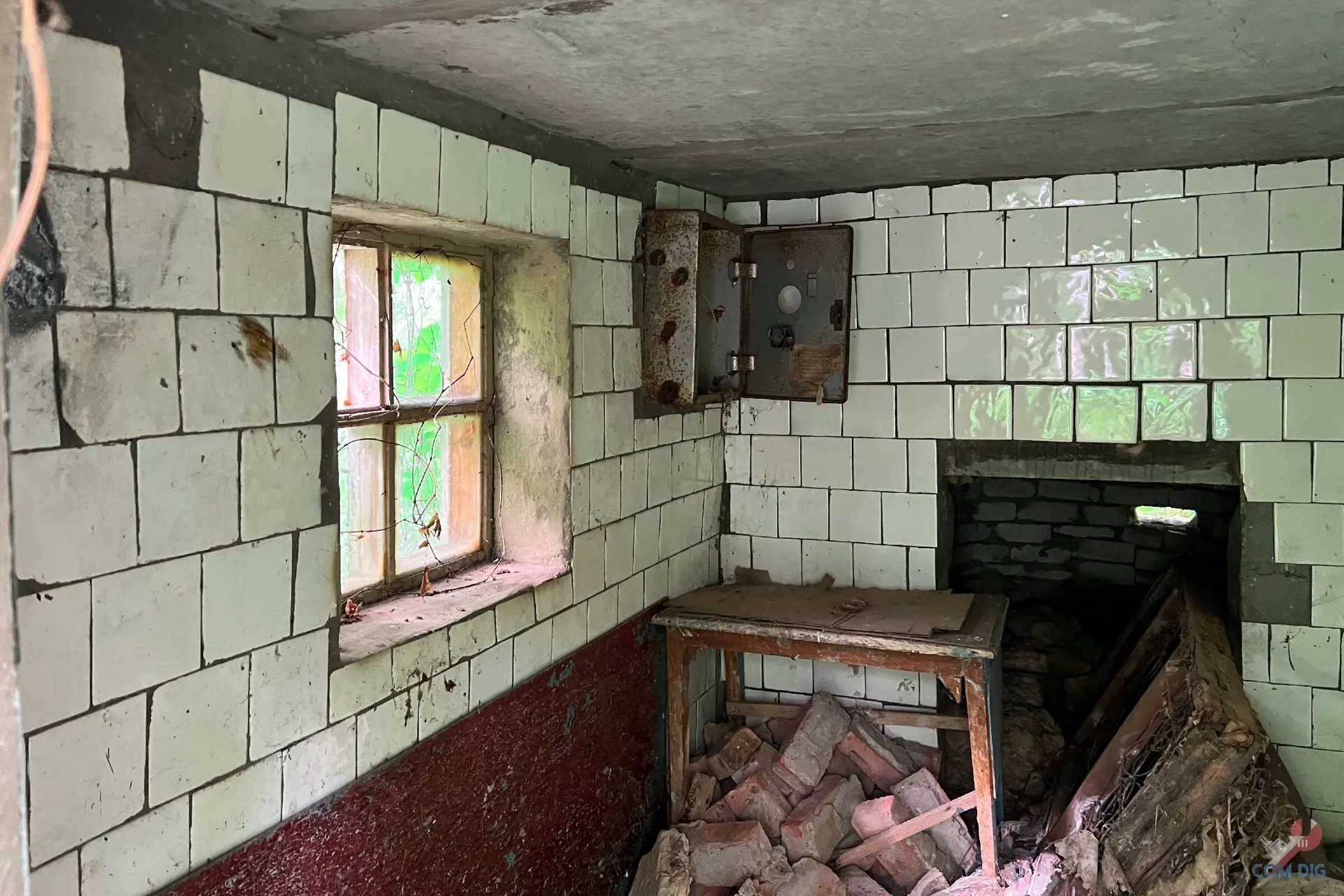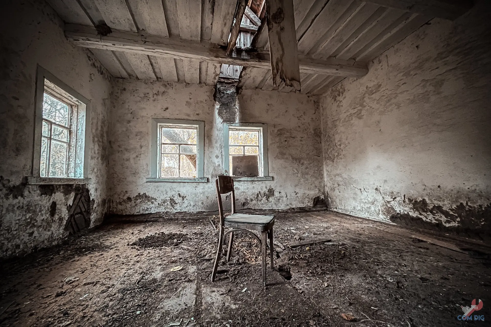 Внутри печальная картина. После того, как жители навсегда ушли из села, мародёры вынесли всё, что можно было унести. Остались только голые стены. Сюда вряд ли вернутся люди в ближайшие столетия.