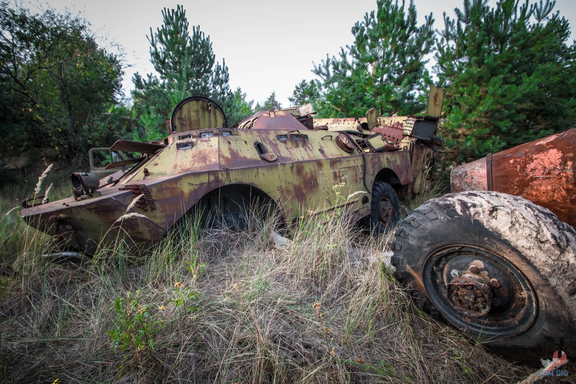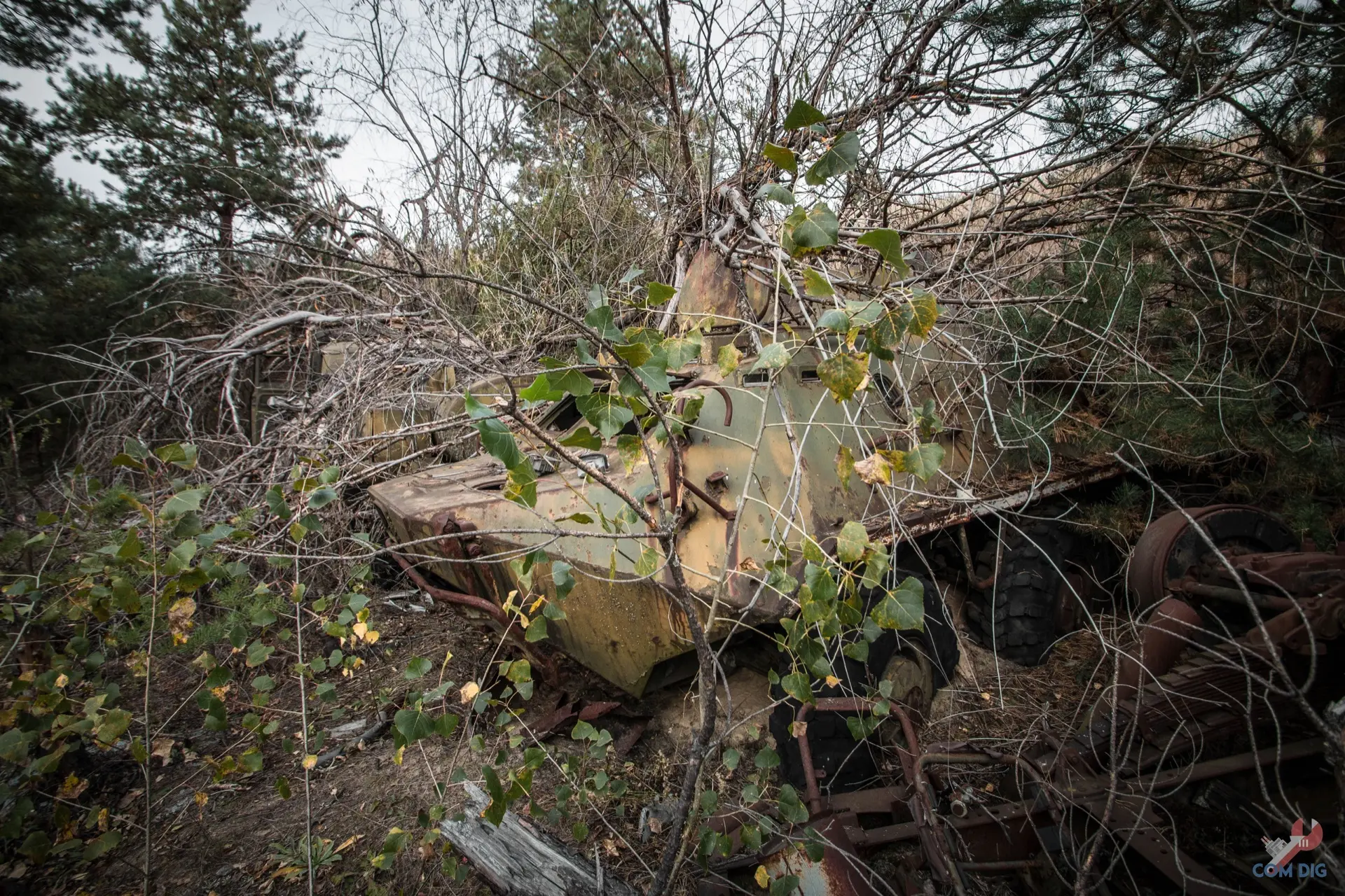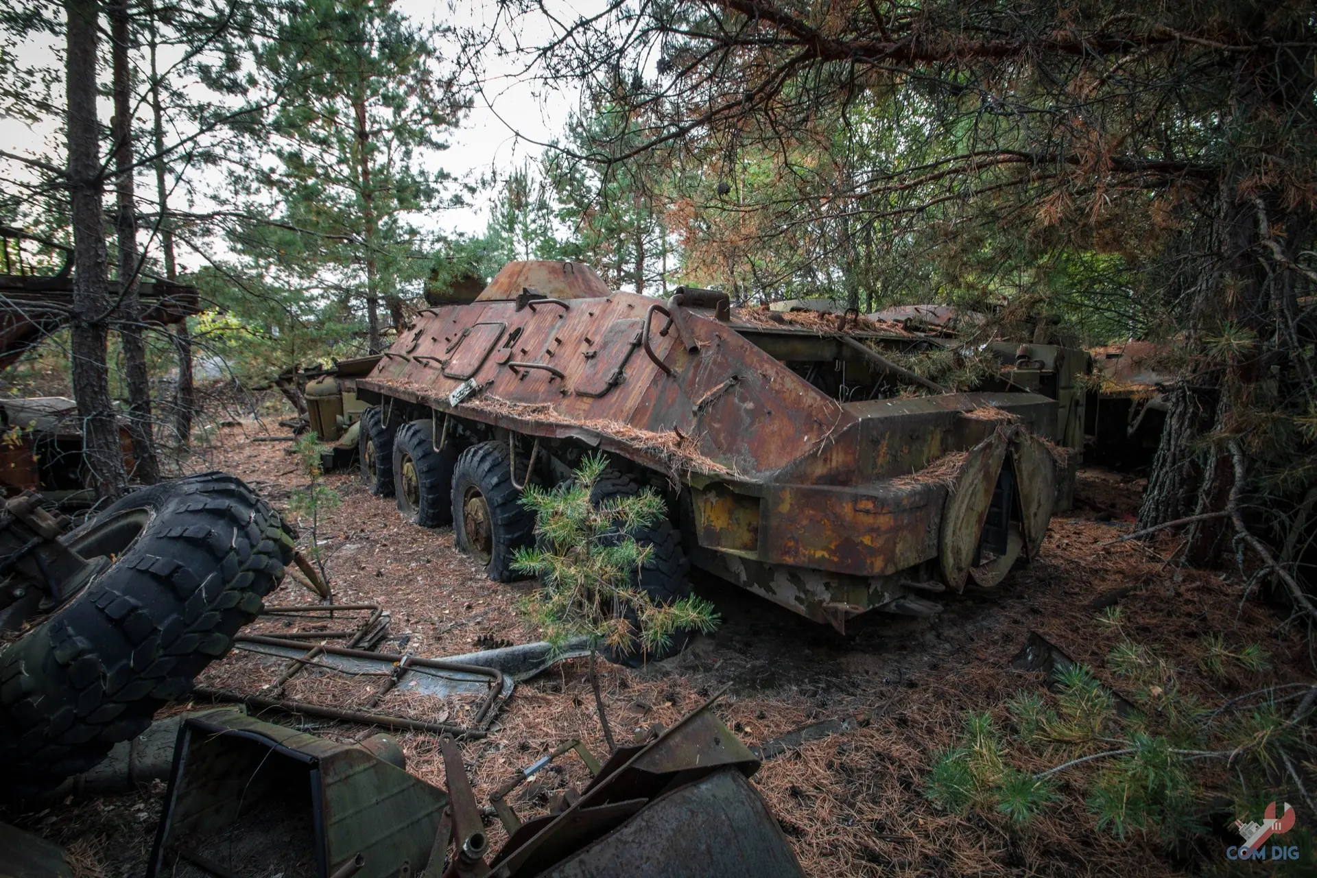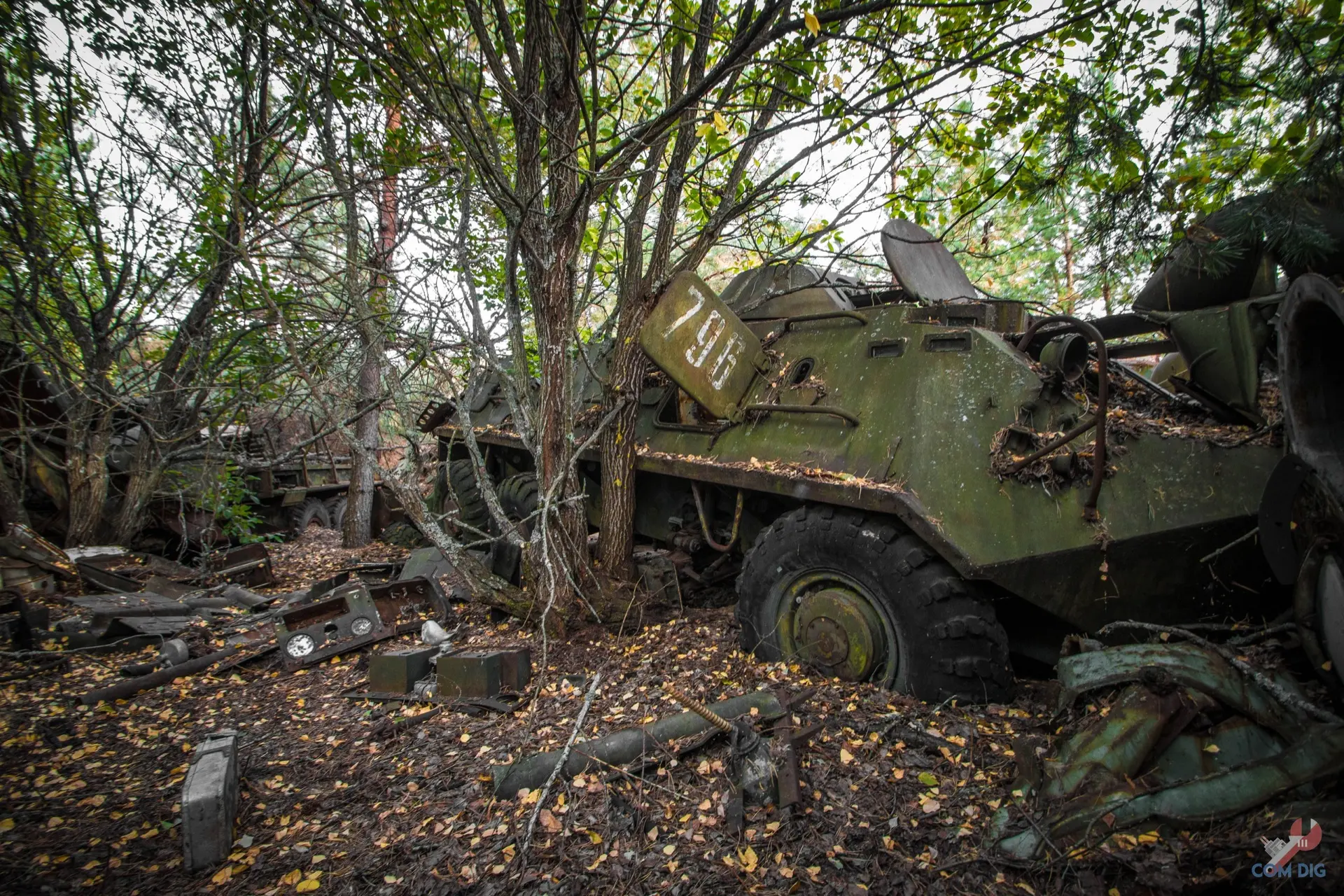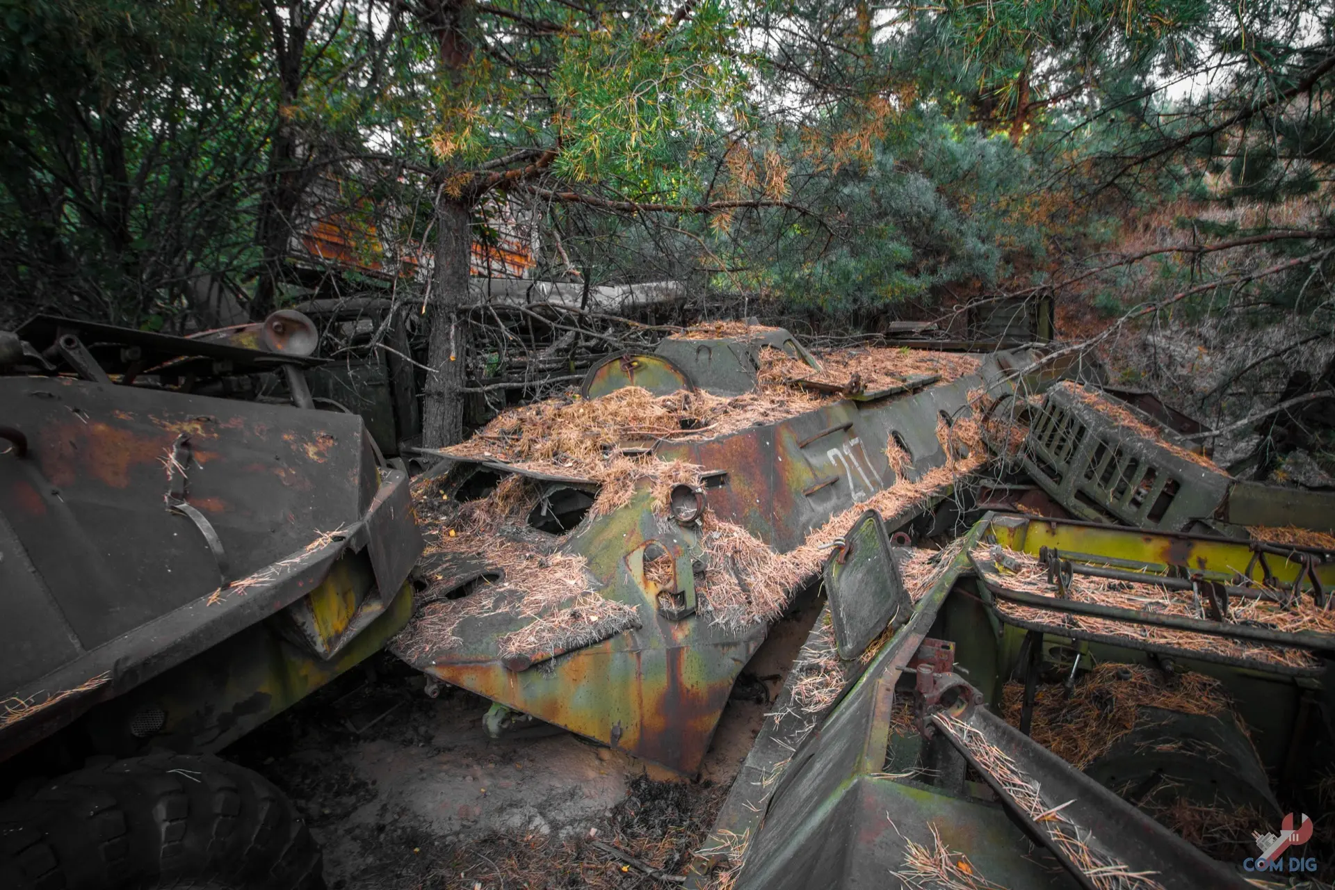 Недалеко от крупного отстойника радиоактивной техники «Буряковка» в Чернобыльской зоне есть небольшая поляна, затерянная в лесу. На ней разбросано множество единиц колёсной техники, от грузовиков до бронетранспортёров.