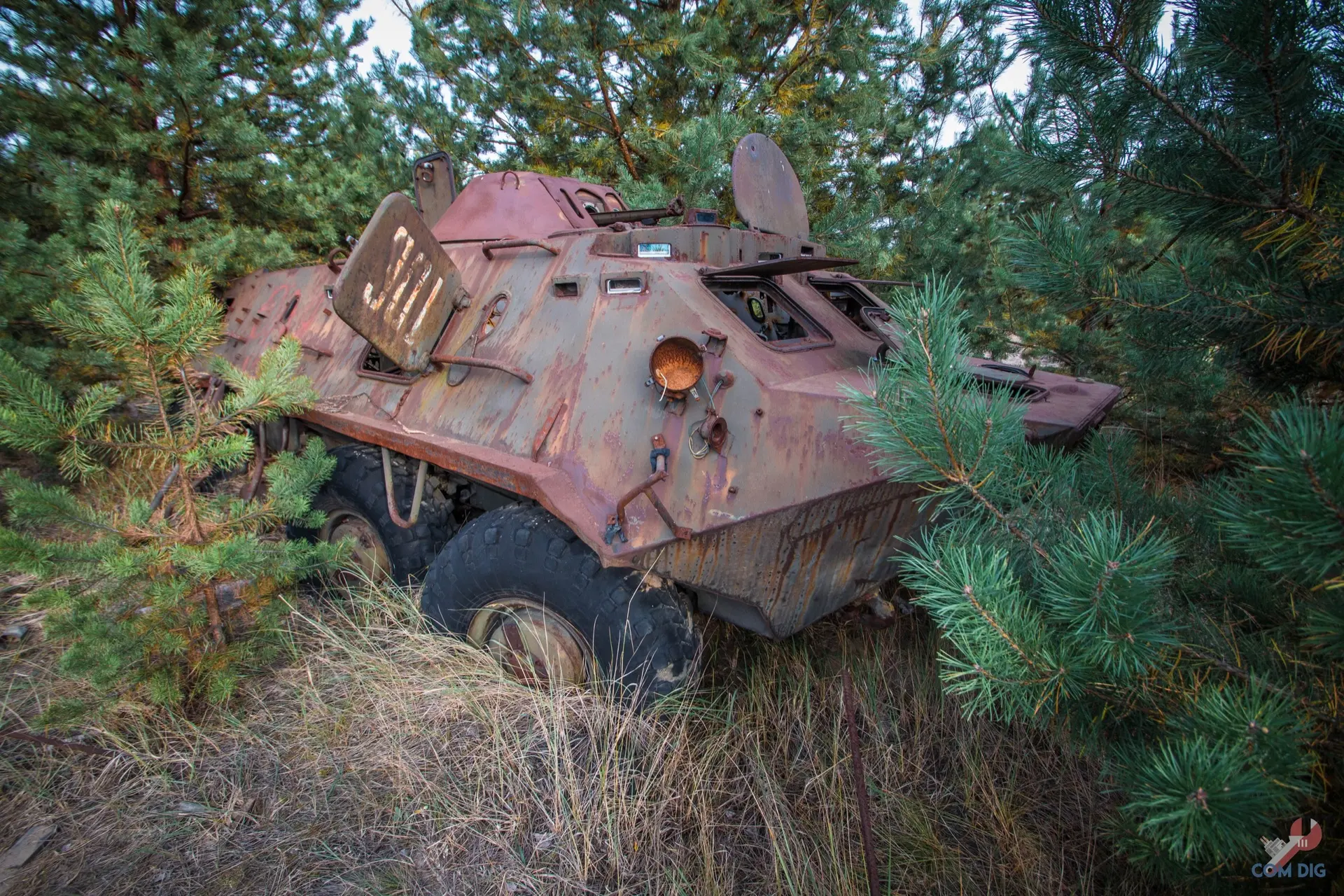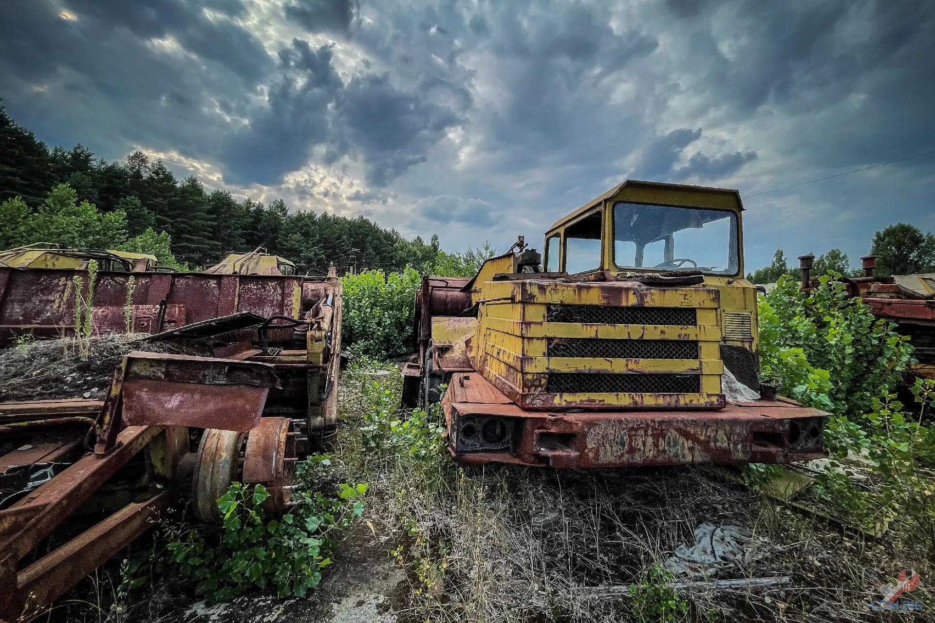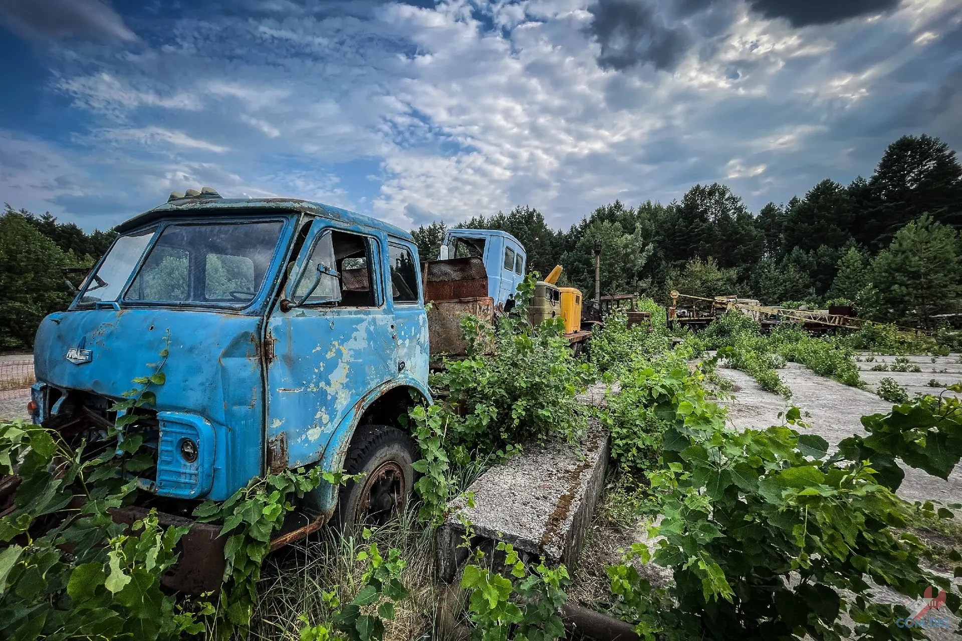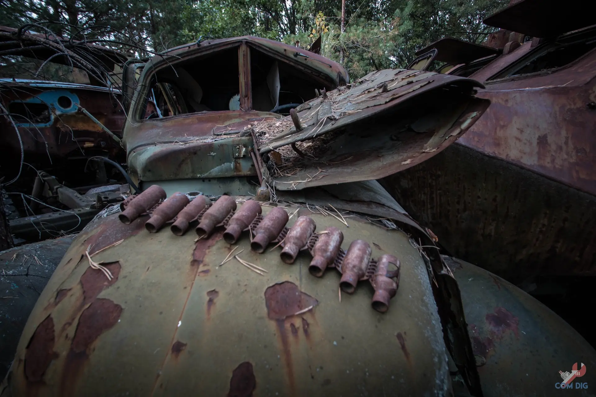 Недалеко от крупного отстойника радиоактивной техники «Буряковка» в Чернобыльской зоне есть небольшая поляна, затерянная в лесу. На ней разбросано множество единиц колёсной техники, от грузовиков до бронетранспортёров.