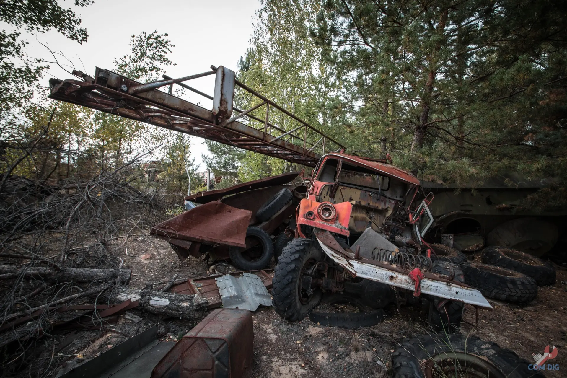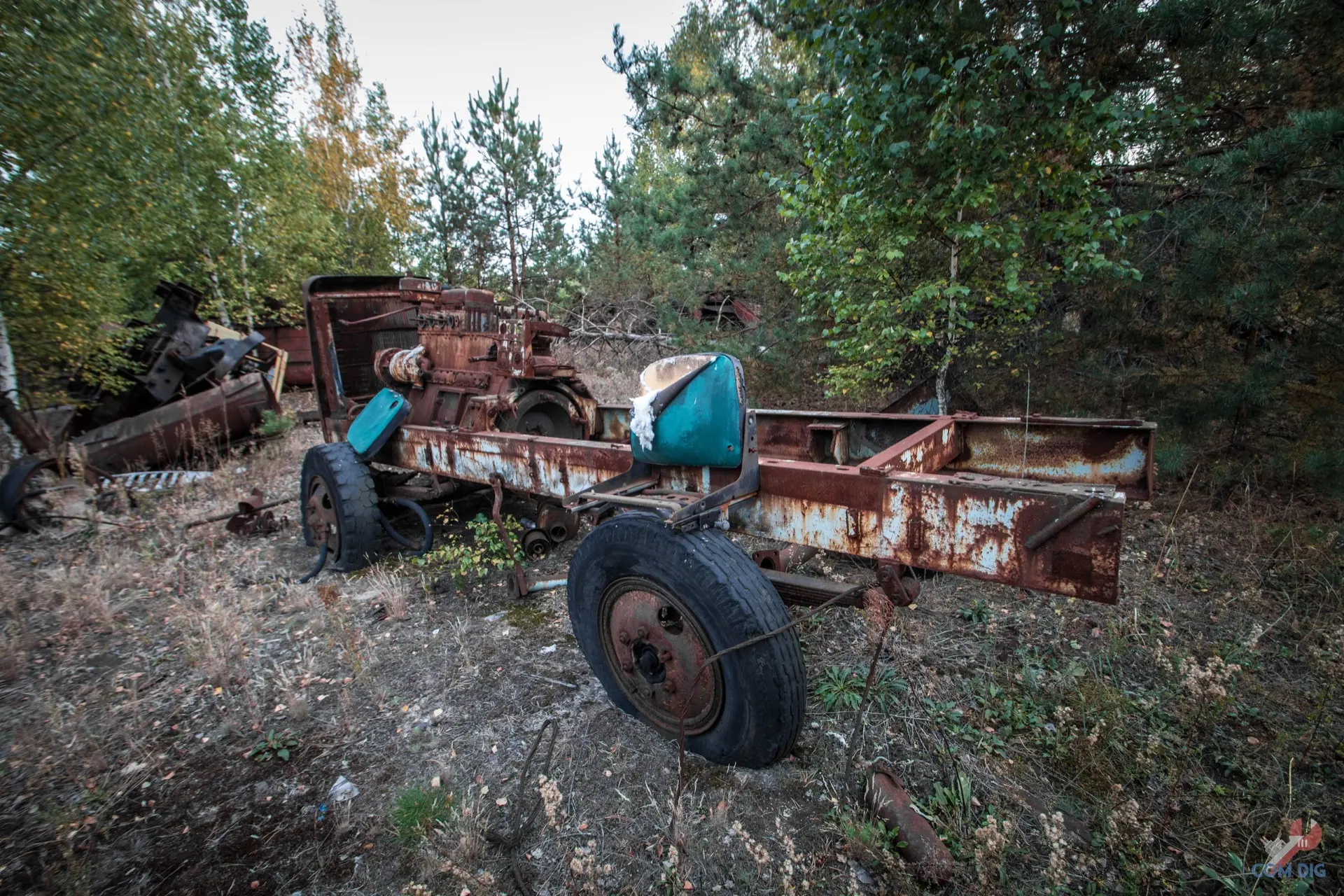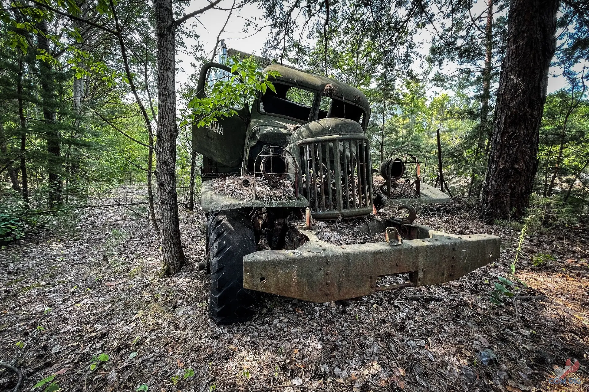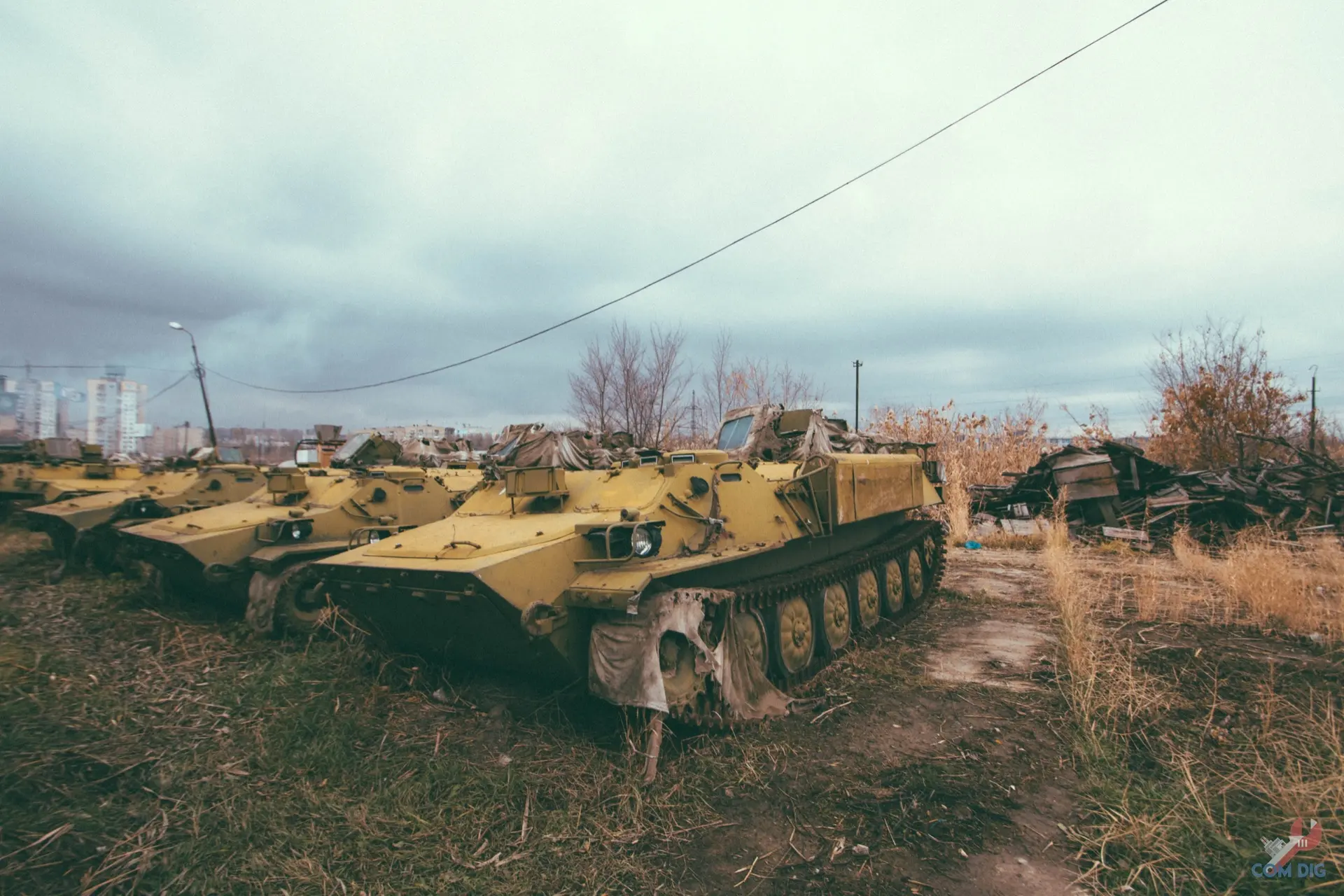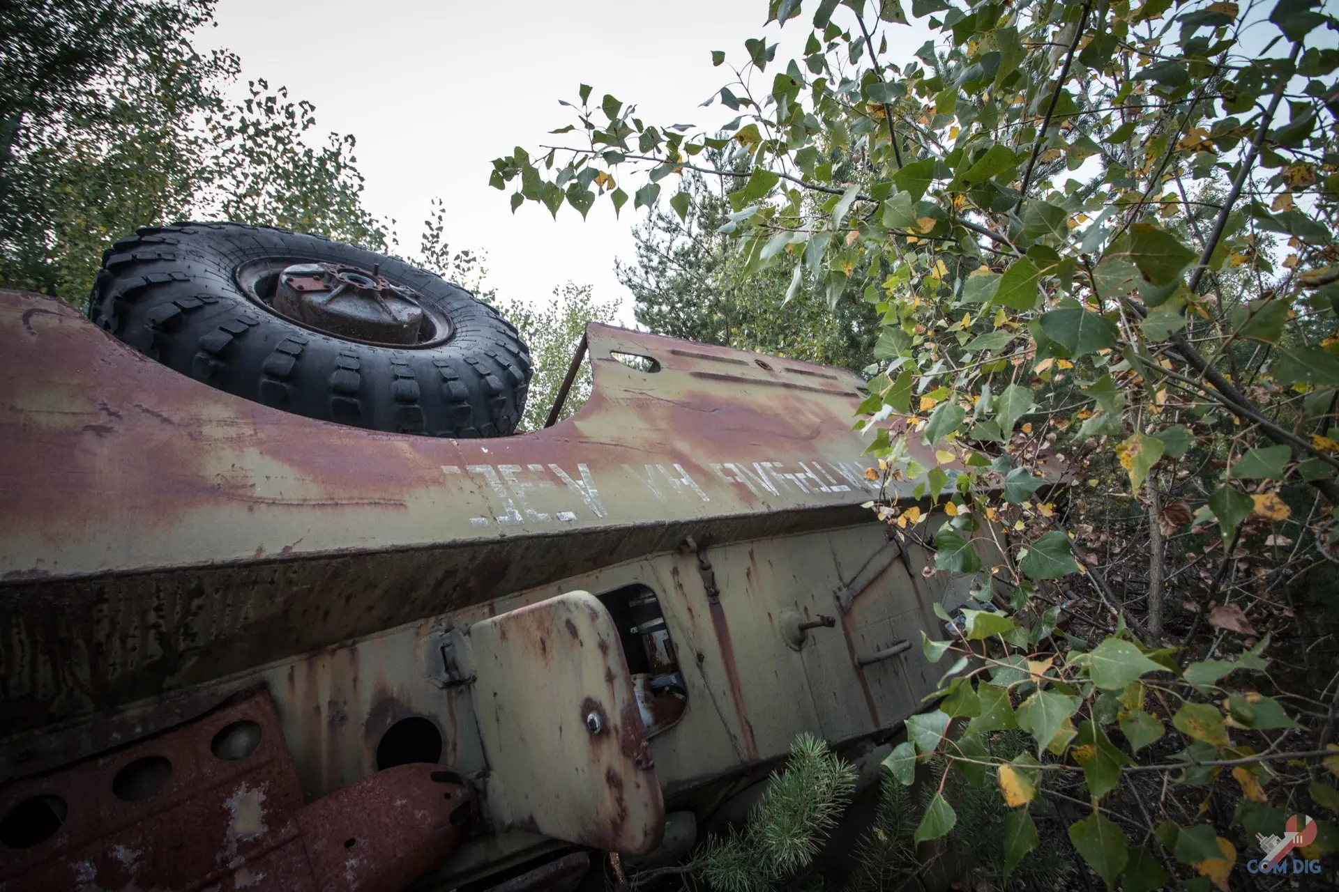 Недалеко от крупного отстойника радиоактивной техники «Буряковка» в Чернобыльской зоне есть небольшая поляна, затерянная в лесу. На ней разбросано множество единиц колёсной техники, от грузовиков до бронетранспортёров.