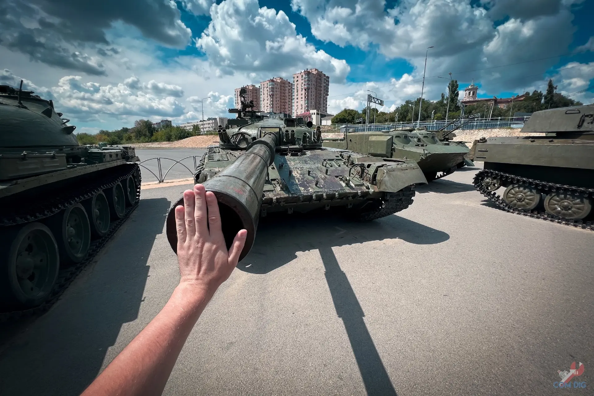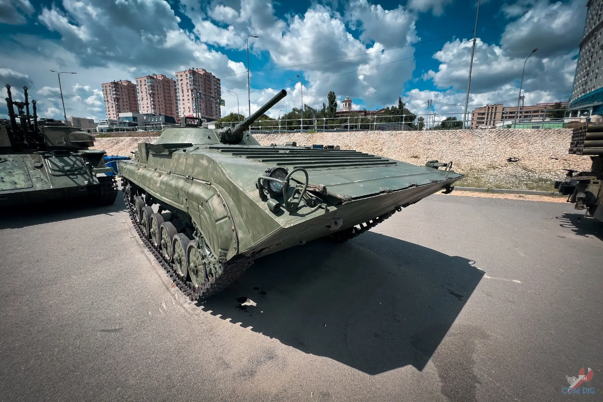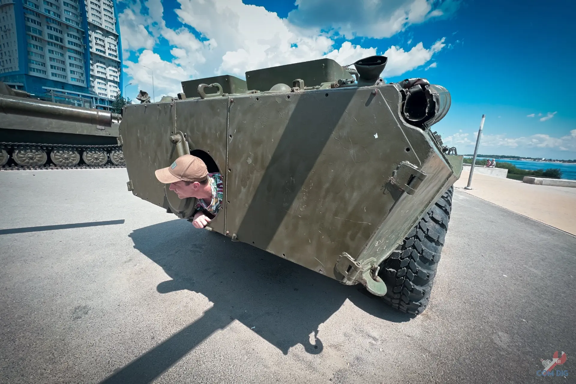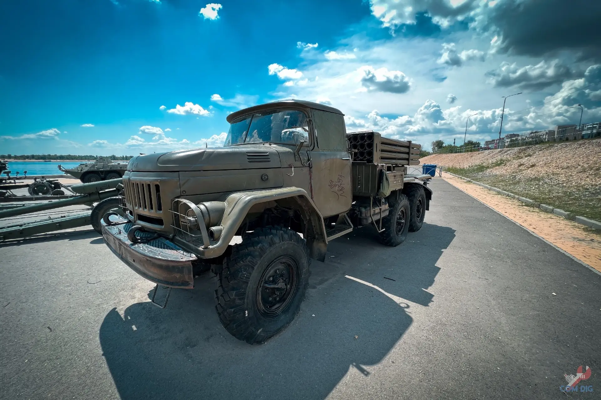 Прямо на Волгоградской набережной есть стоянка военной техники. Машины стоят хаотично, без табличек, названий или намёка на официальную экспозицию. Но присмотреться стоит!