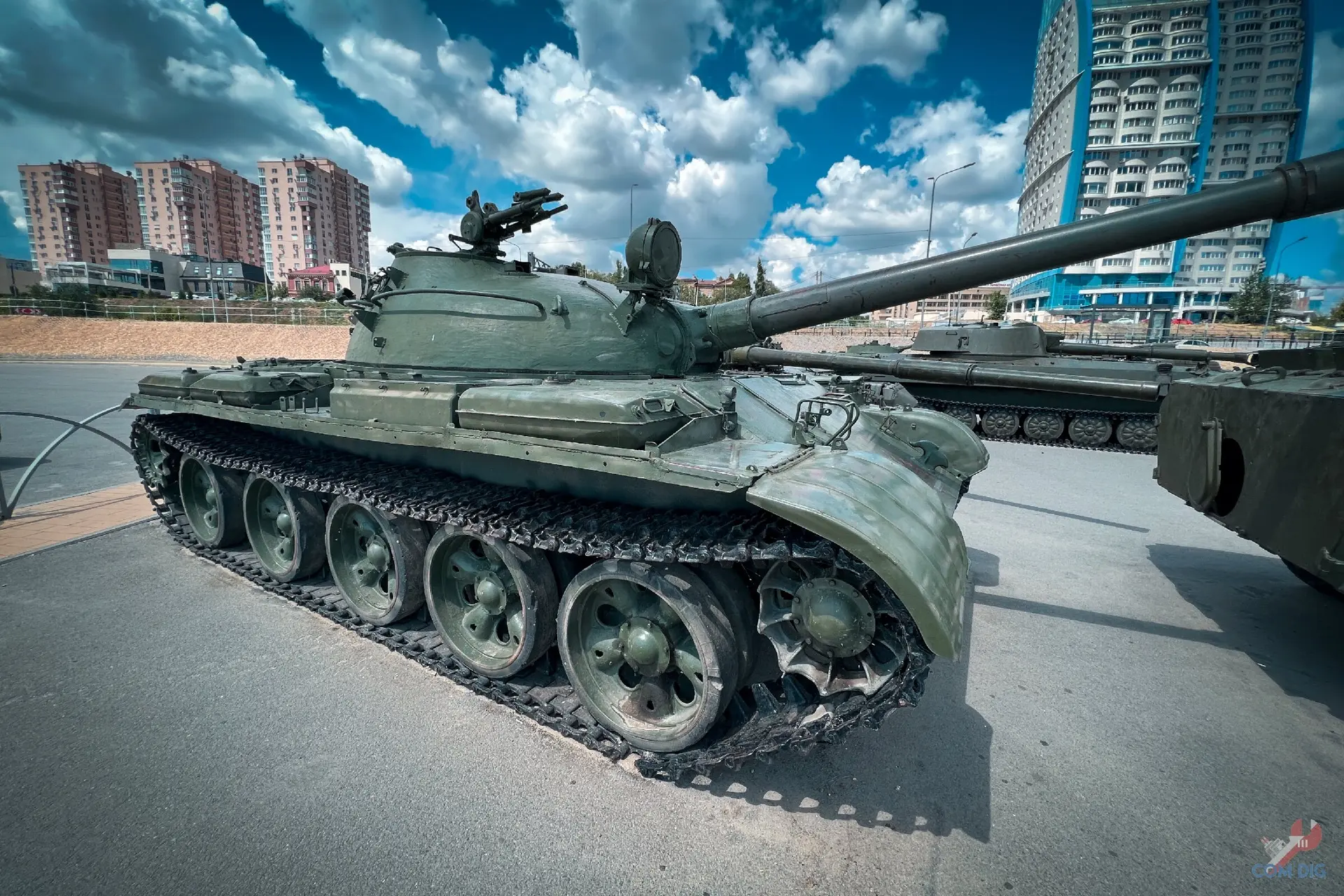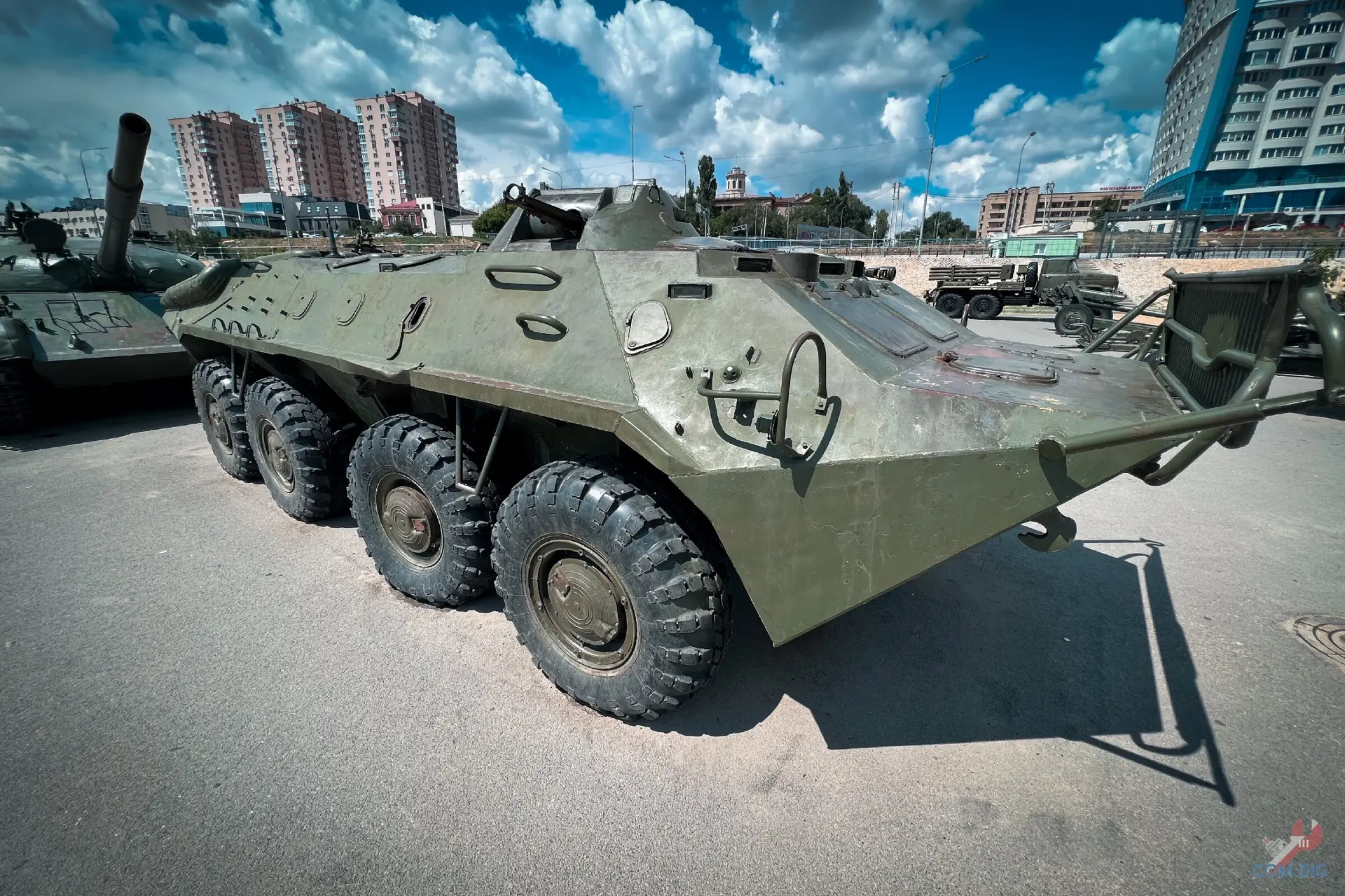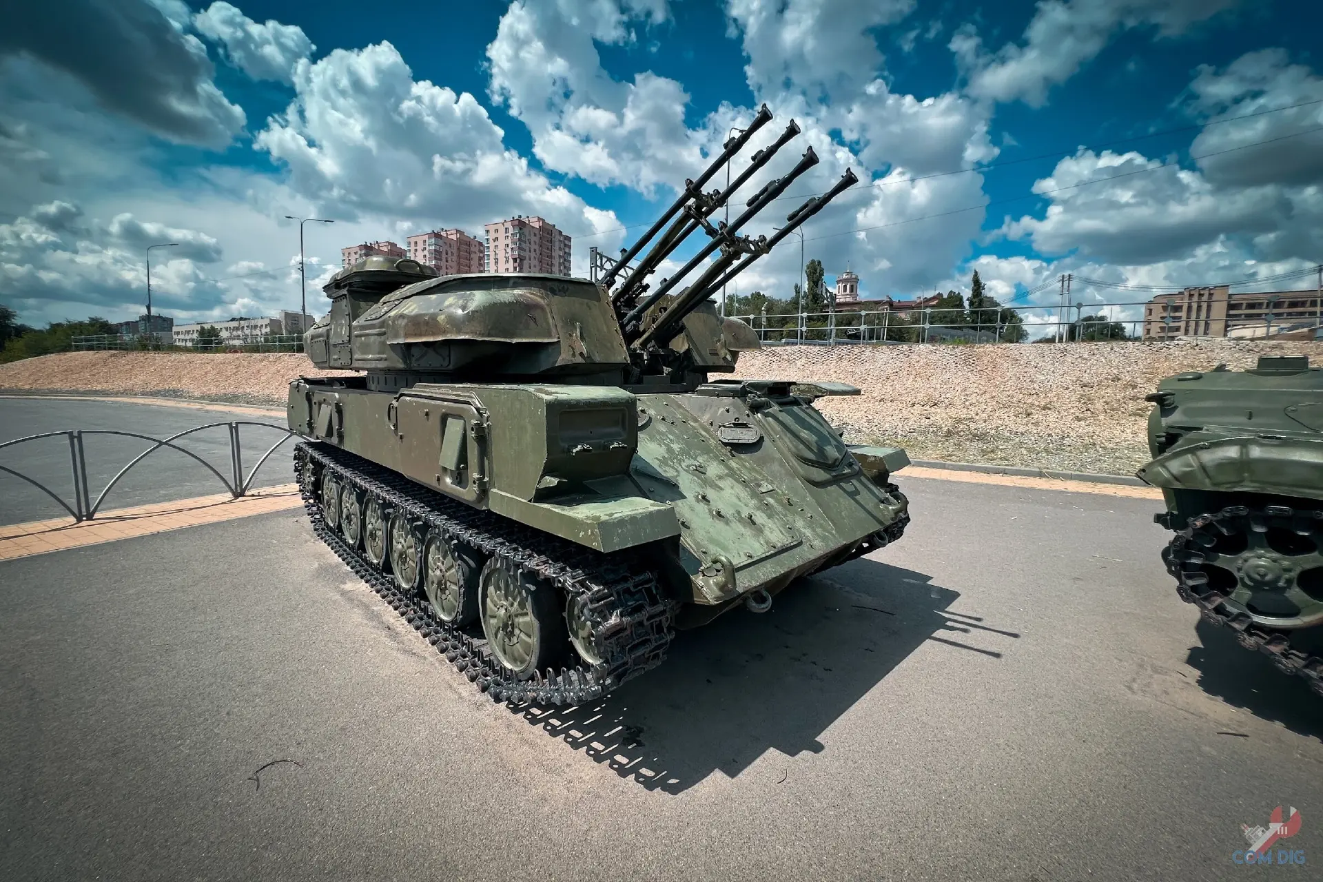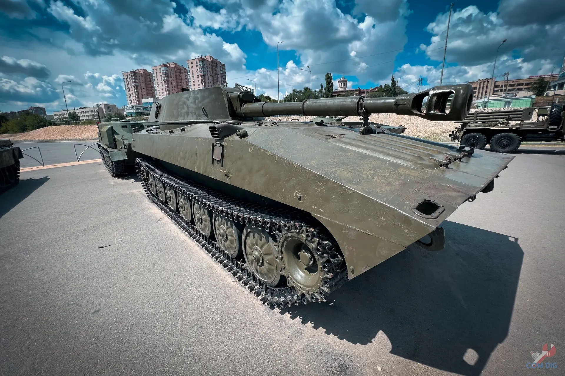 Прямо на Волгоградской набережной есть стоянка военной техники. Машины стоят хаотично, без табличек, названий или намёка на официальную экспозицию. Но присмотреться стоит!