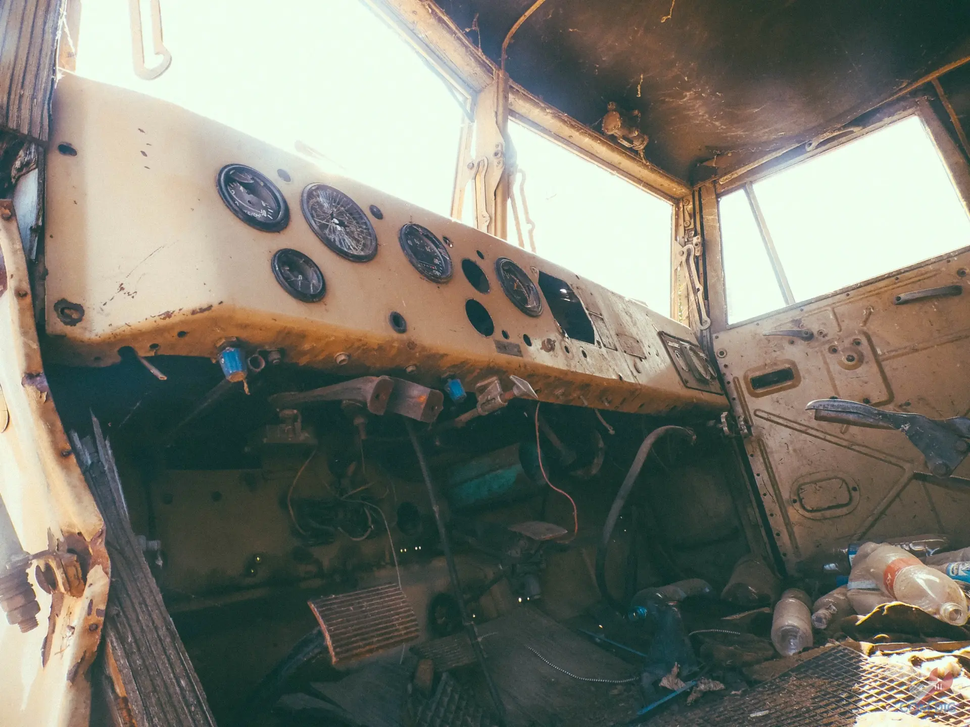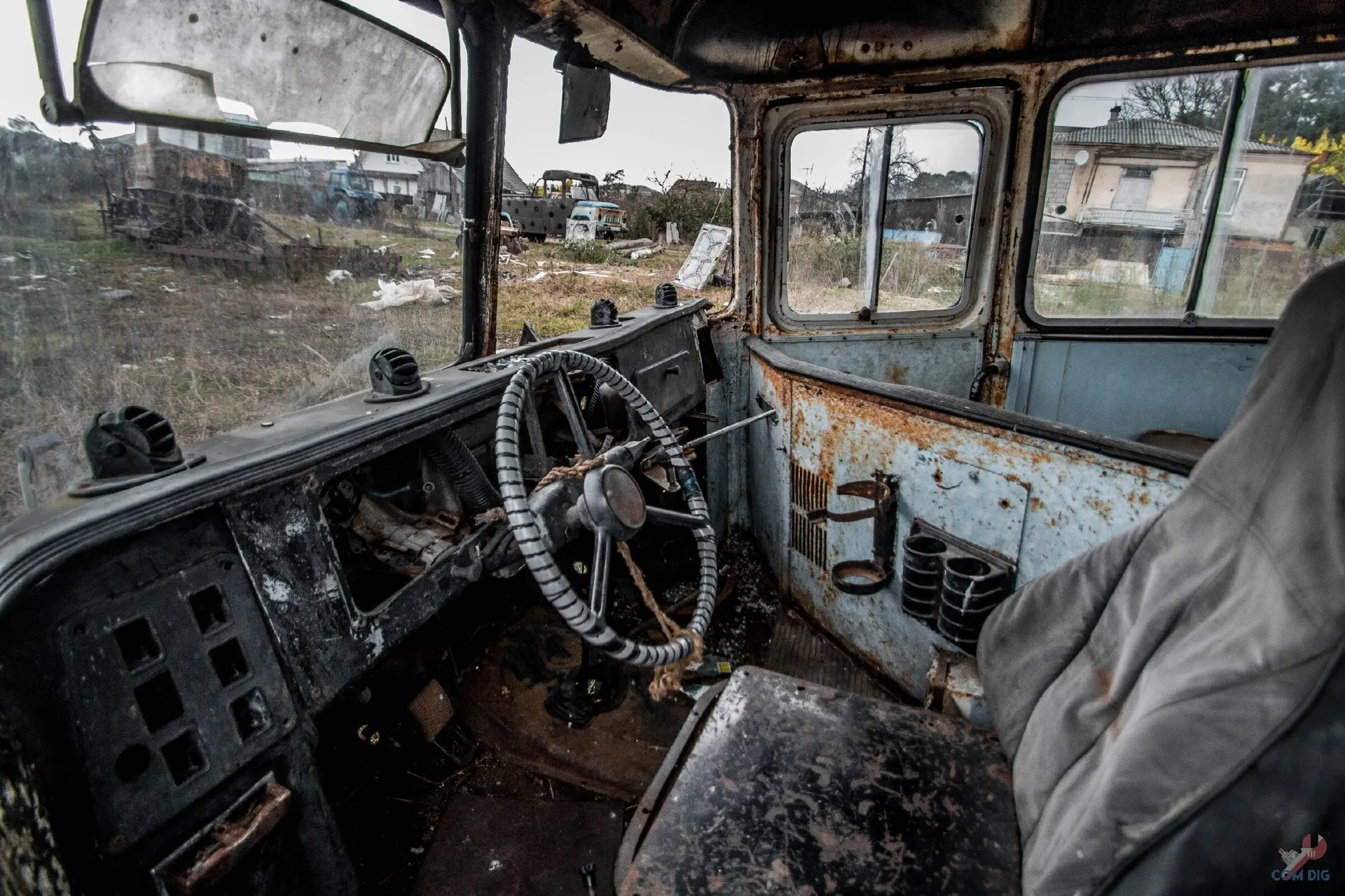 К некоторым машинам удалось подойти вплотную и даже заглянуть в кабины. На фото, например, кабина КрАЗа. Сохранились руль и часть приборов. По чернобыльским меркам, состояние ещё ничего. В других туристических местах такие детали уже давно бы сорвали на сувениры.